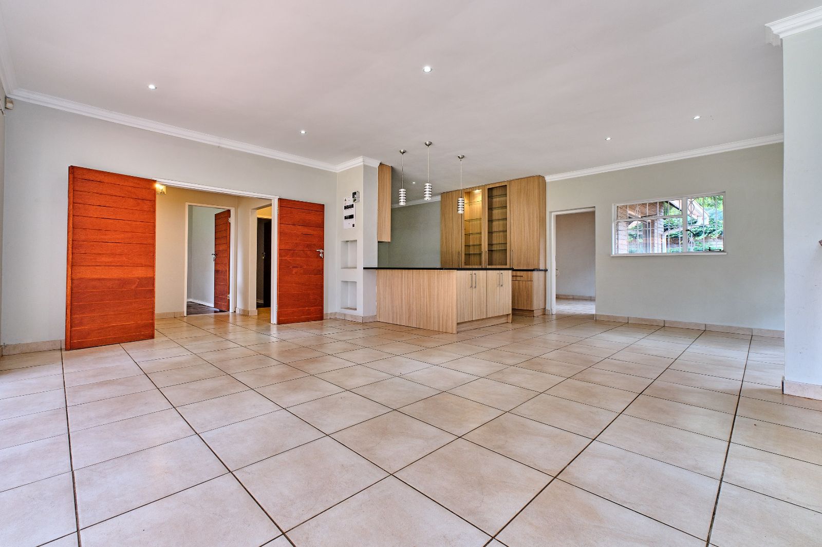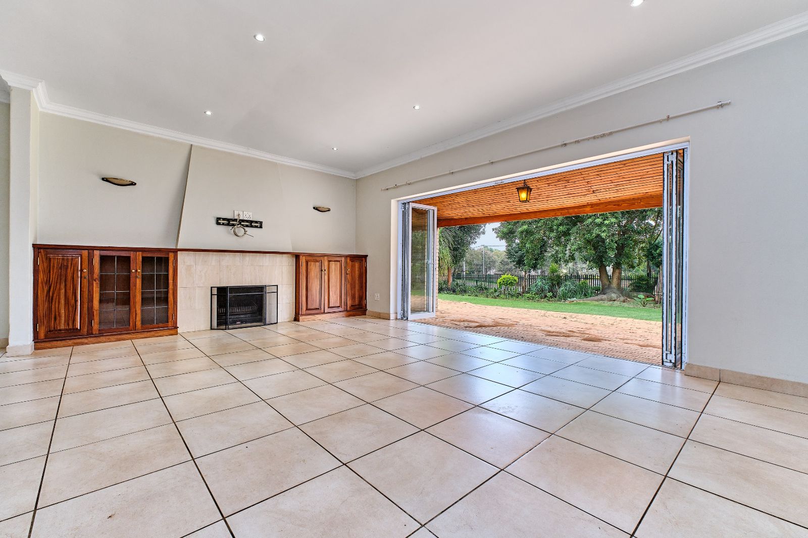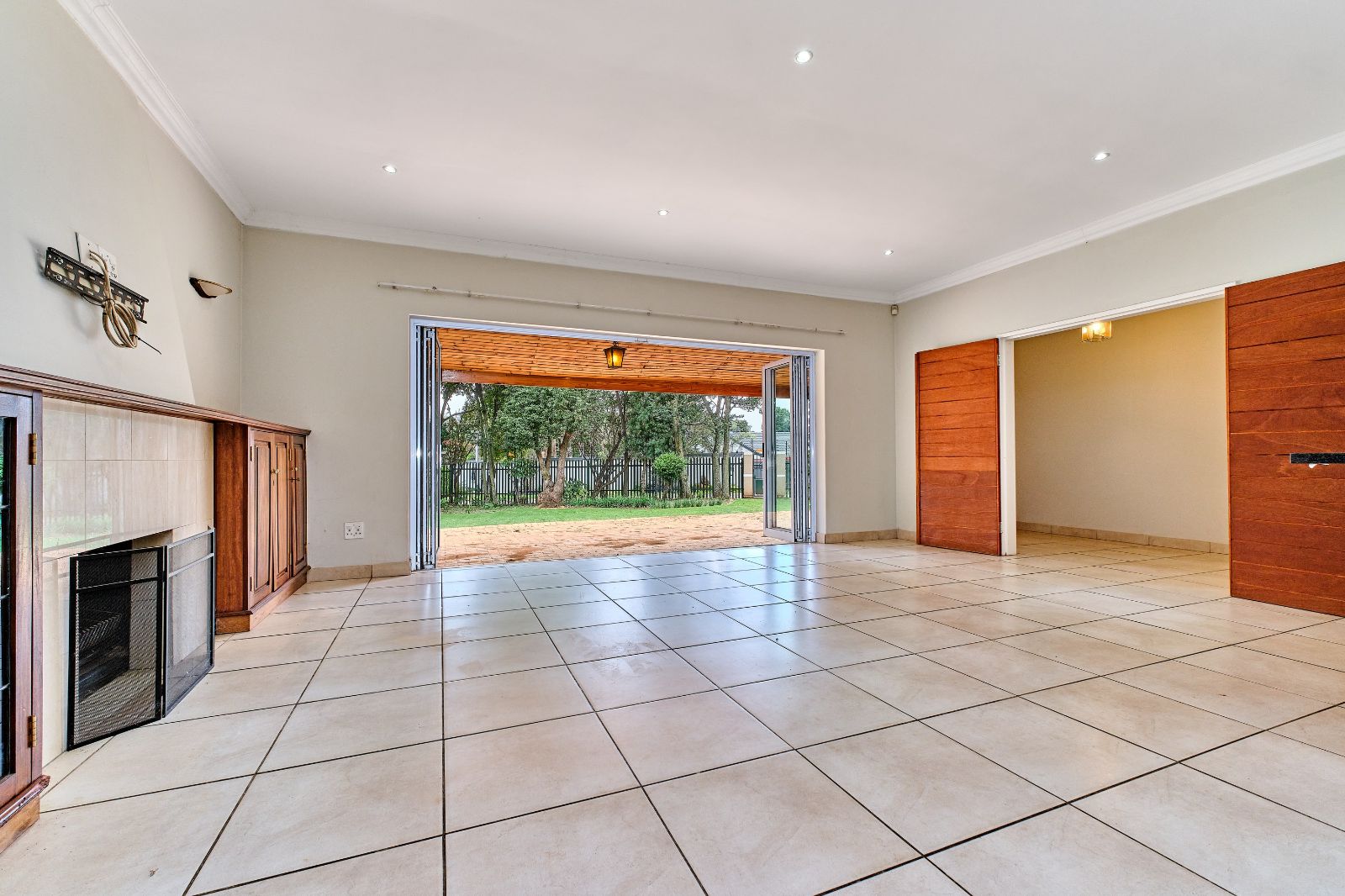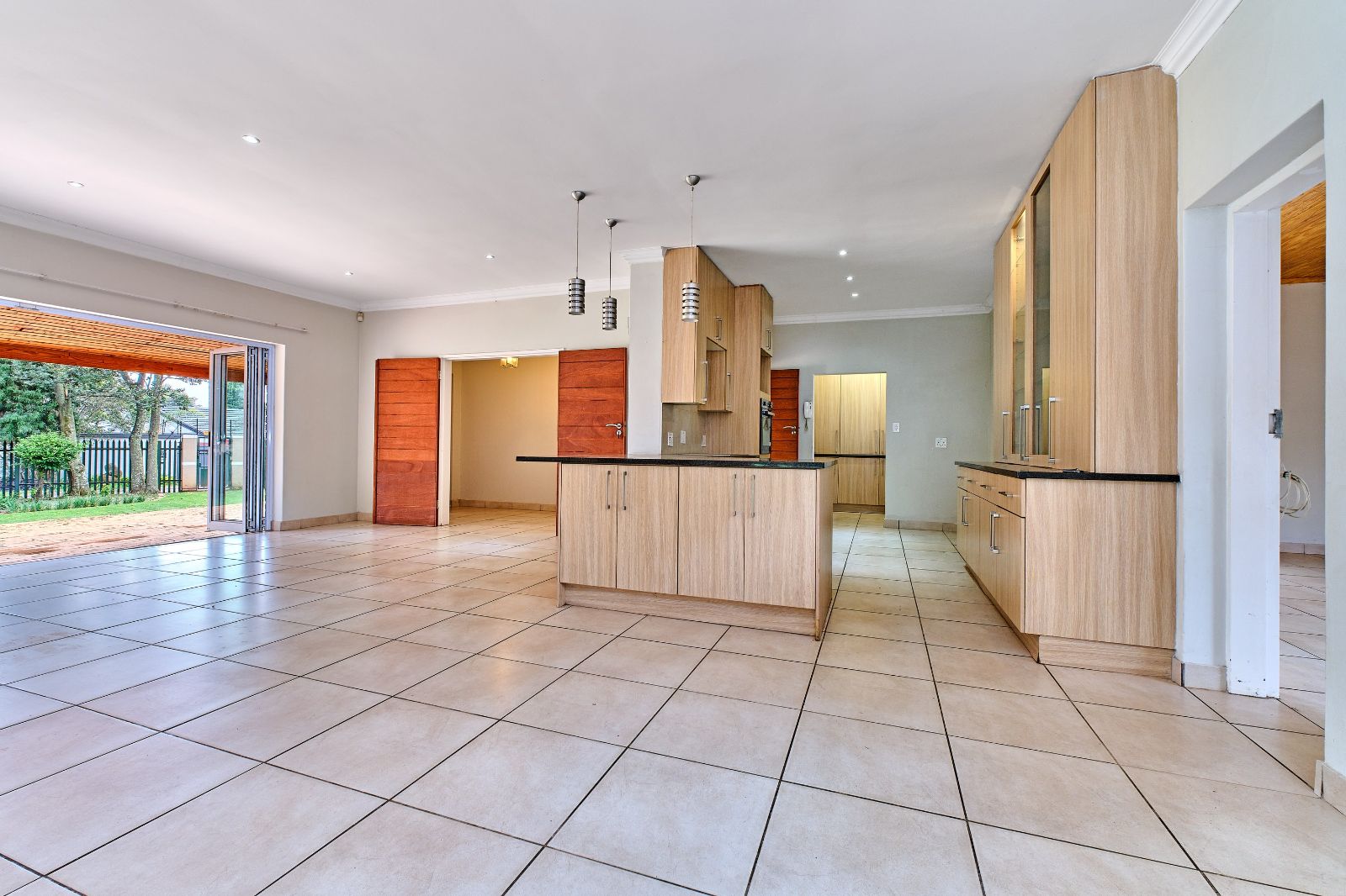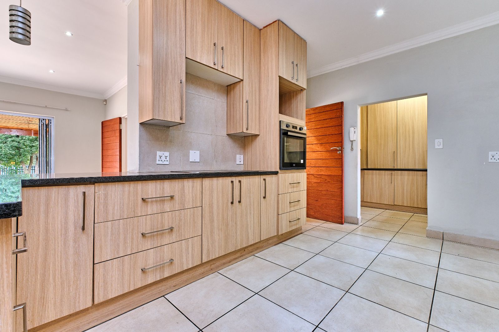 Spacious and sunny open-plan lounge, dining room, and kitchen. The kitchen offers ample cupboard space, granite tops, and a scullery. Enjoy entertaining whilst cooking! A separate family room leading from the open plan living areas, slides to a pizza oven and built-in braai.