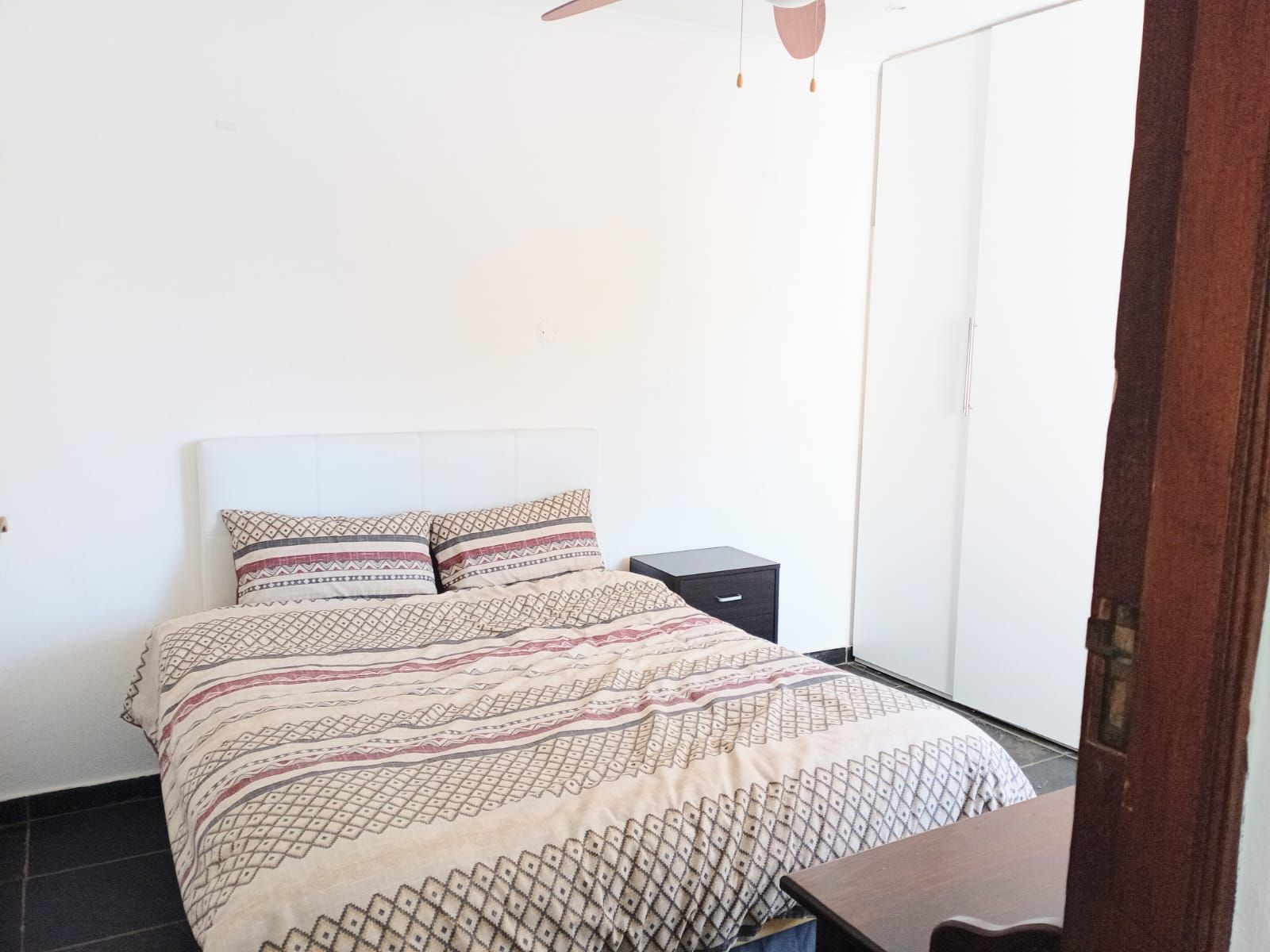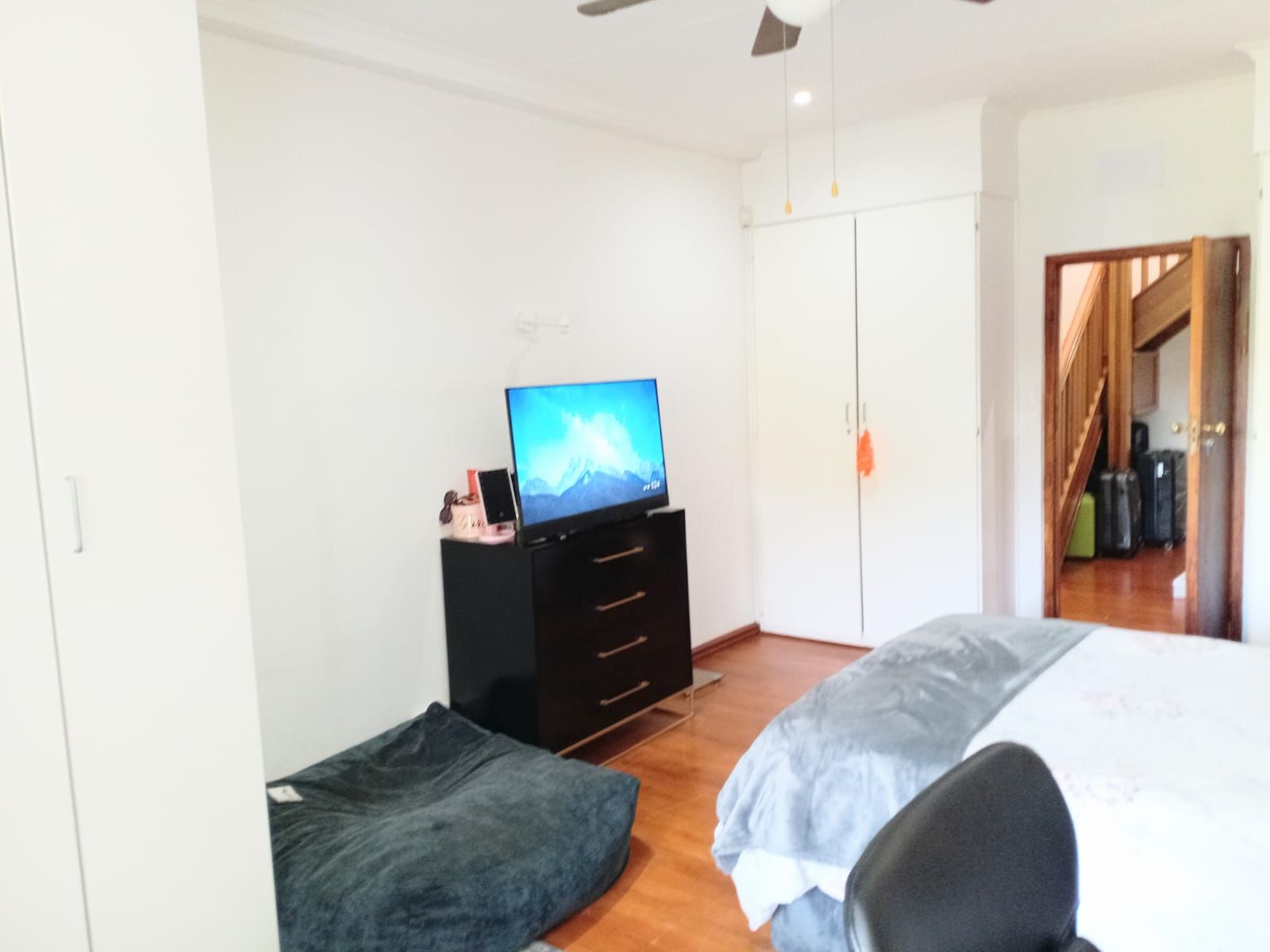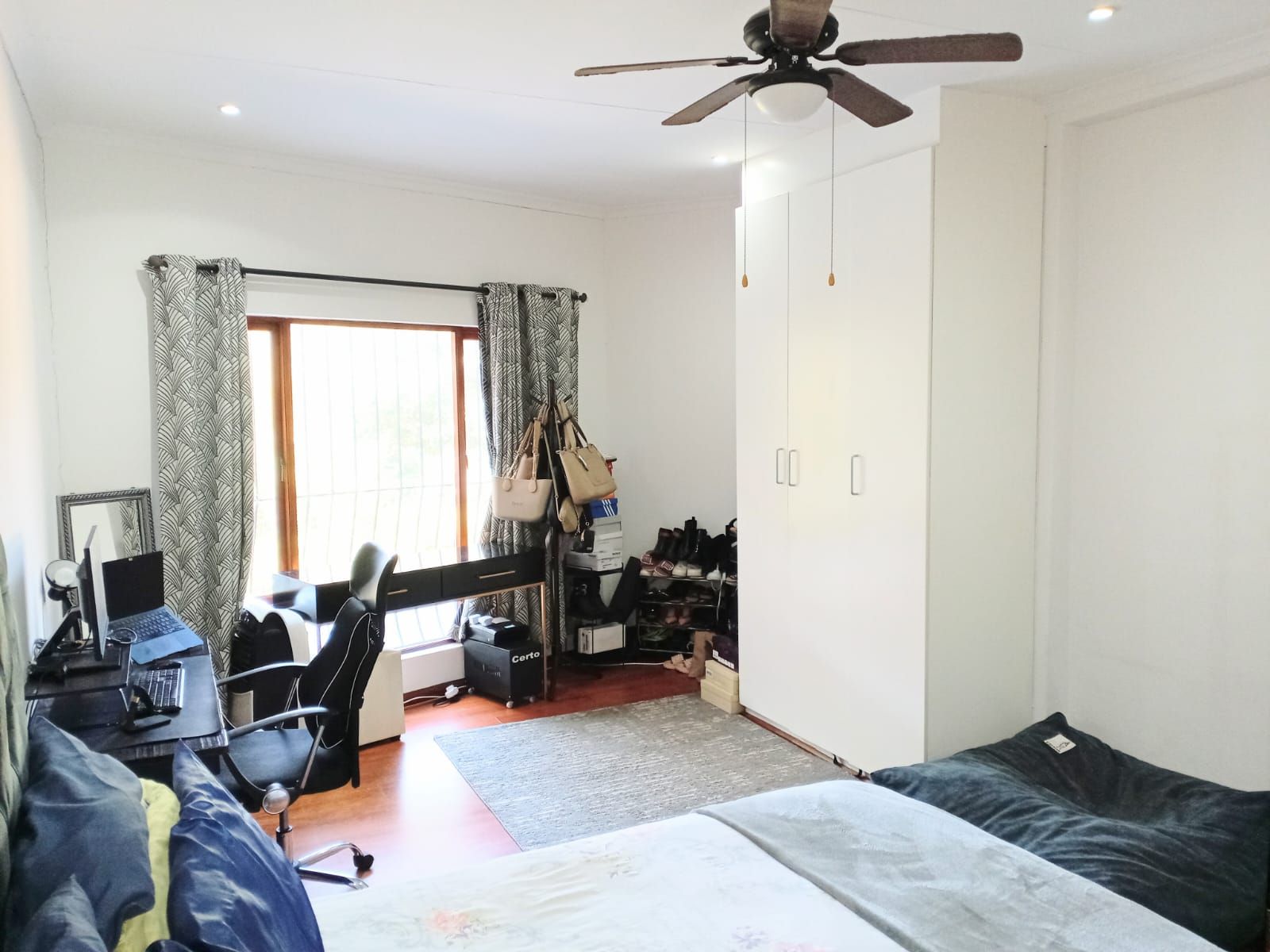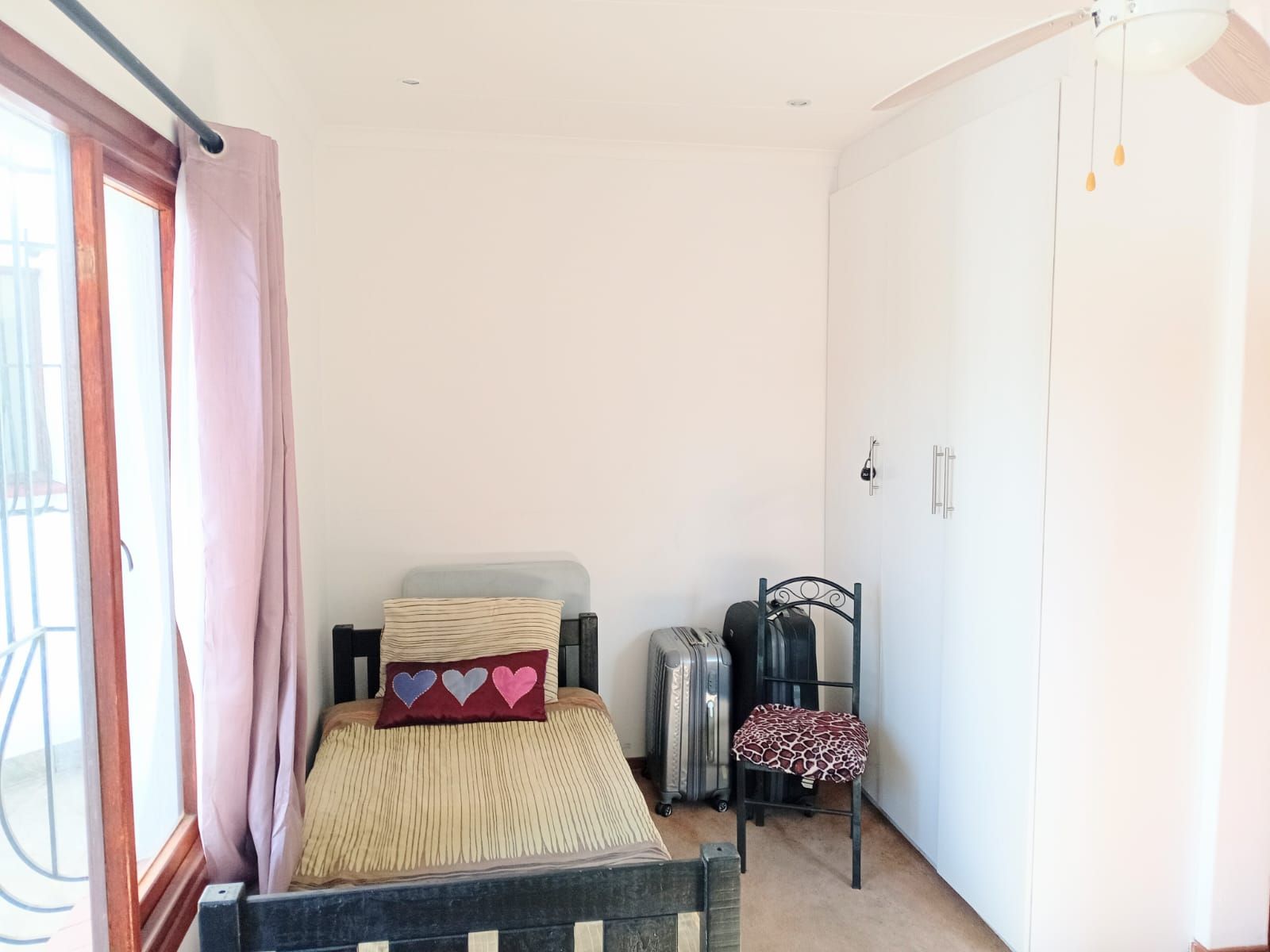 Bedroom 3: Massive space with fan, wooden window frames, and a full bathroom across the hallway