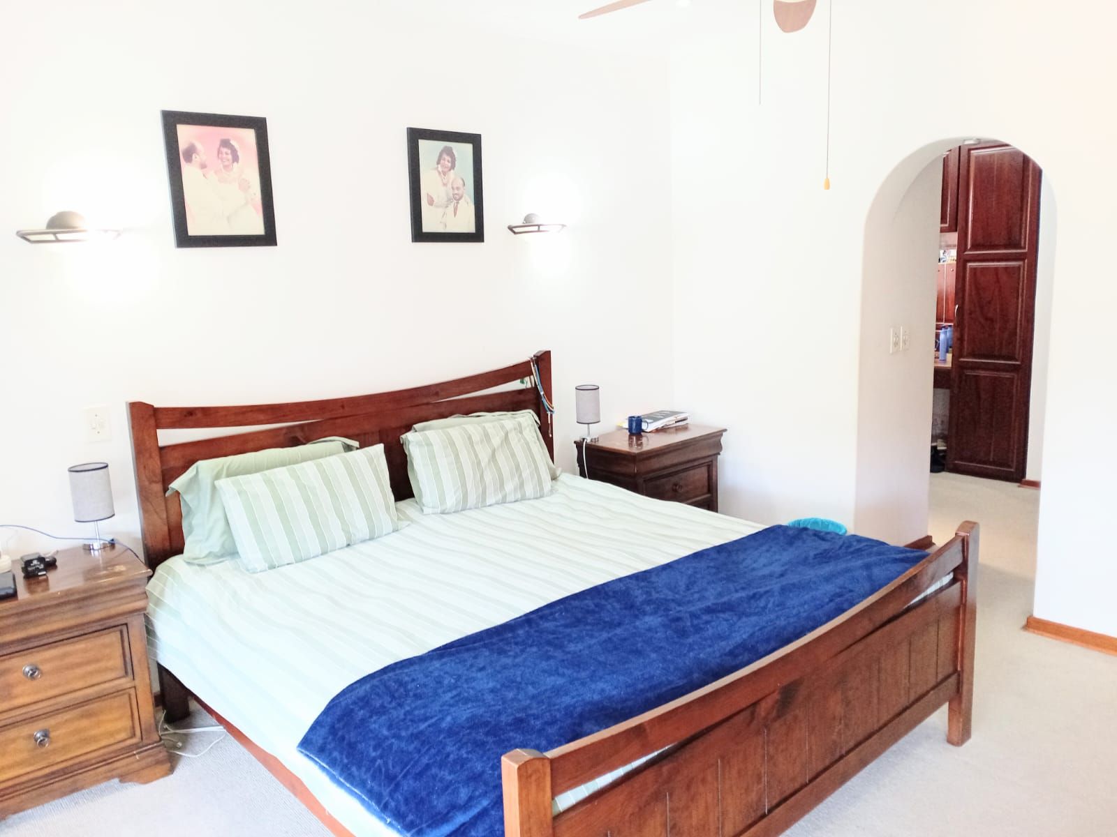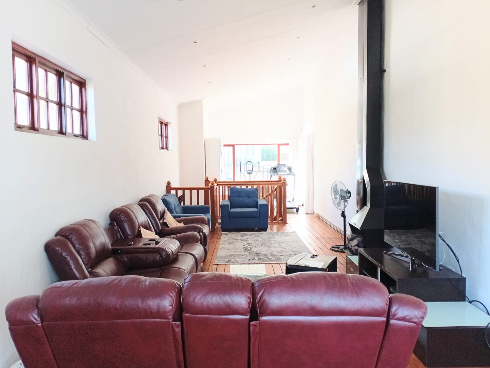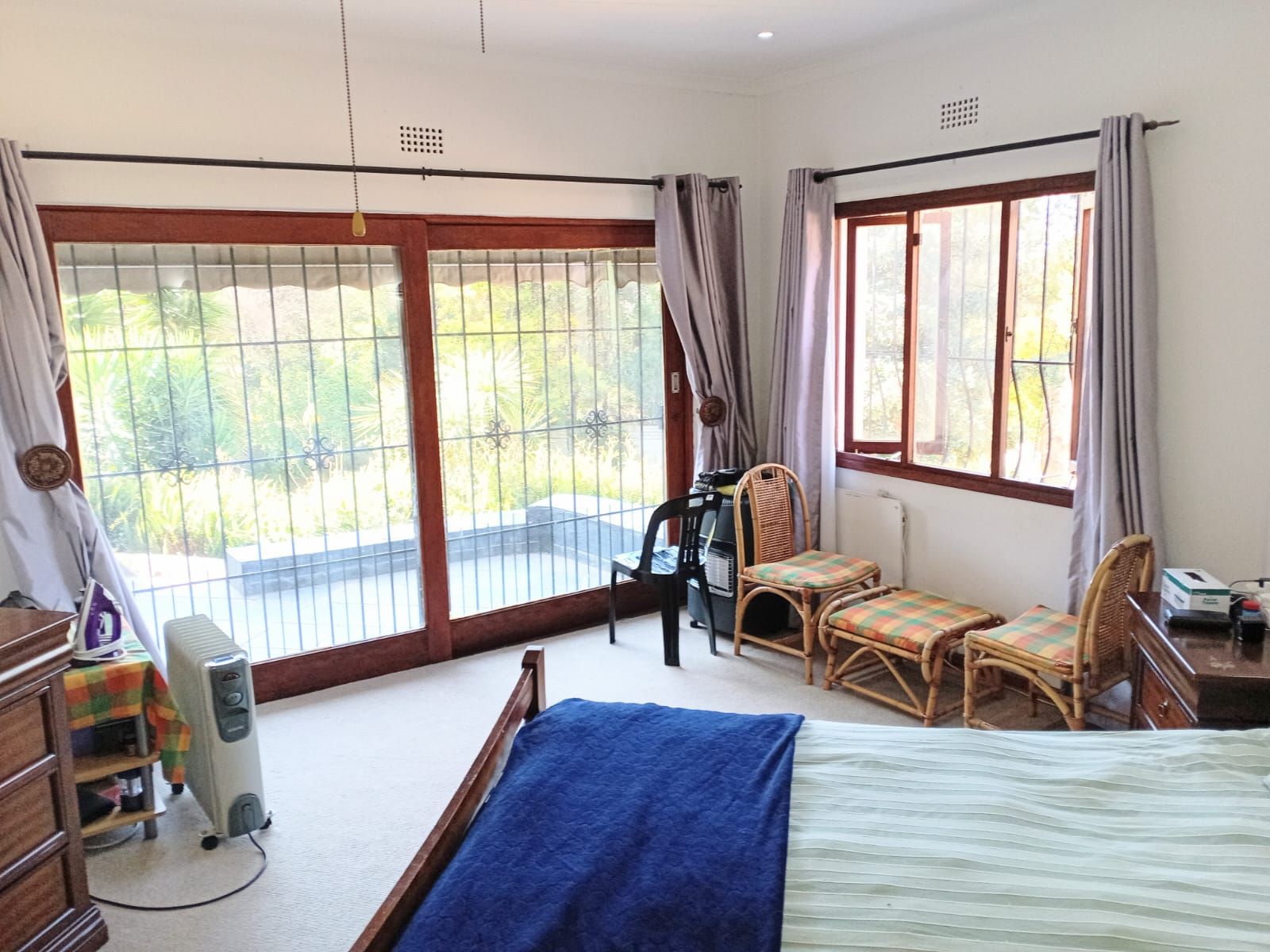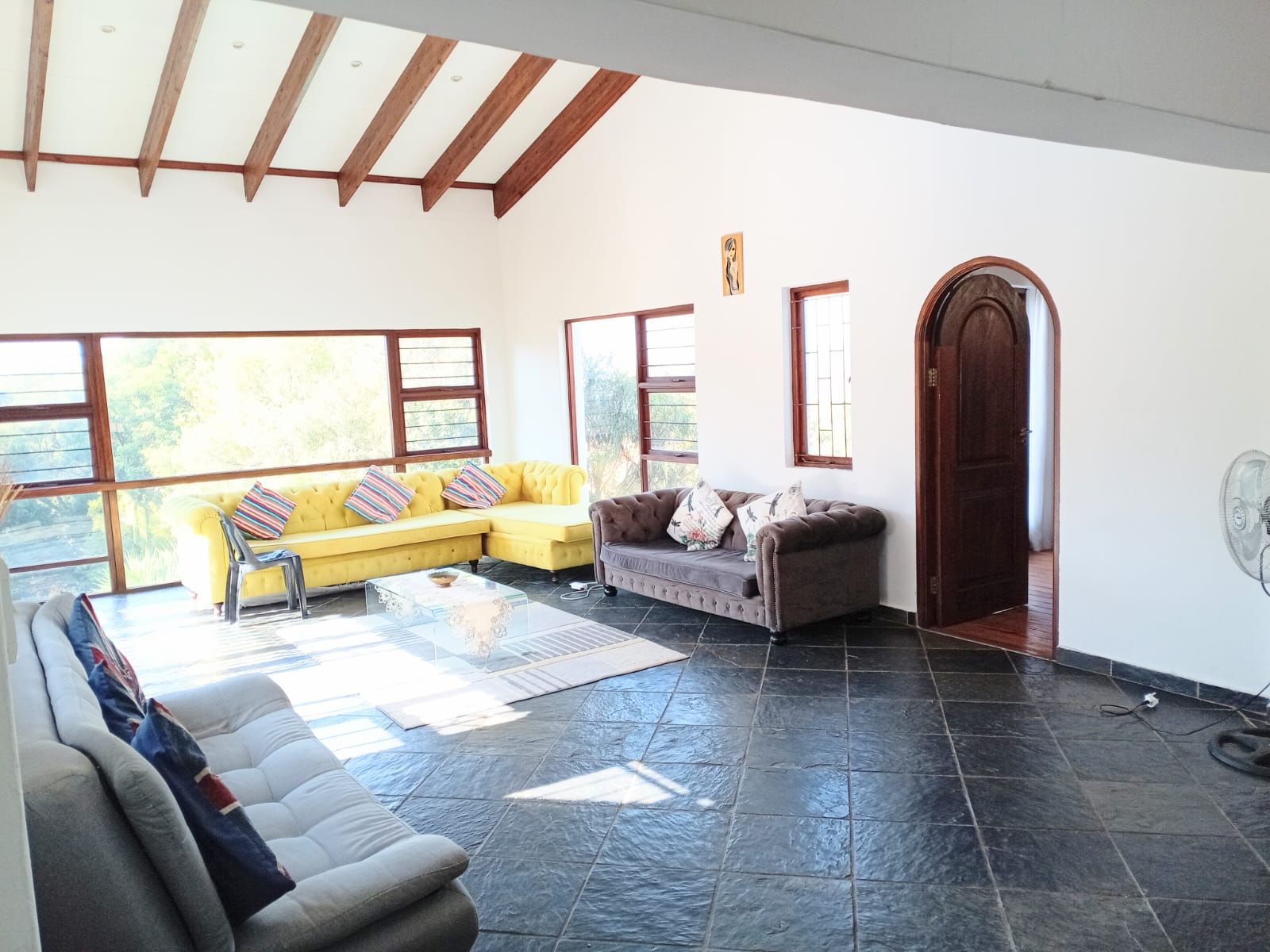 Bedroom 3: Massive space with fan, wooden window frames, and a full bathroom across the hallway