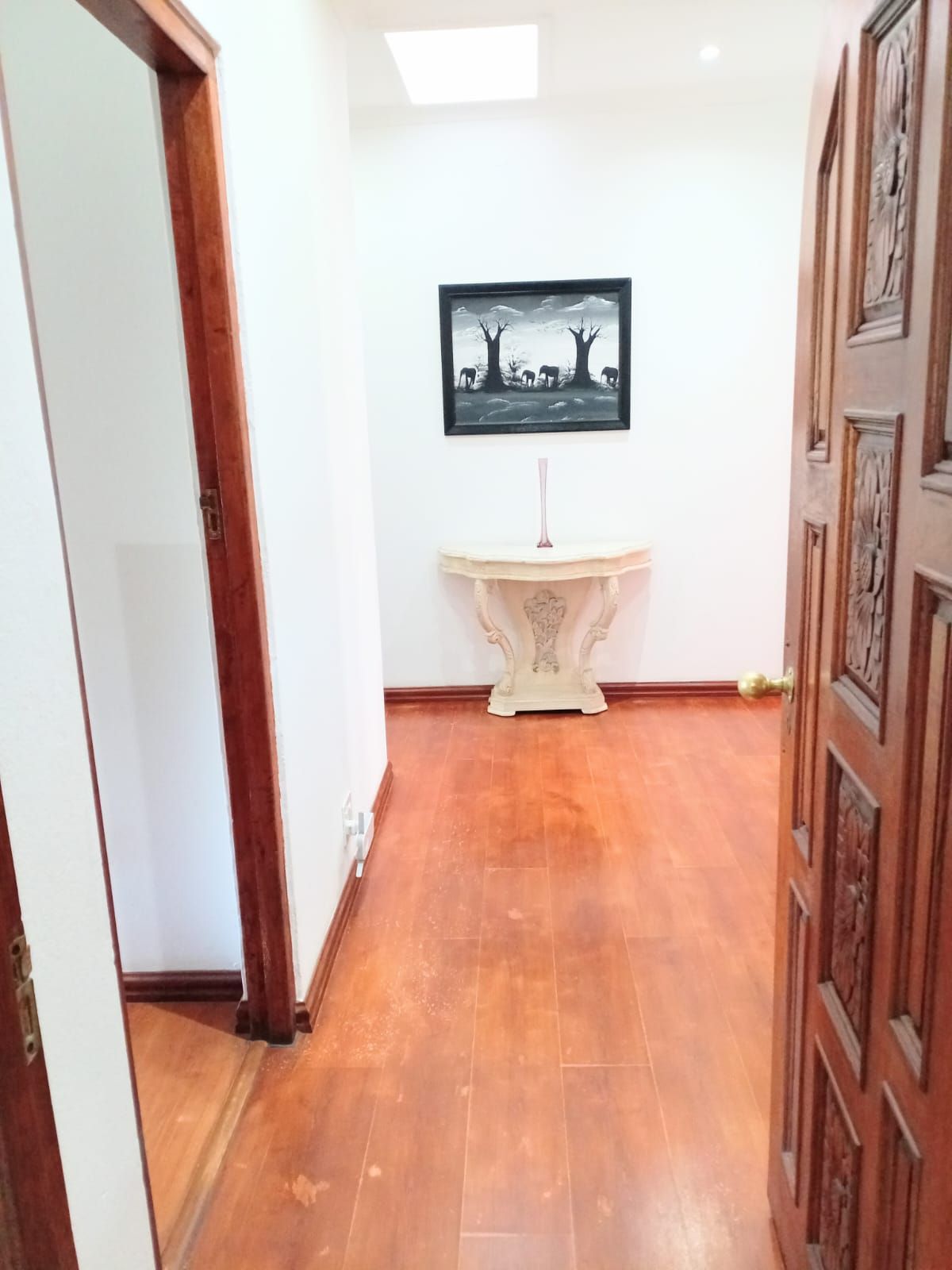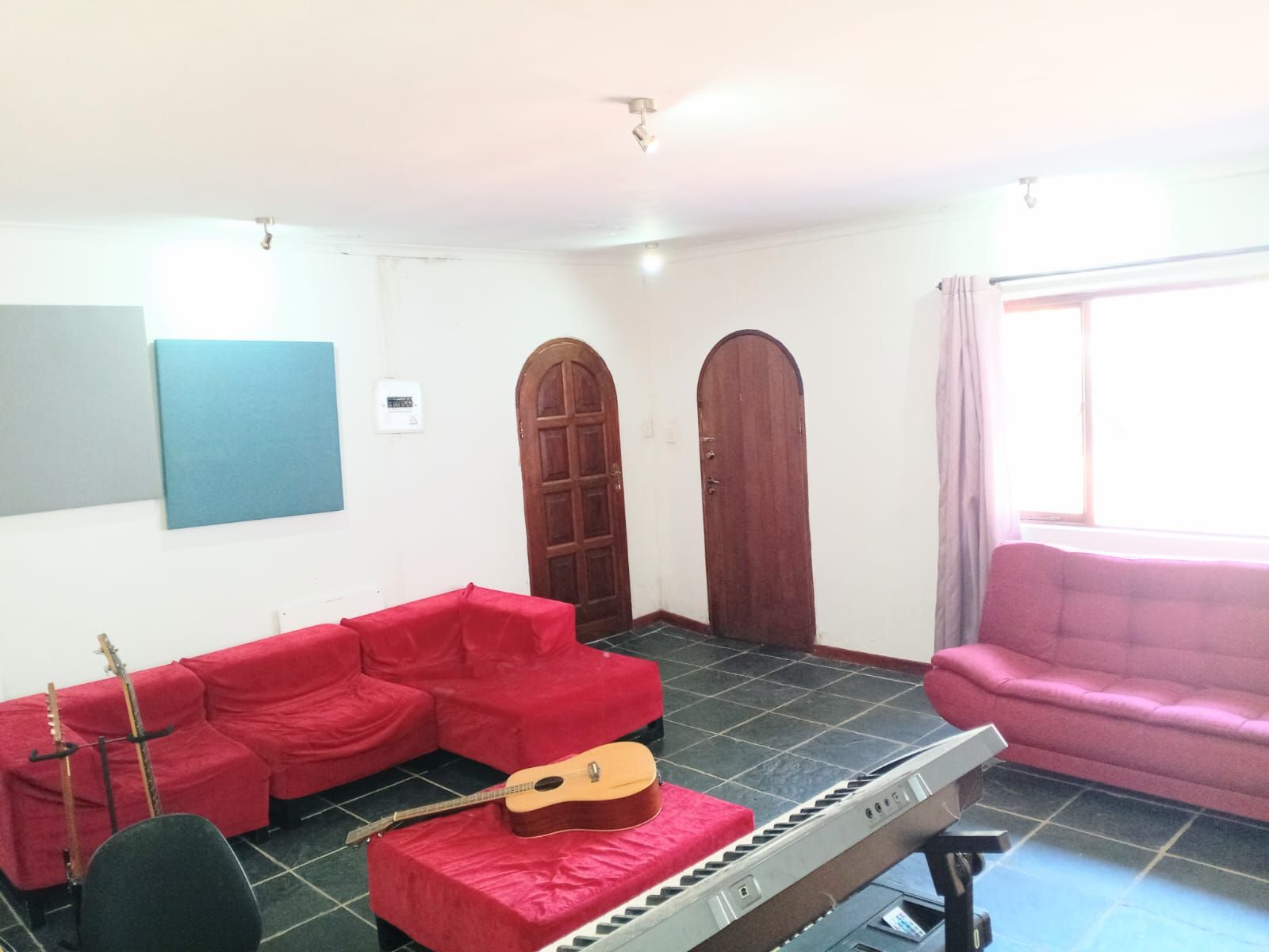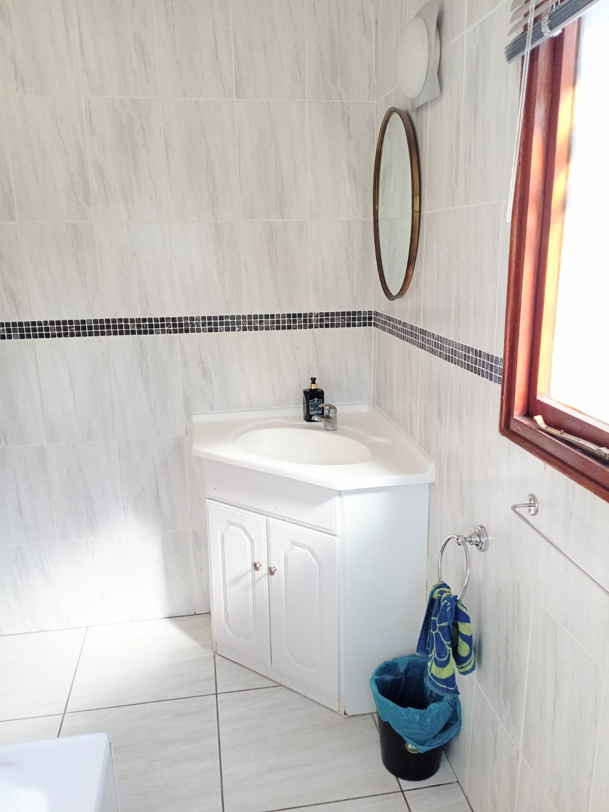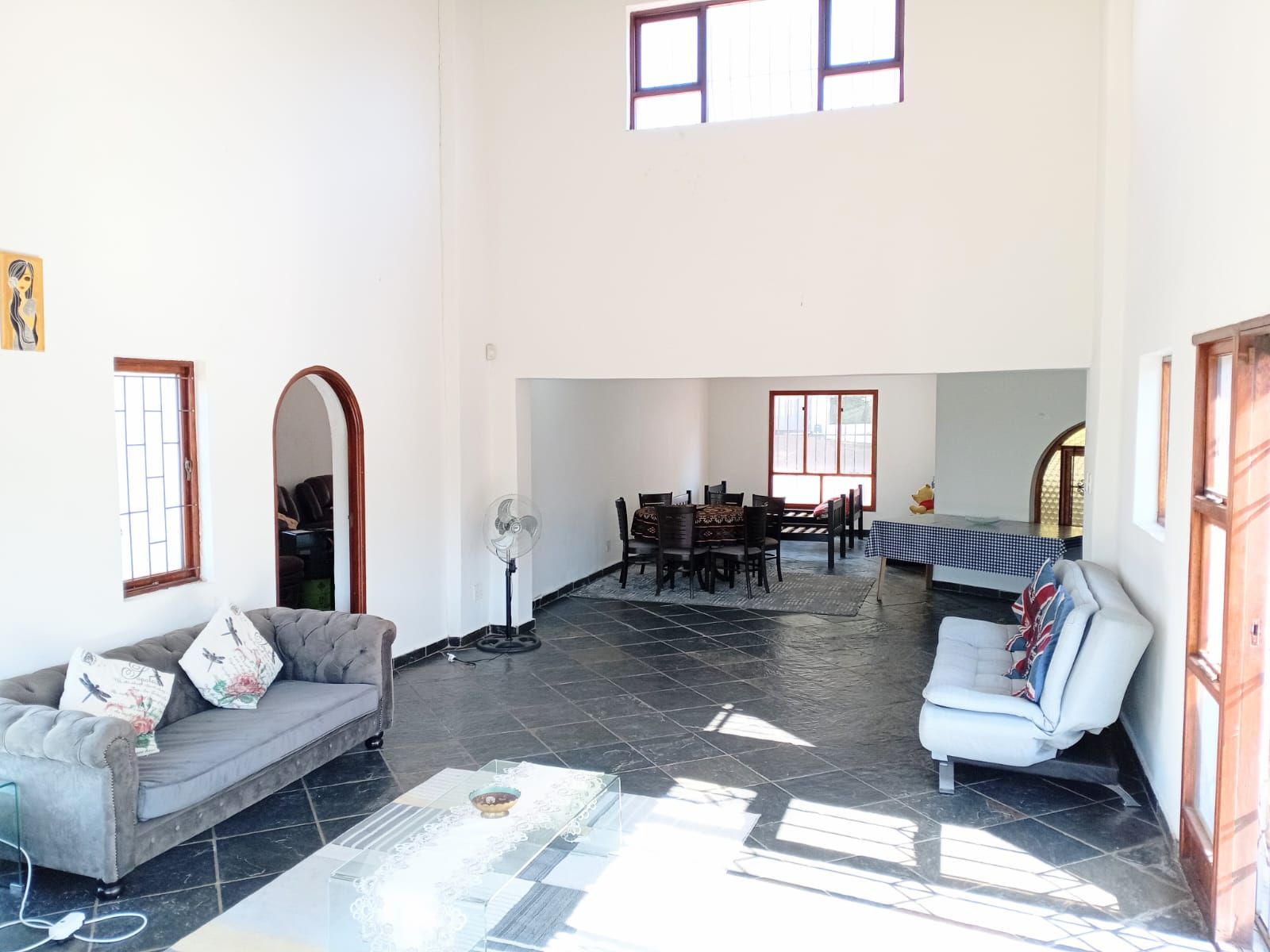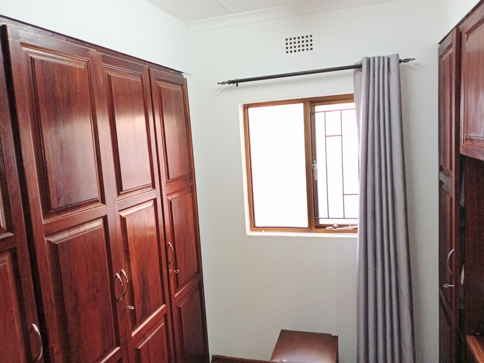 Bedroom 3: Massive space with fan, wooden window frames, and a full bathroom across the hallway