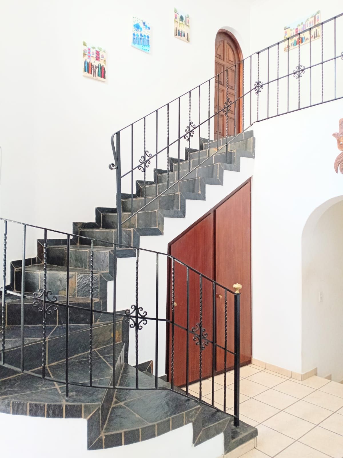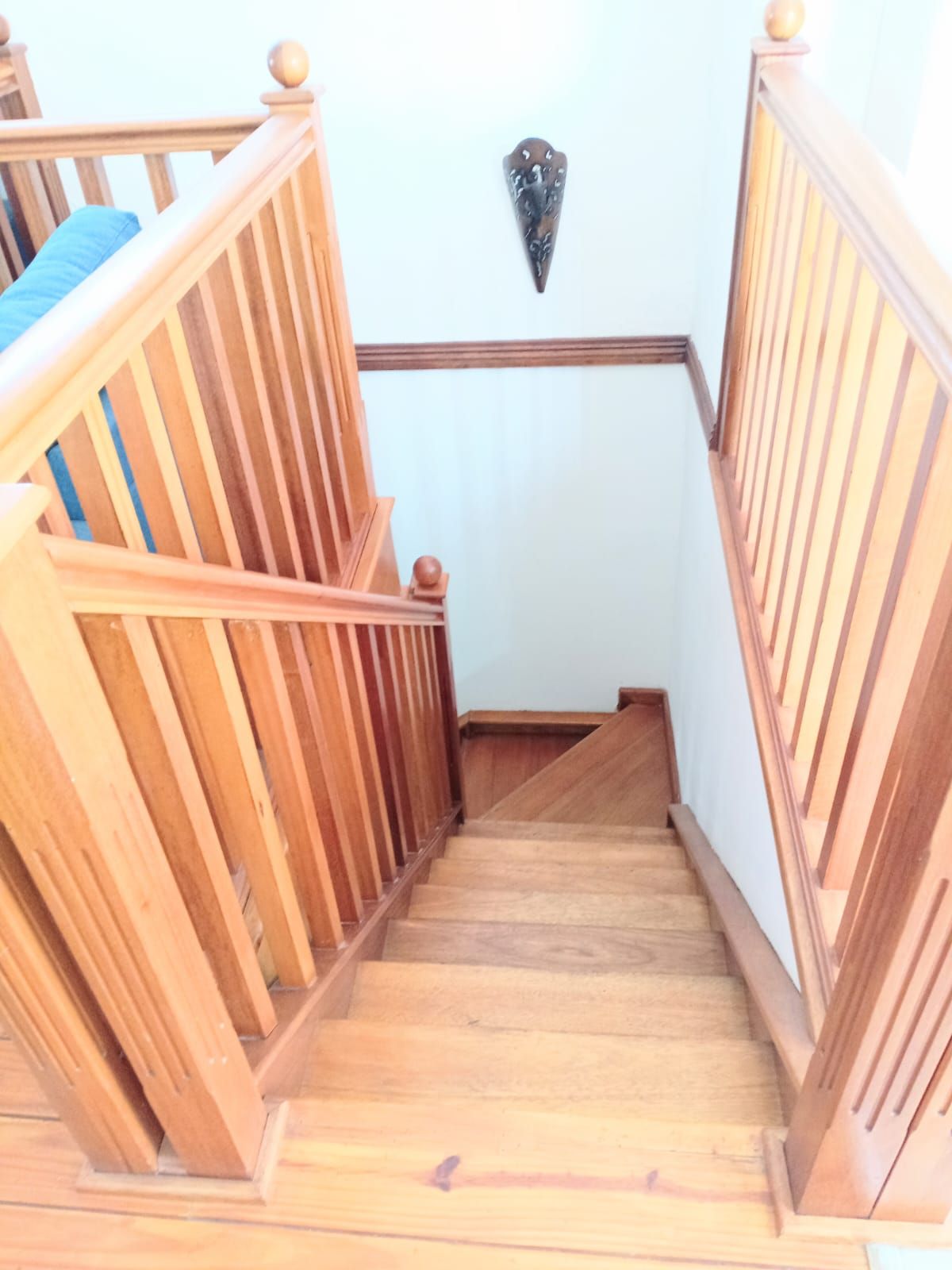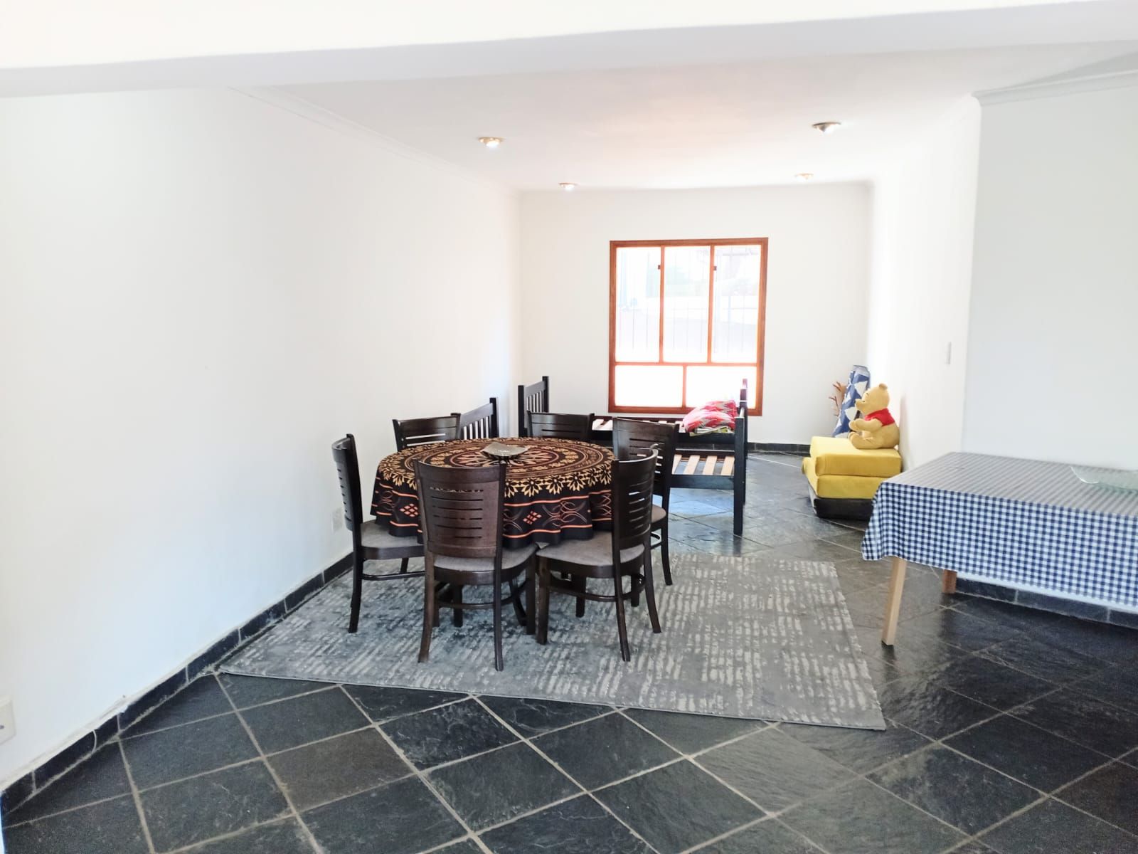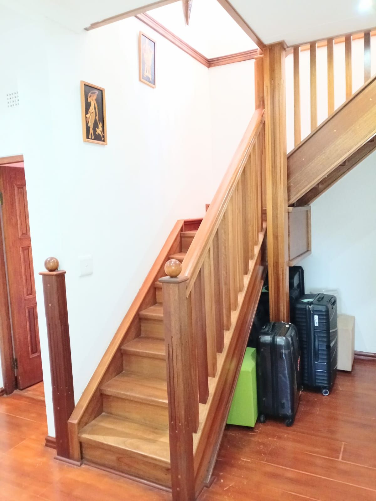 Bedroom 3: Massive space with fan, wooden window frames, and a full bathroom across the hallway