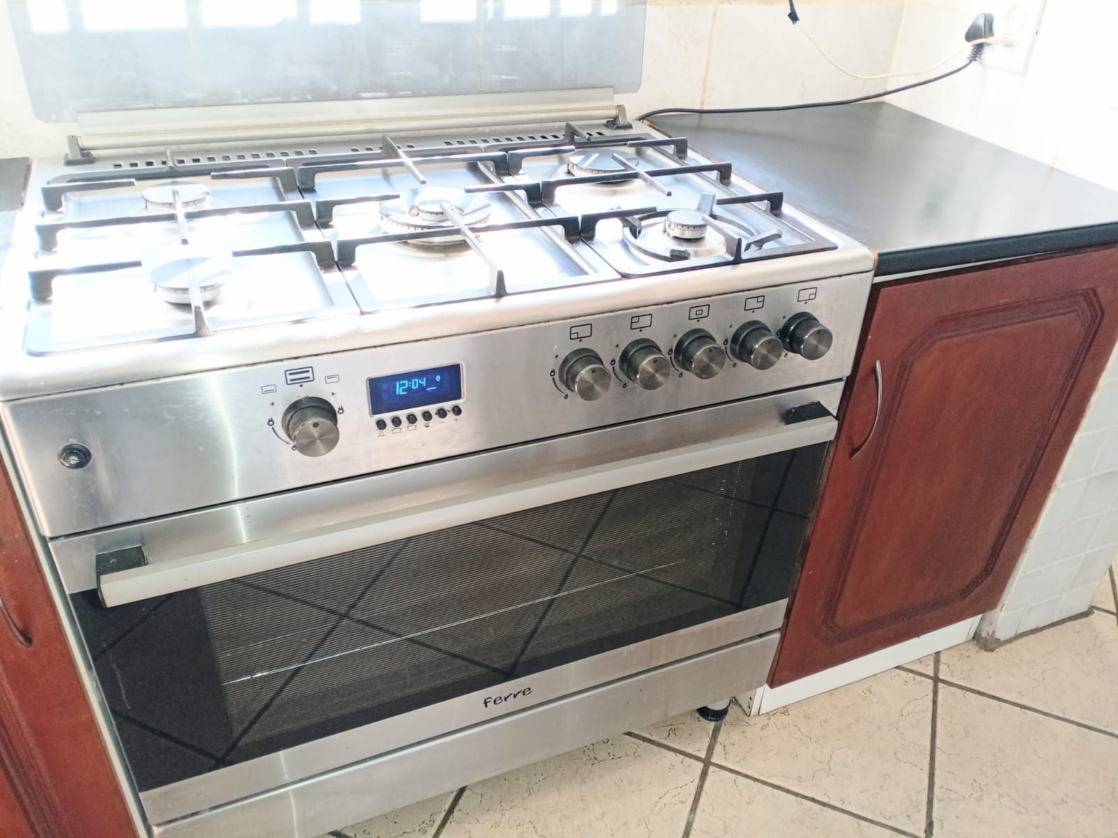 Pantry with dishwasher connection and 5-burner gas stove.