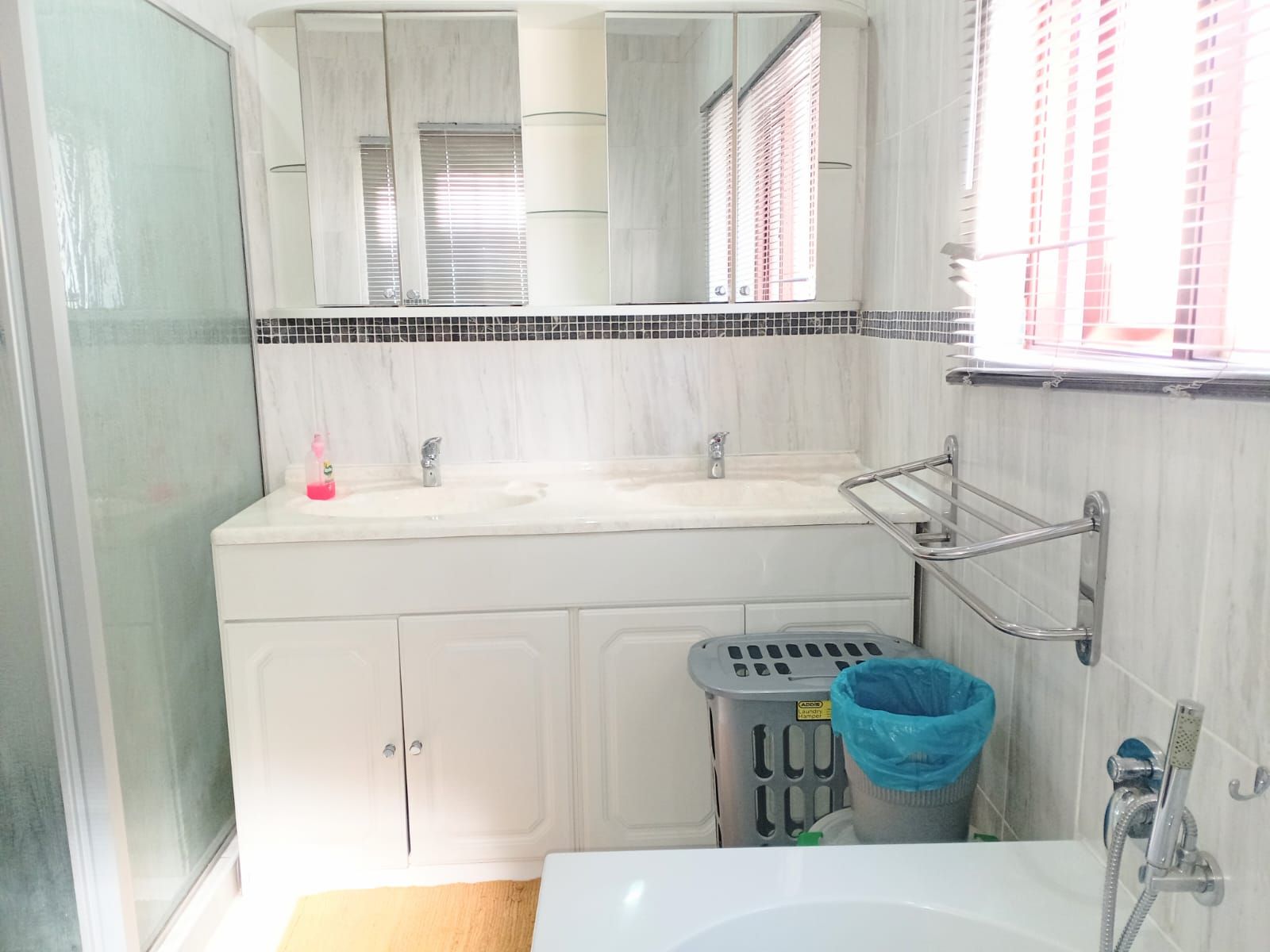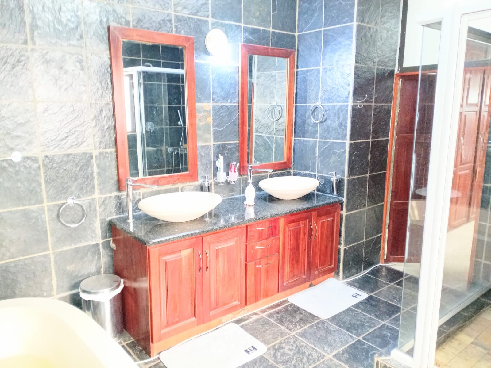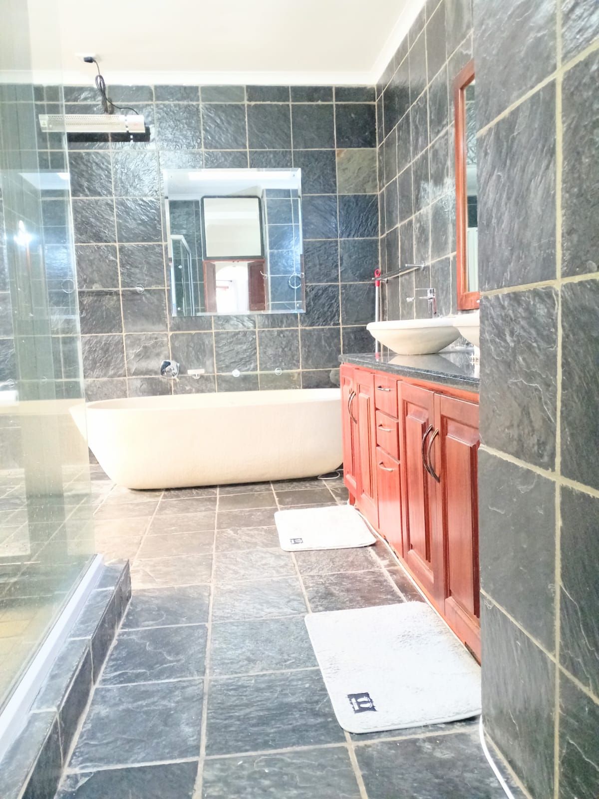 Spacious ensuite with stand-alone tub, double vanity, large shower, and aluminium windows
