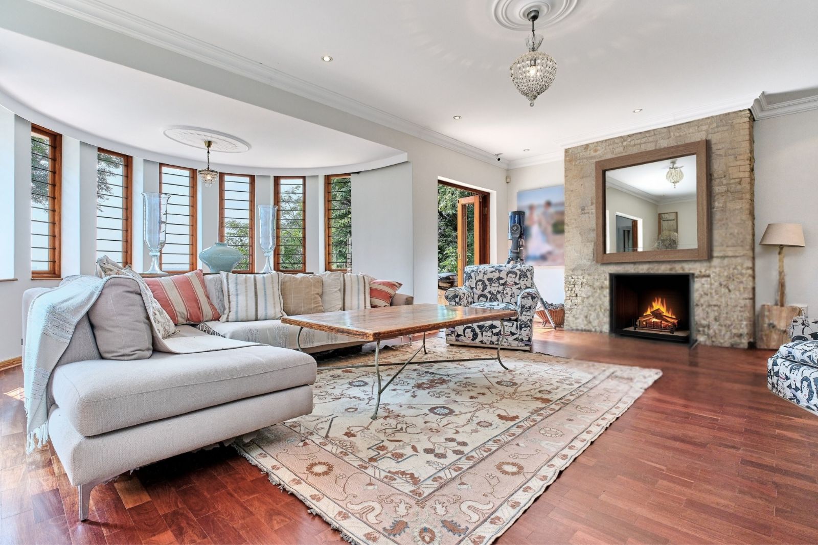 -Open-plan living areas with bow windows and fireplace