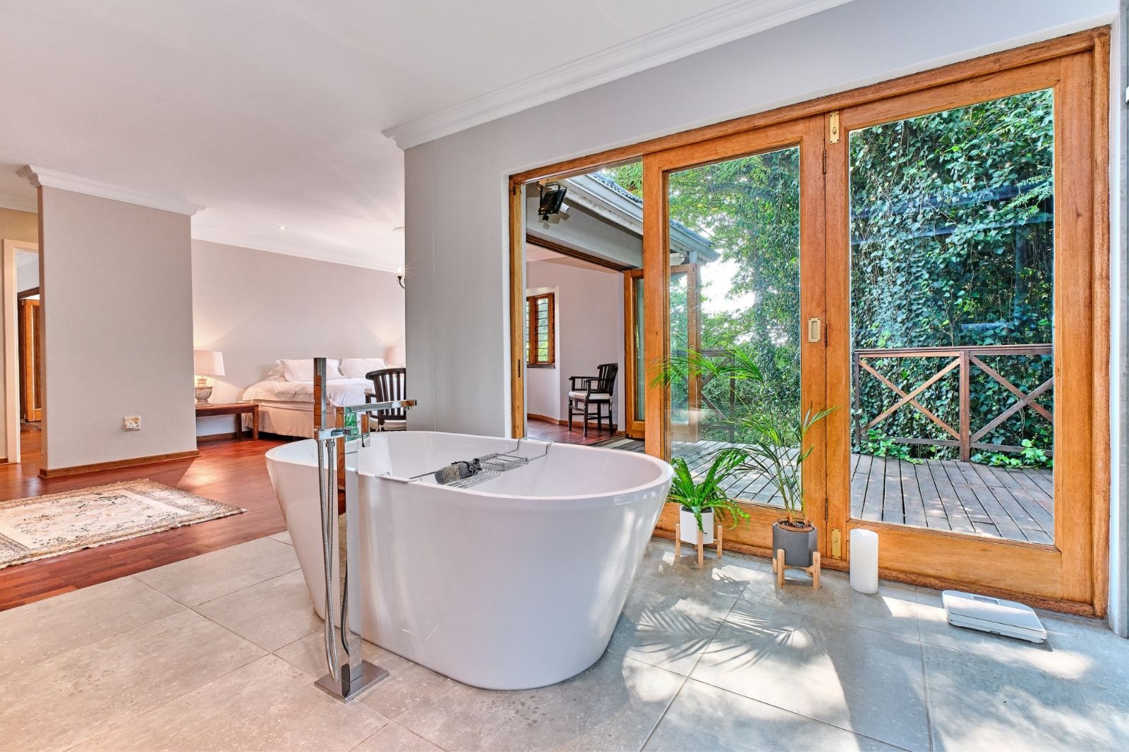 Luxurious main suite with private wooden deck and stunning views
