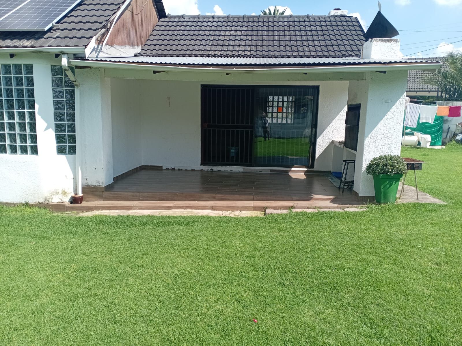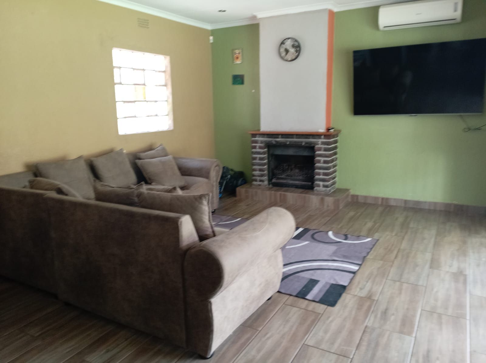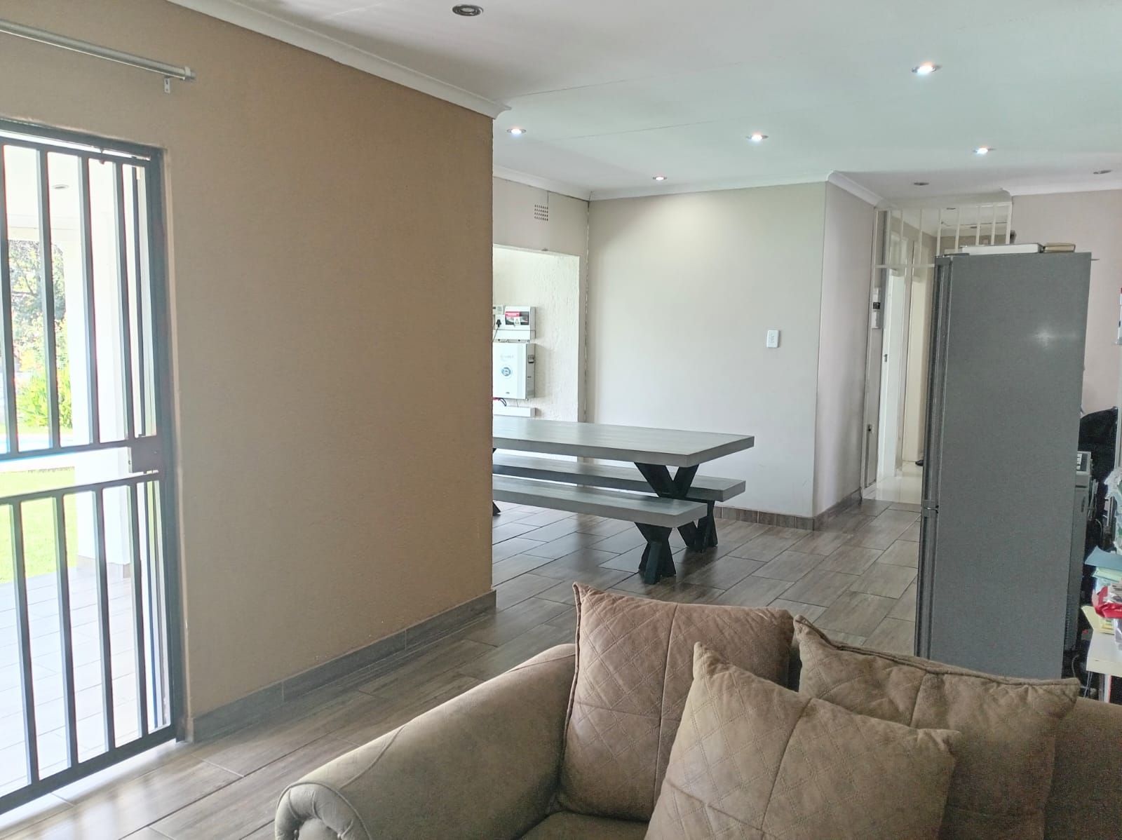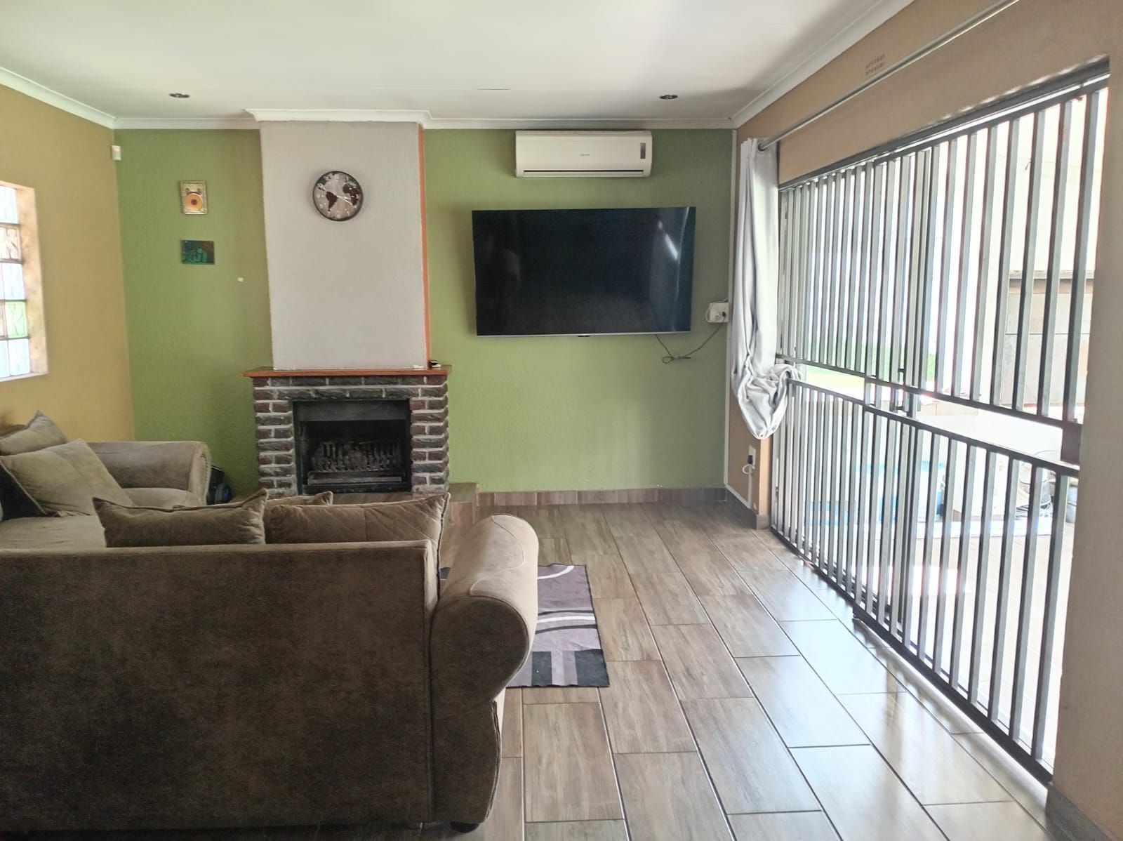 The home is ideal for both family living and entertaining, featuring a large dining room perfect for memorable gatherings, flowing into a comfortable, air-conditioned lounge. The lounge opens onto a covered patio with a built-in braai, overlooking a large swimming pool and a spacious, lush garden.