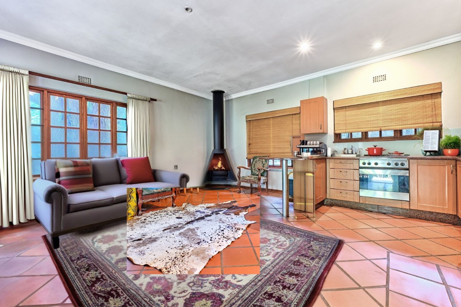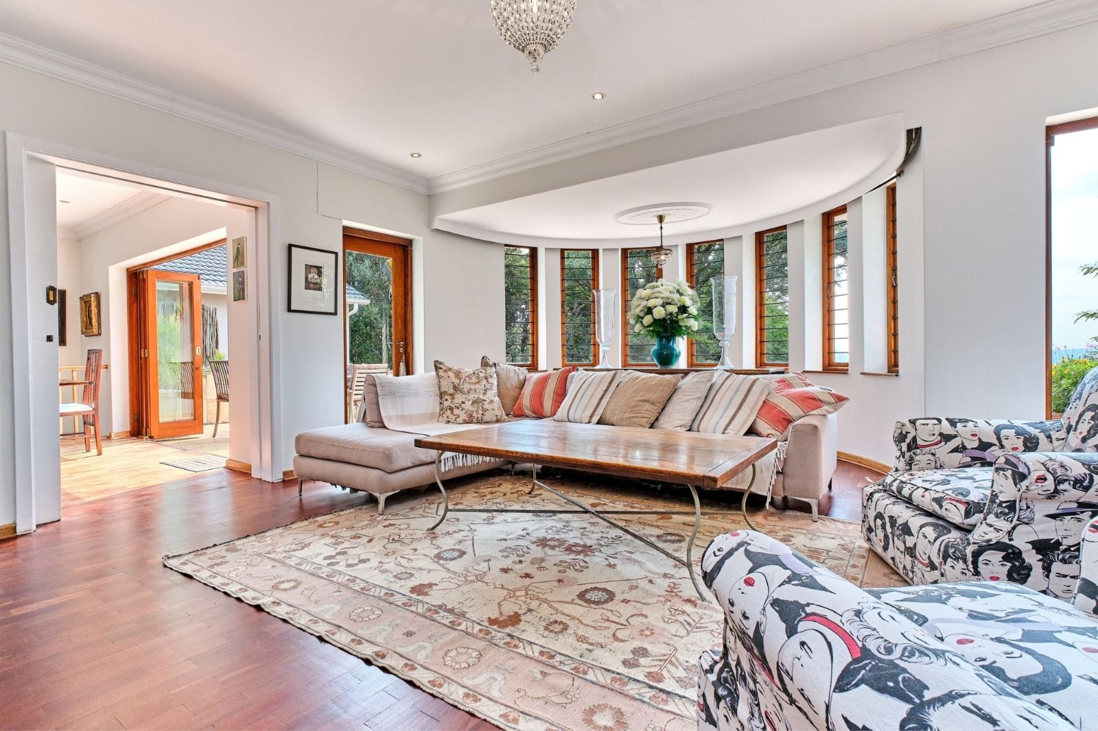 -Open-plan living areas with bow windows and fireplace