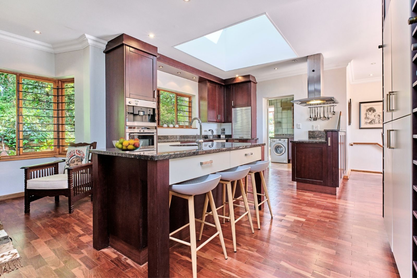 -Gourmet kitchen with island, built-in appliances (fridge/freezer, coffee machine, microwave, oven, stove, extractor)