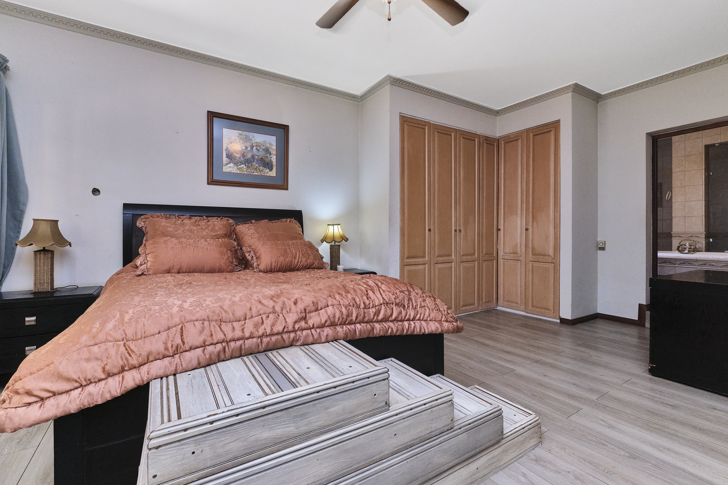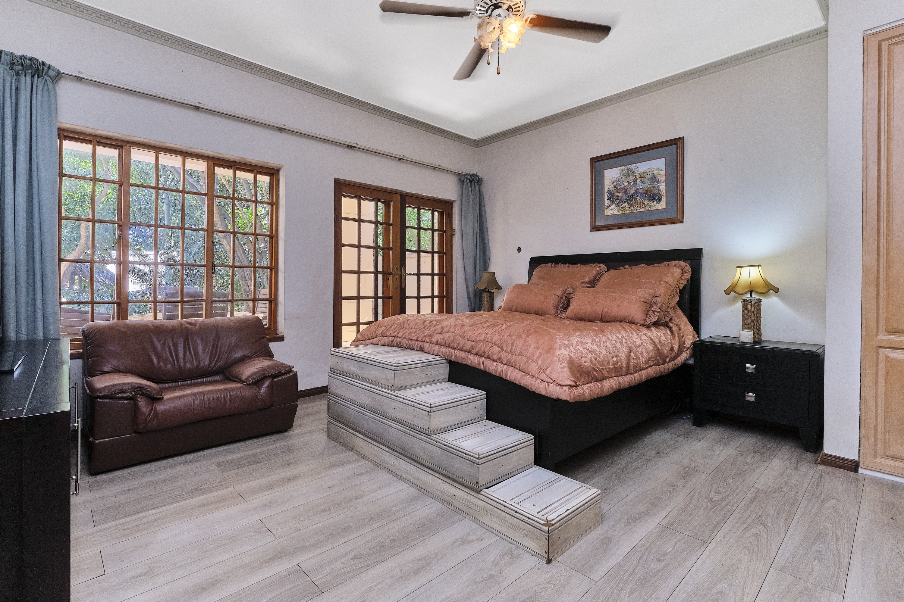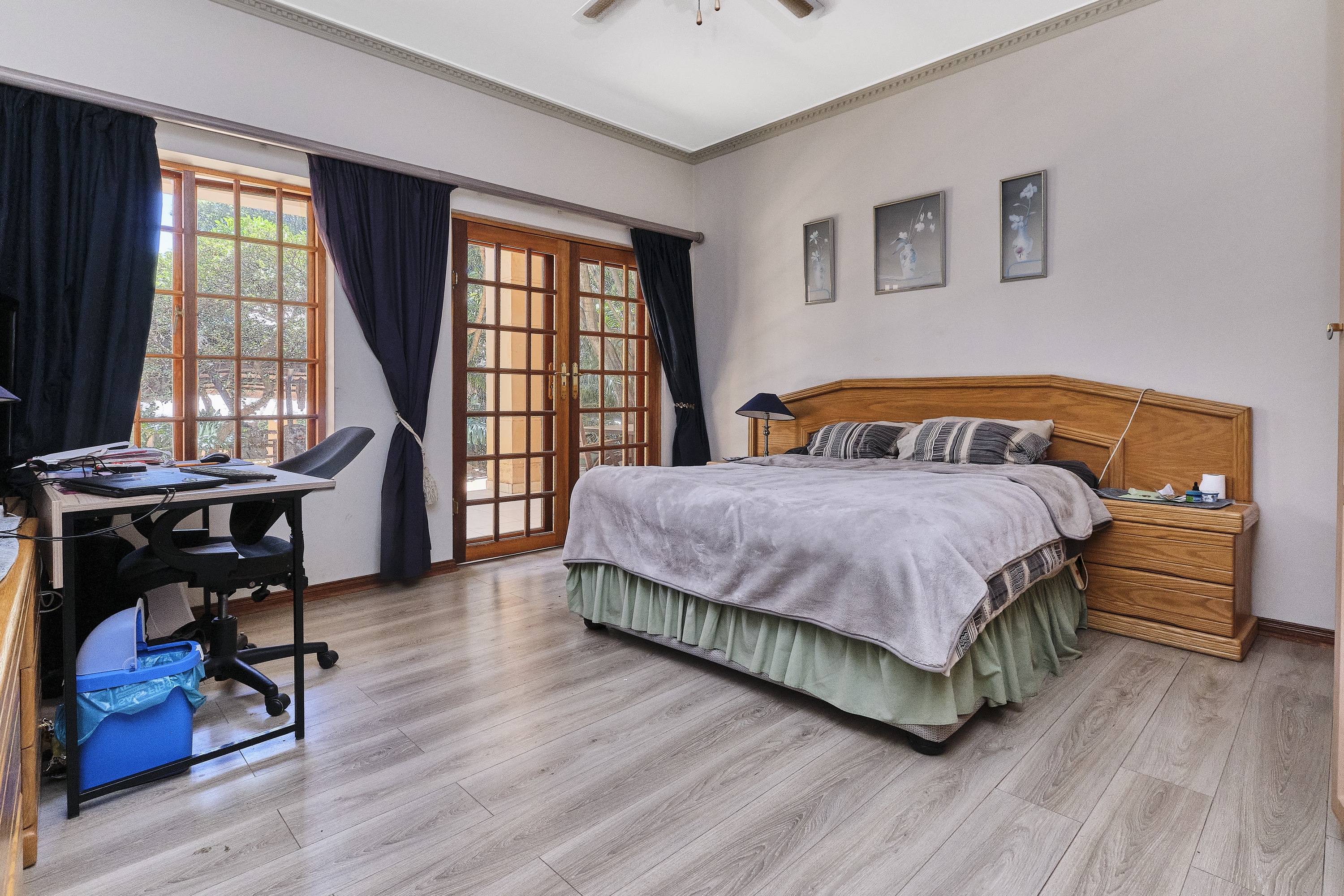 Bedroom 1 & 2: Both opening onto the patio, featuring built-in cupboards, laminate flooring, and ceiling fans for comfort.