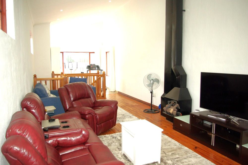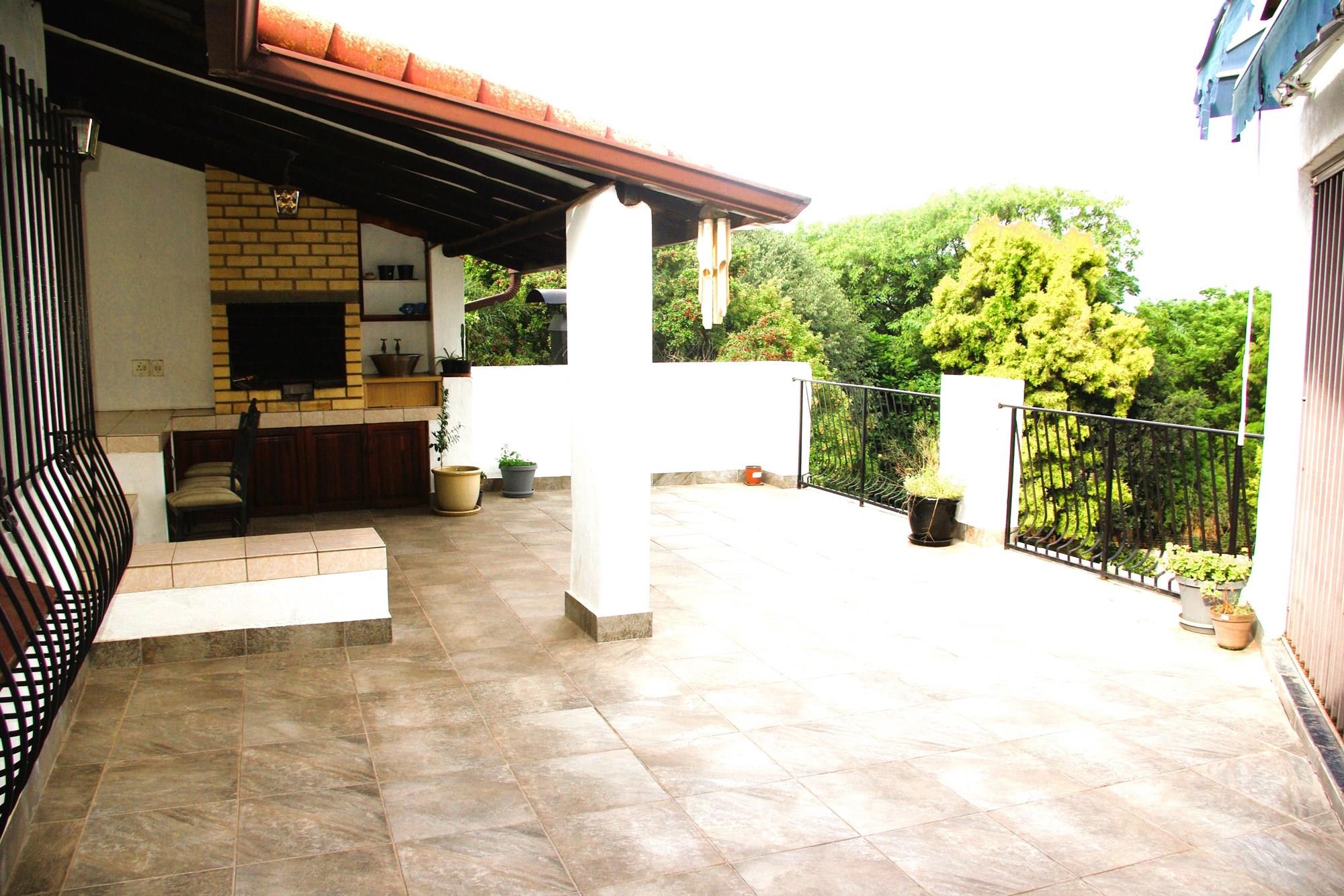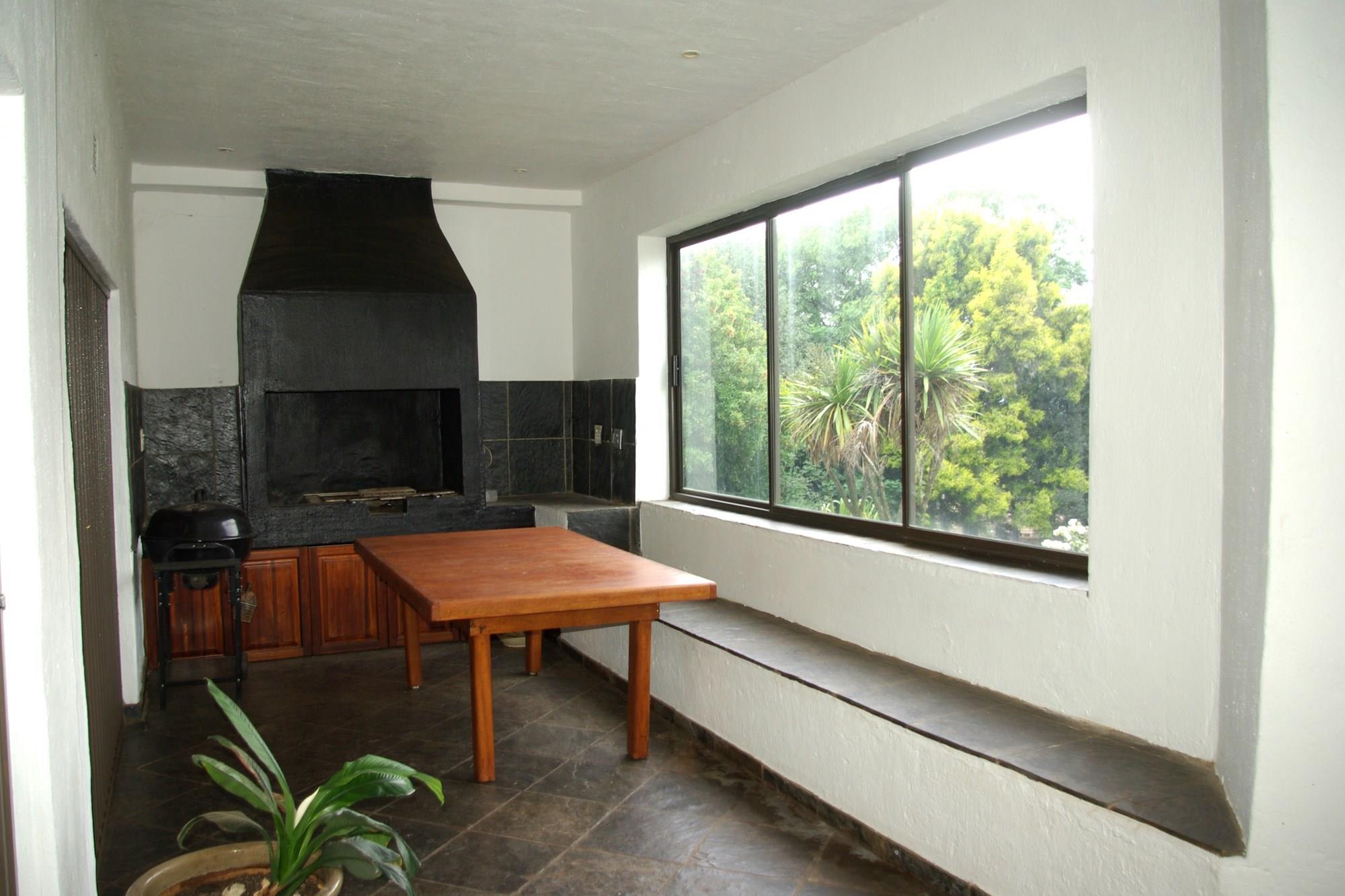 There is a formal lounge with a fire place and dining room for a 12 seater dining room table, as well as a smaller informal dining room. They lead outside to a large patio with an undercover built in braai area overlooking the sparkling pool and enormous well maintained garden. The formal dining room leads onto a small pub area on the one side and the informal dining room on the other.