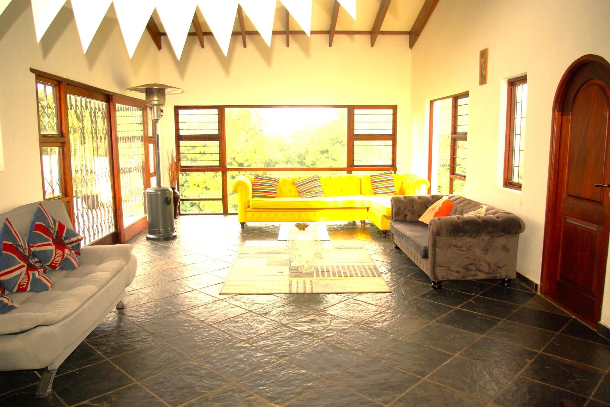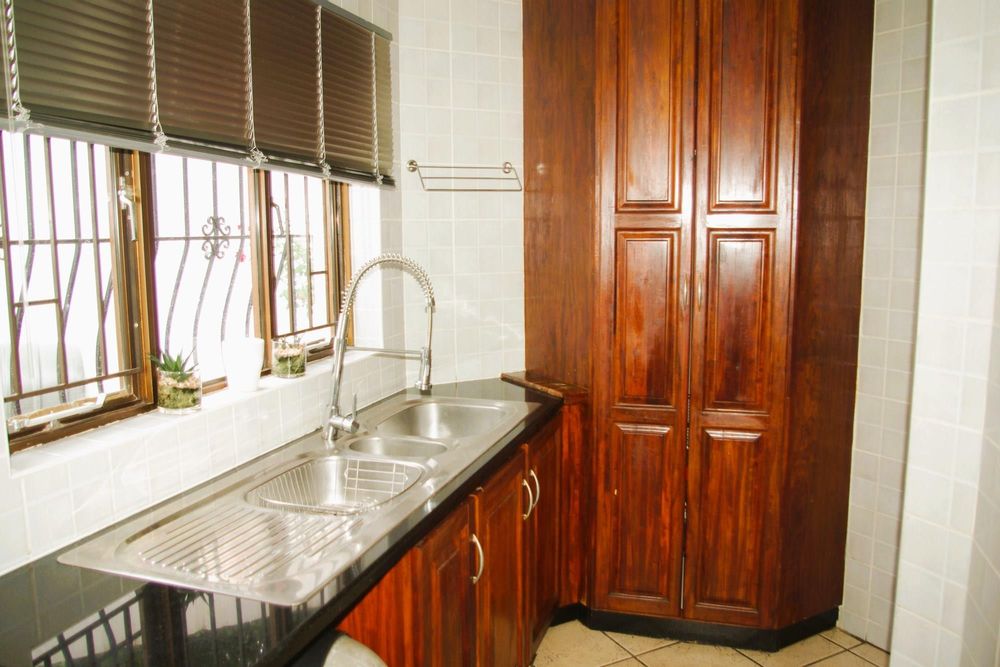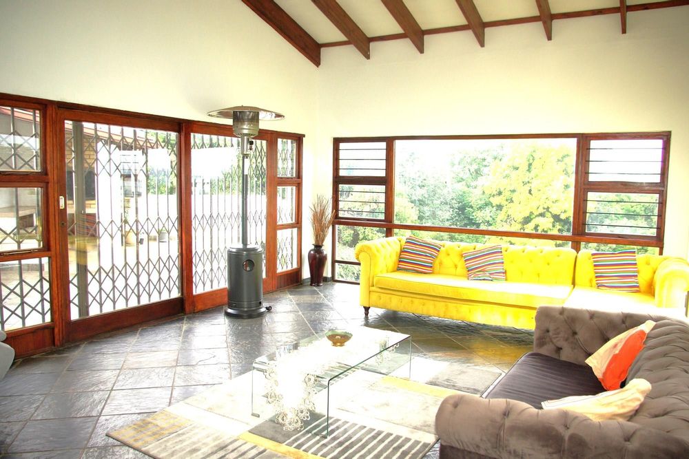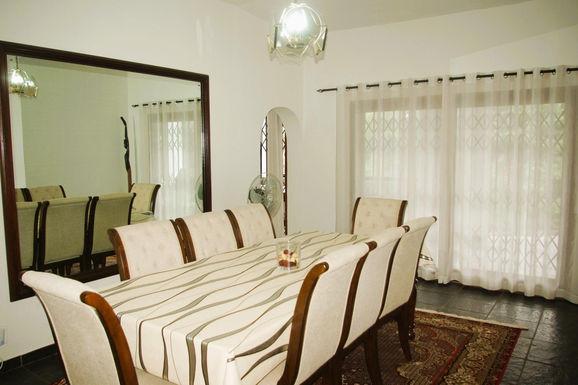 There is a formal lounge with a fire place and dining room for a 12 seater dining room table, as well as a smaller informal dining room. They lead outside to a large patio with an undercover built in braai area overlooking the sparkling pool and enormous well maintained garden. The formal dining room leads onto a small pub area on the one side and the informal dining room on the other.