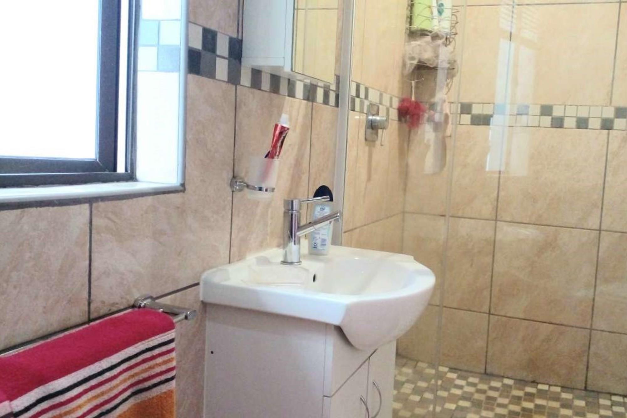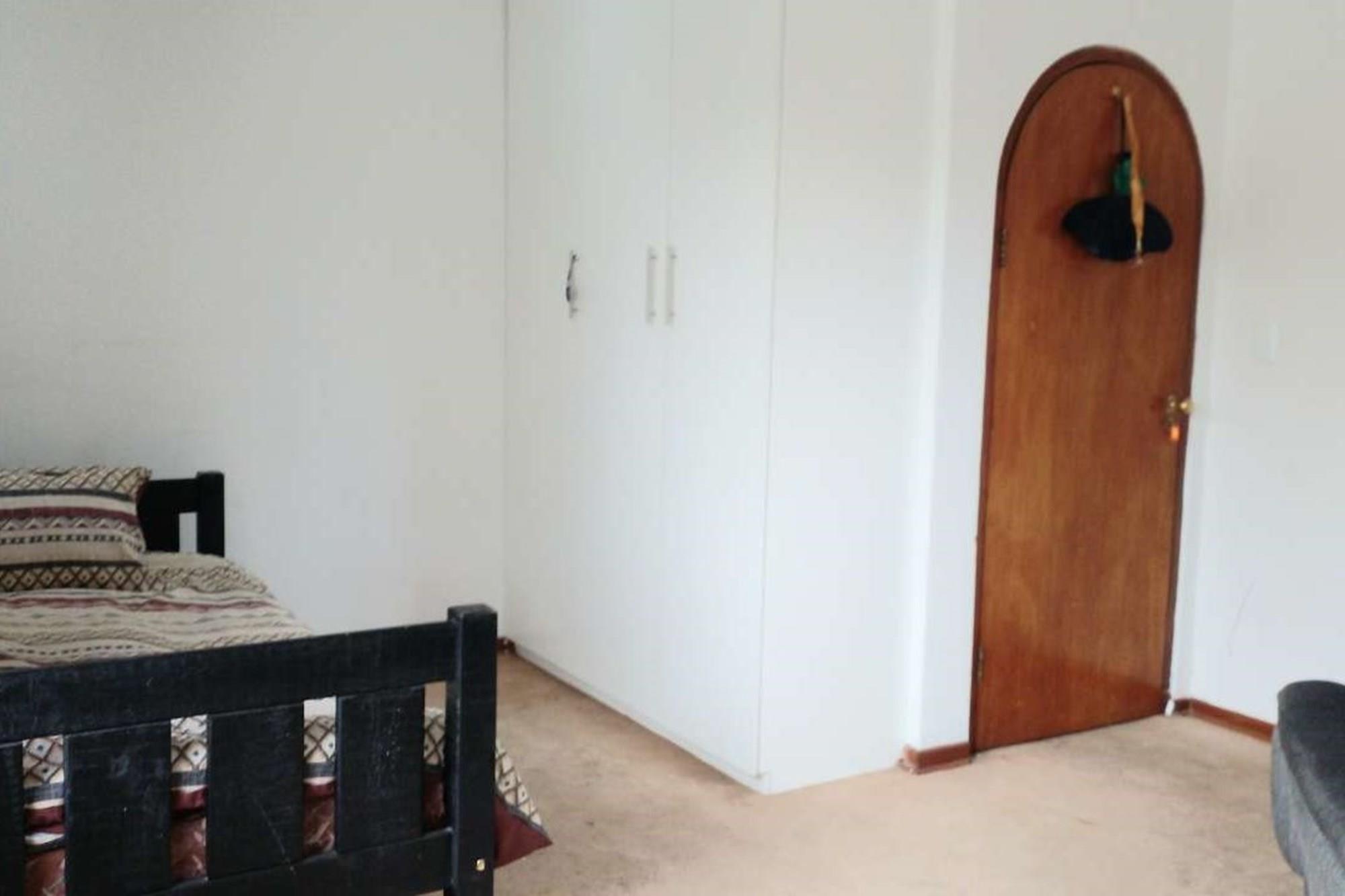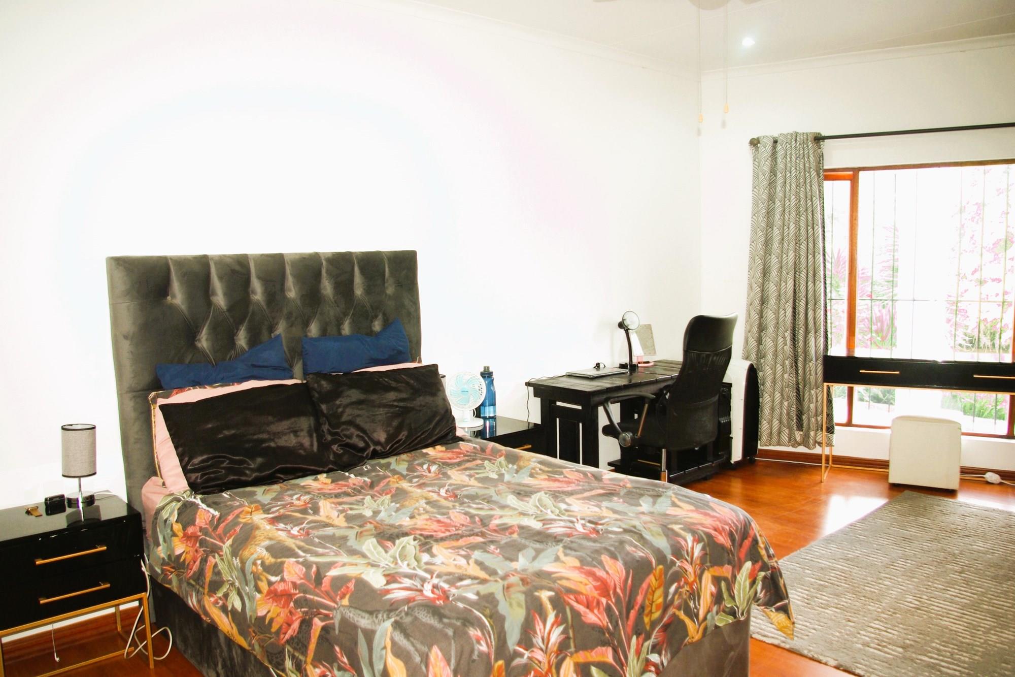 There is a fourth bedroom that looks outside onto upstairs braai and balcony. It too has a ceiling fan and built in cupboards. It has a separate full bathroom next door to it.