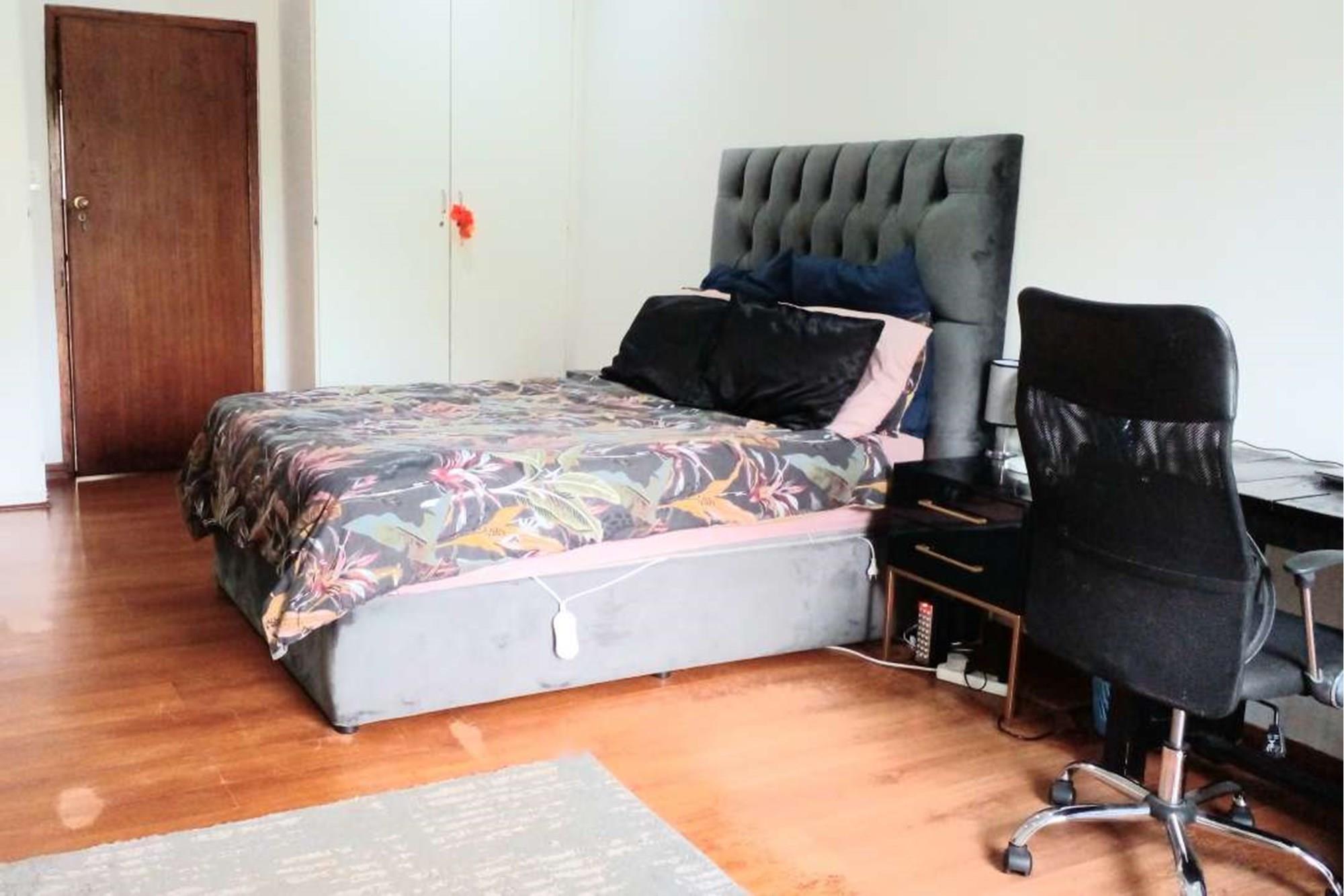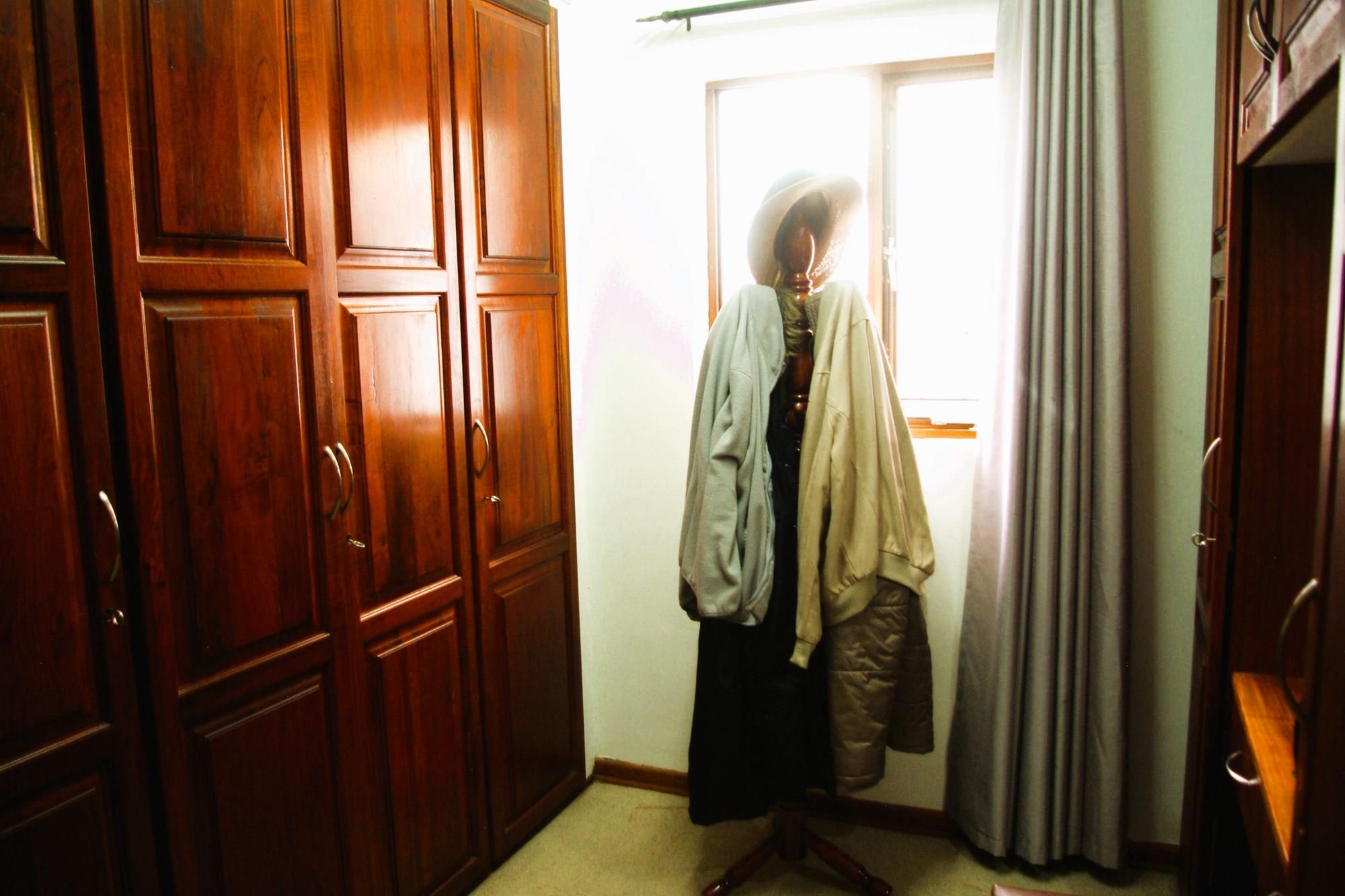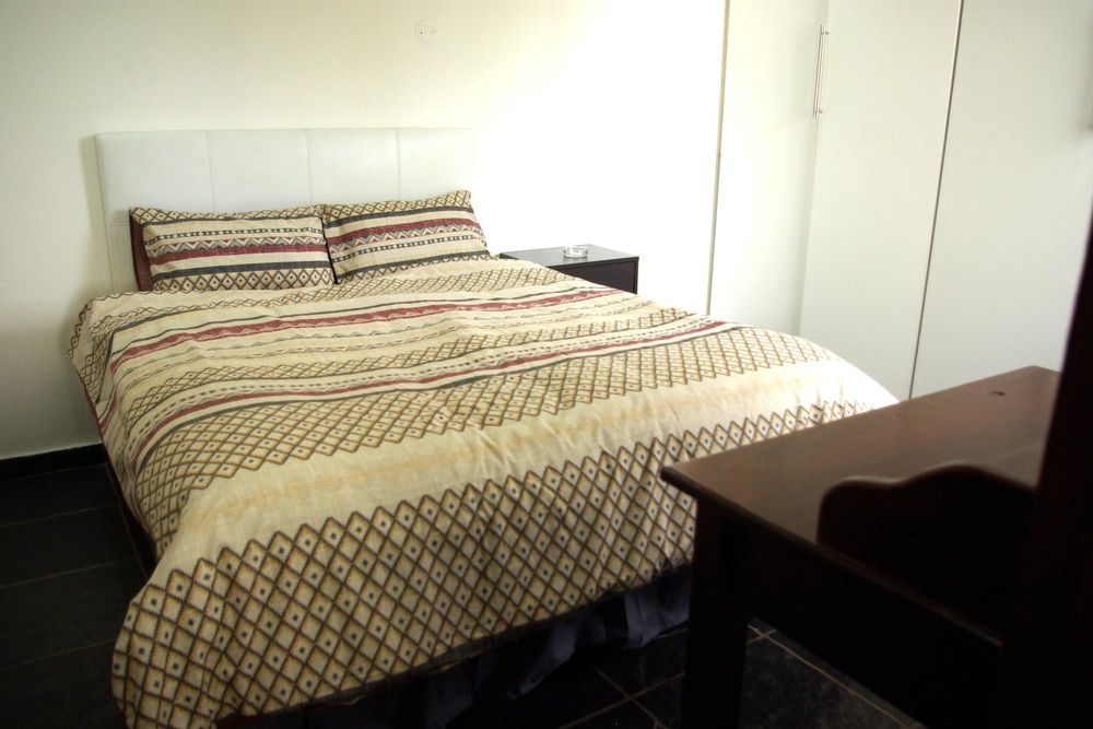 There is a fourth bedroom that looks outside onto upstairs braai and balcony. It too has a ceiling fan and built in cupboards. It has a separate full bathroom next door to it.