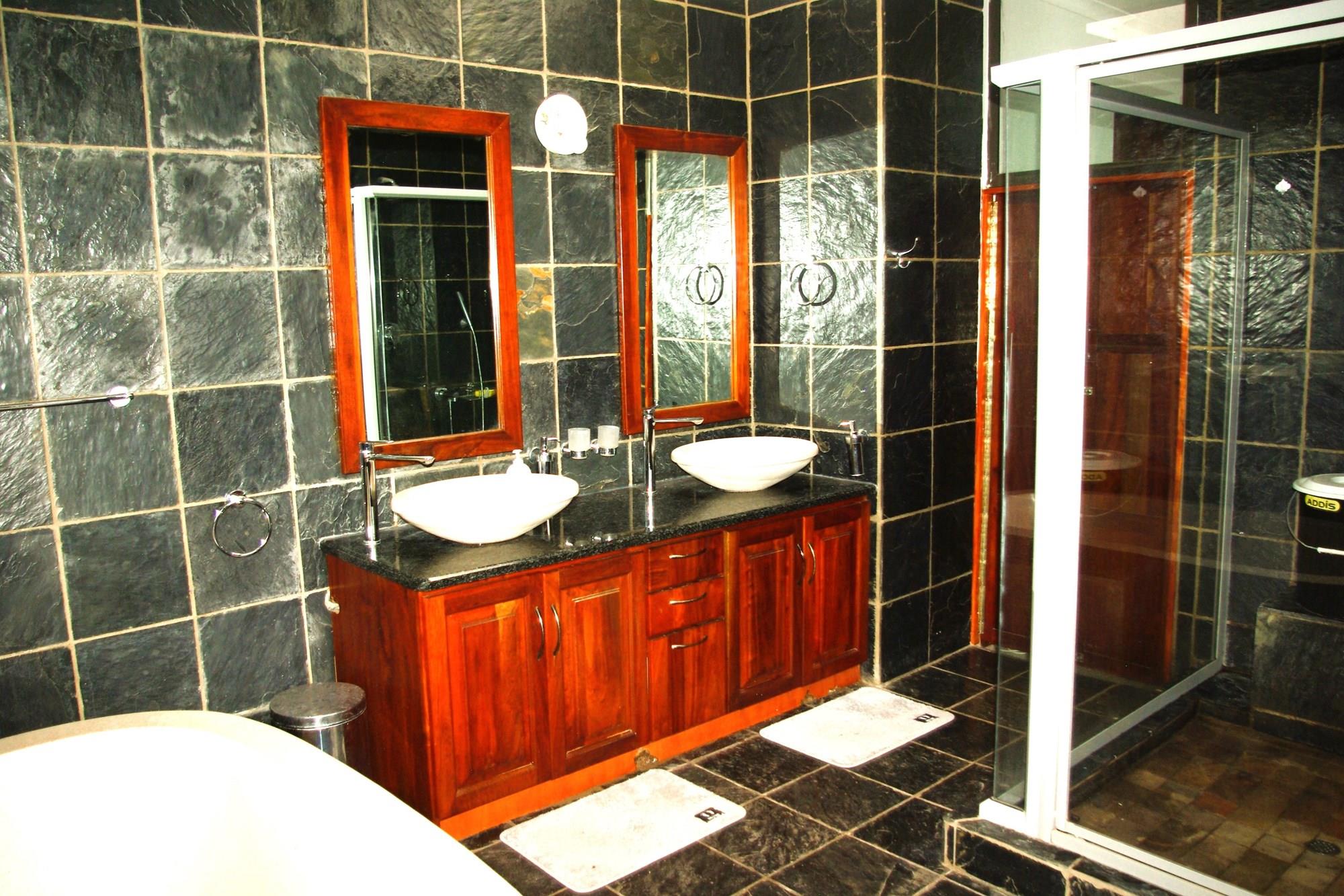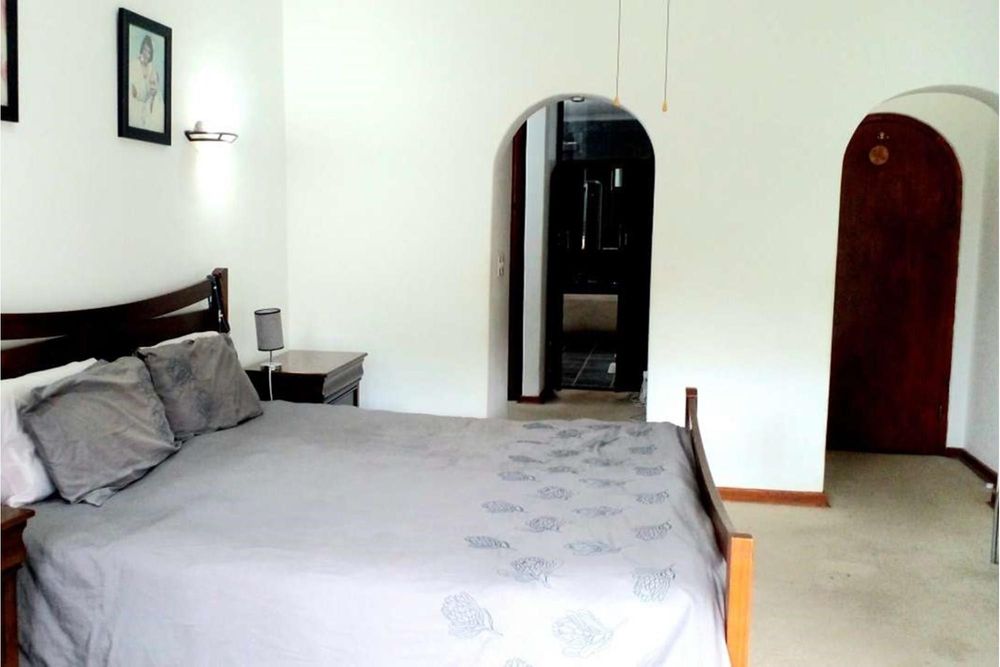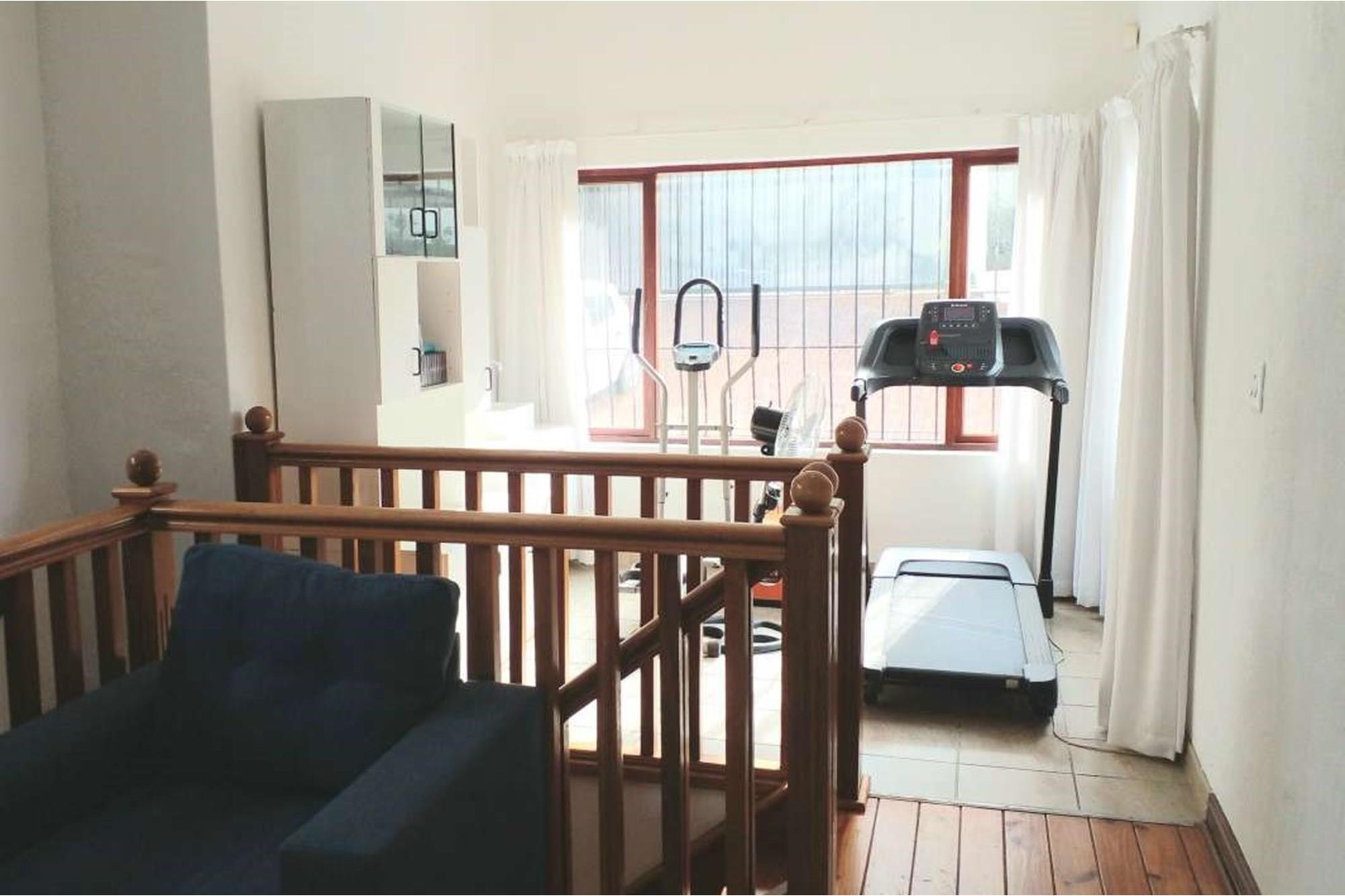 The main bedroom has a view of the rear garden and swimming pool. There is a dressing room and lovely black tiled bathroom en suite. The second bedroom looks onto the front of the house and has a bathroom en suite. The third bedroom looks onto the the front patio and pool area. It too has a full bathroom opposite it. A wooden staircase ascends from the bedroom chambers to the mini gym and family-tv room (2nd lounge). All the bedrooms feature built in cupboards and ceiling fans.