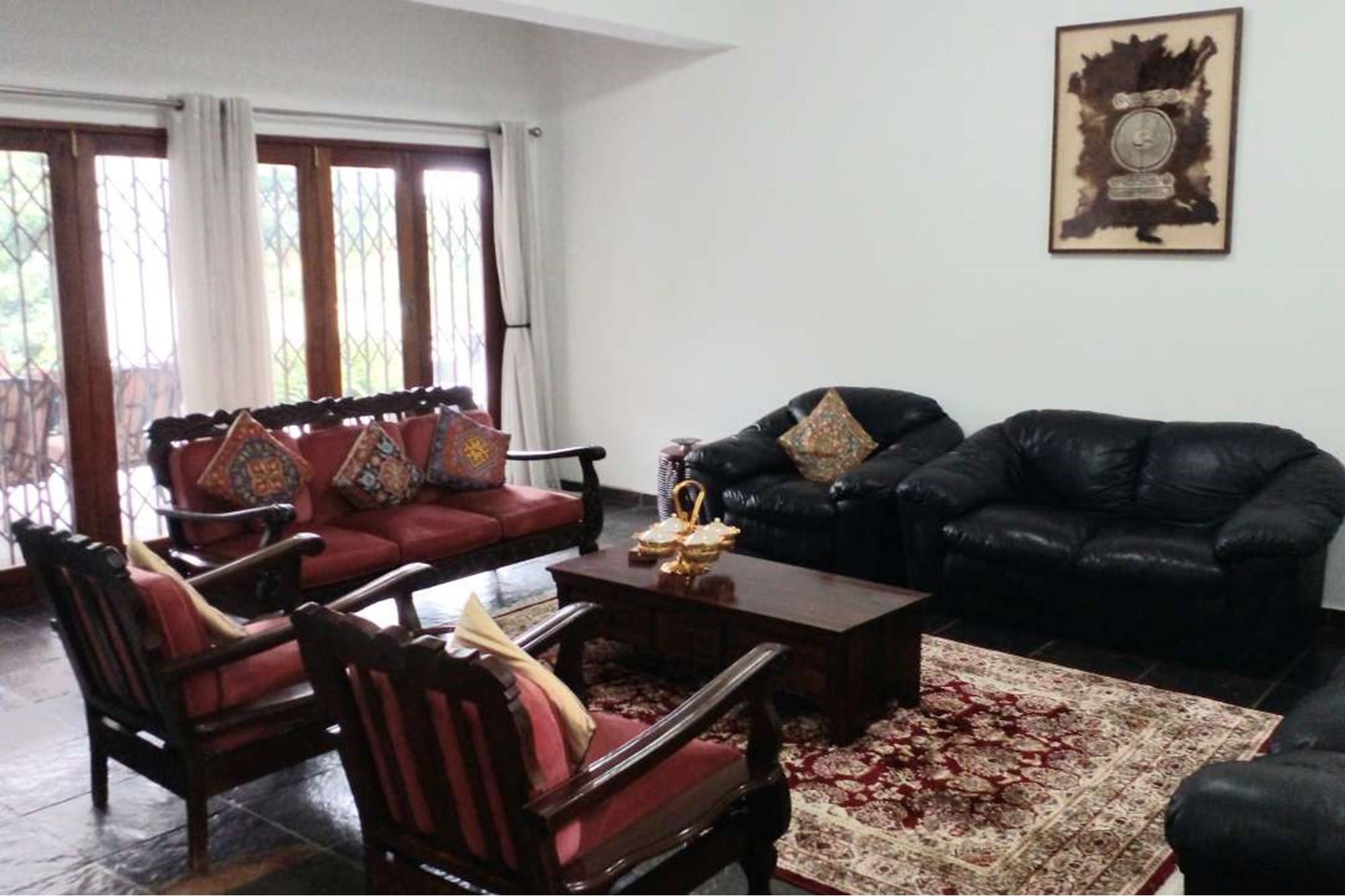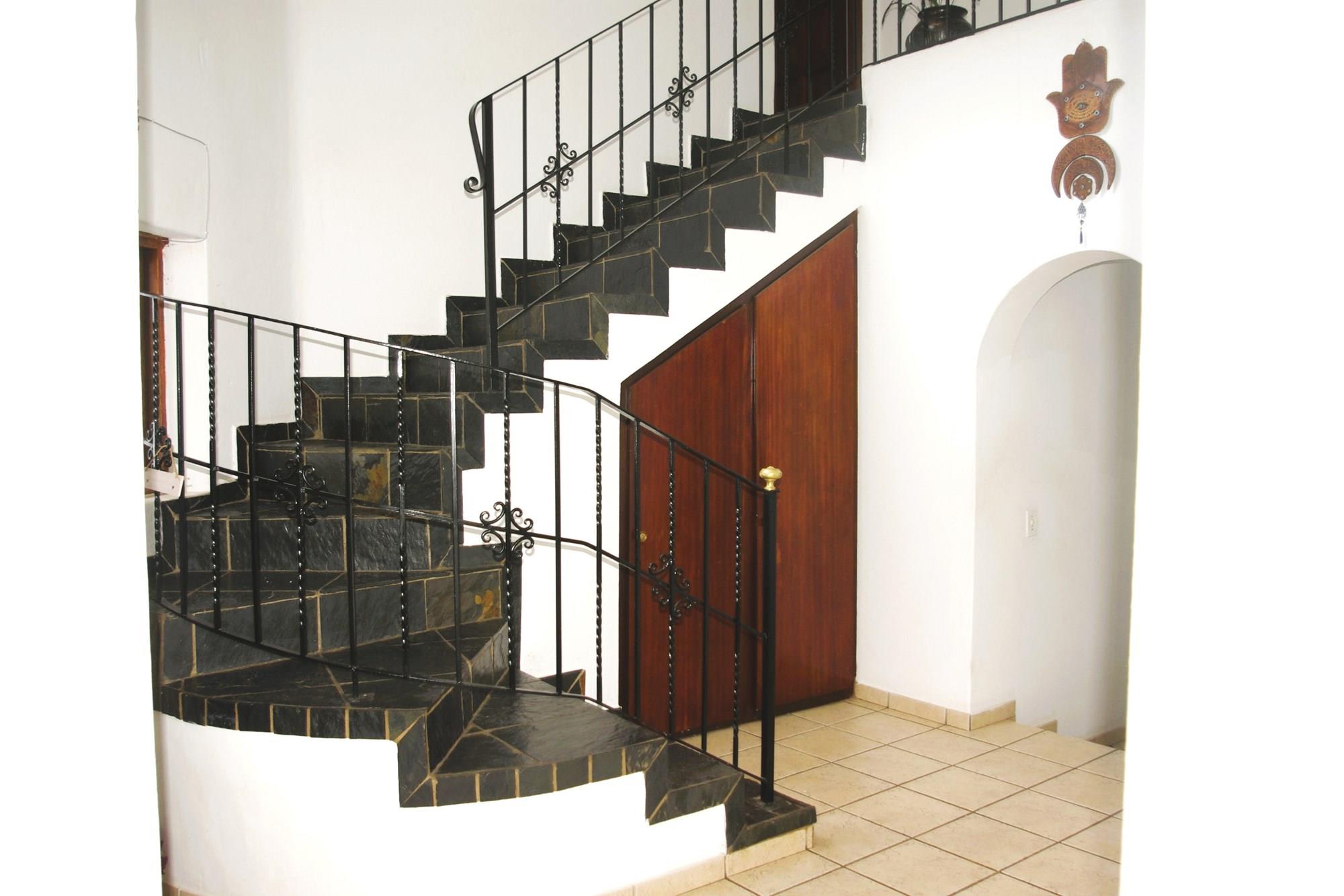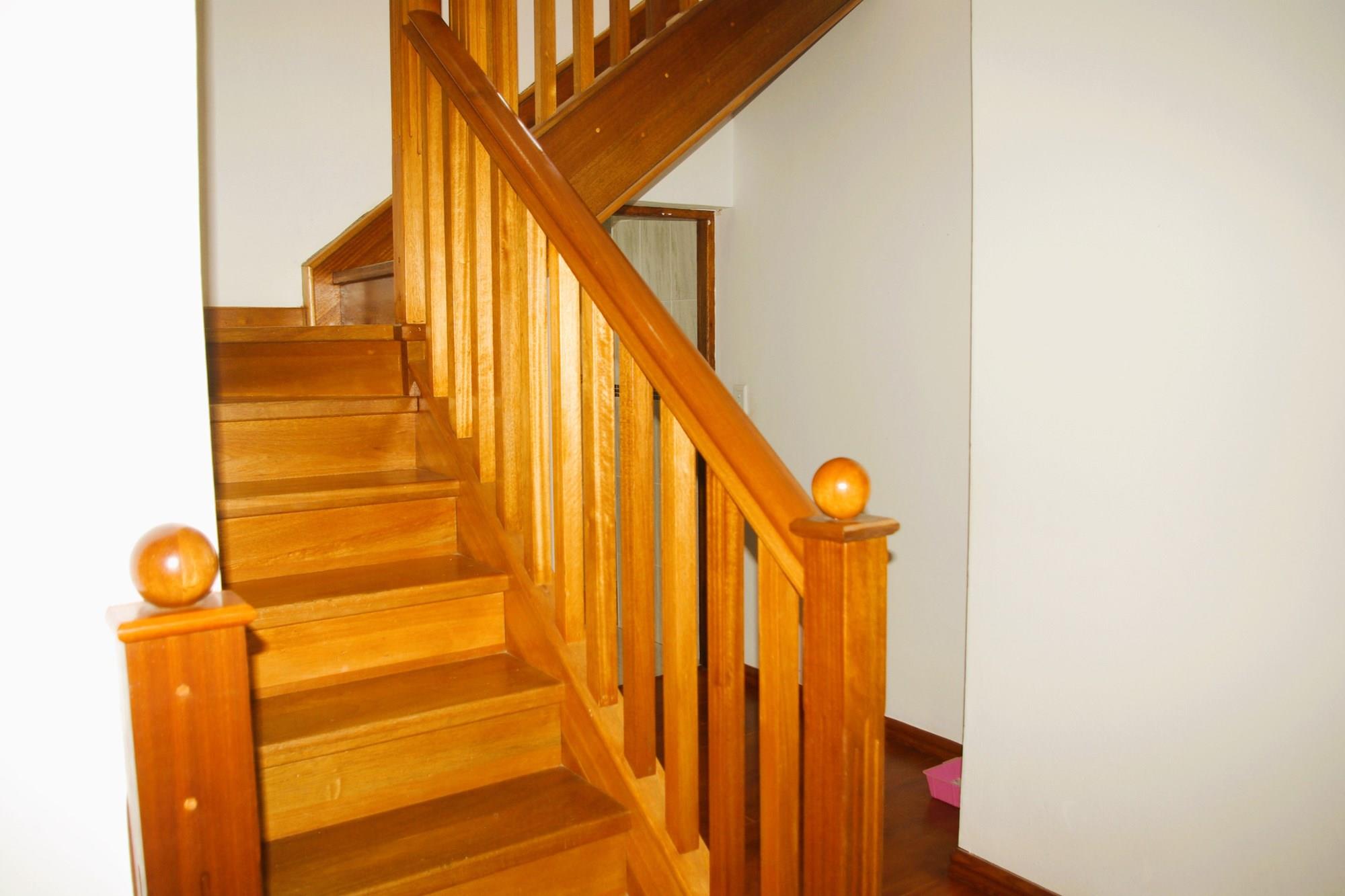 The main bedroom has a view of the rear garden and swimming pool. There is a dressing room and lovely black tiled bathroom en suite. The second bedroom looks onto the front of the house and has a bathroom en suite. The third bedroom looks onto the the front patio and pool area. It too has a full bathroom opposite it. A wooden staircase ascends from the bedroom chambers to the mini gym and family-tv room (2nd lounge). All the bedrooms feature built in cupboards and ceiling fans.