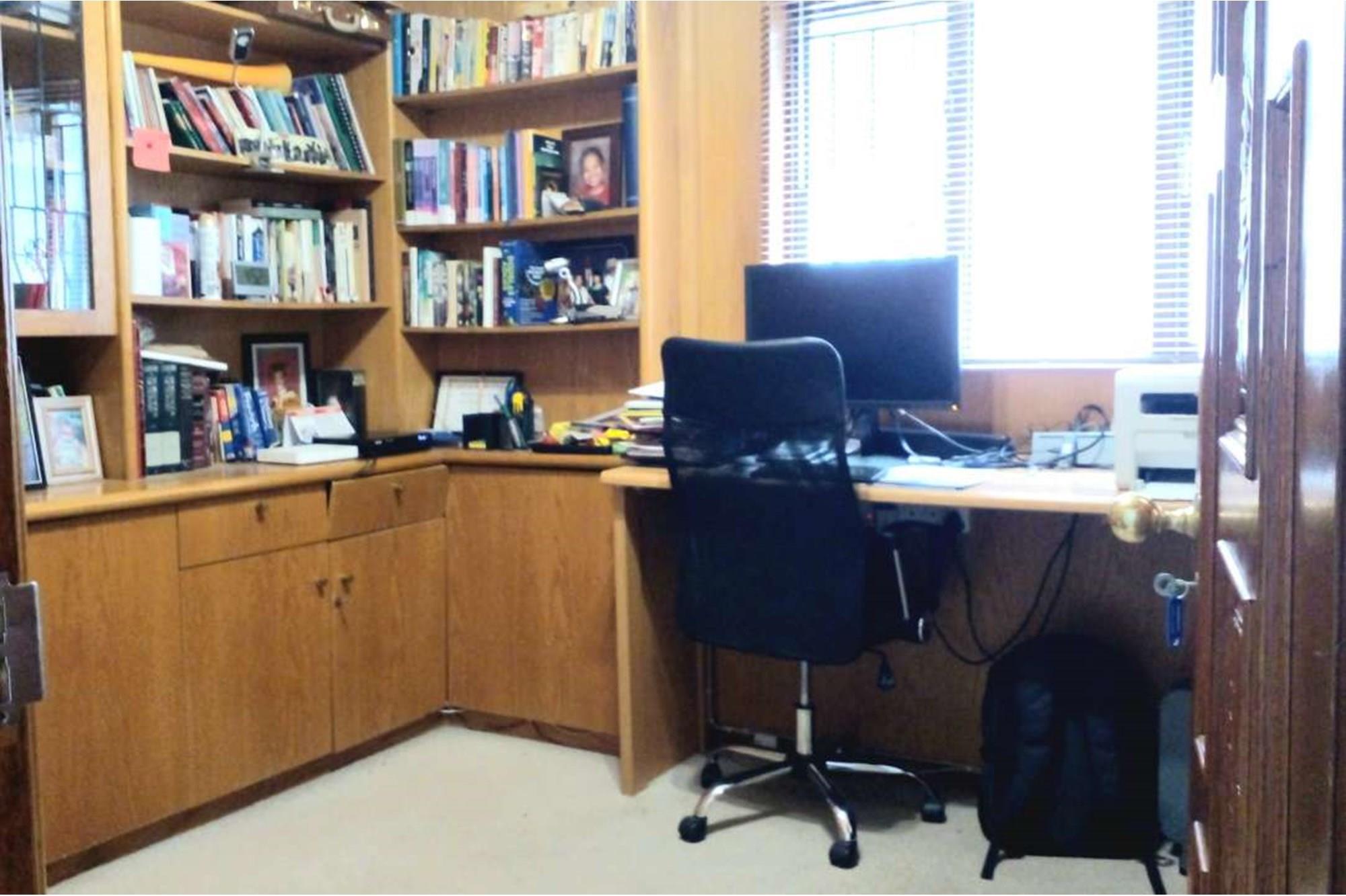 The cozy study is adjacent to the entrance hall and is lined with book shelves from floor to ceiling. The window looks out at the front entrance to the house.