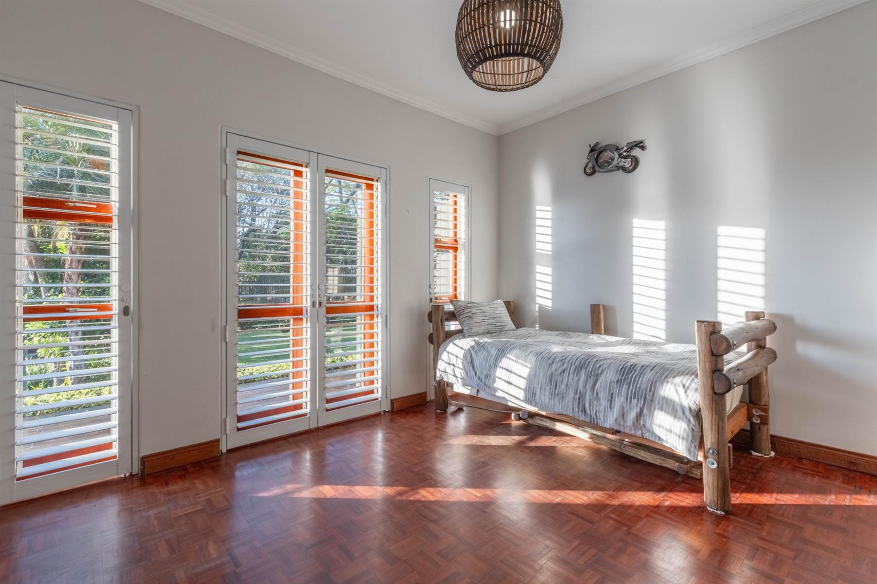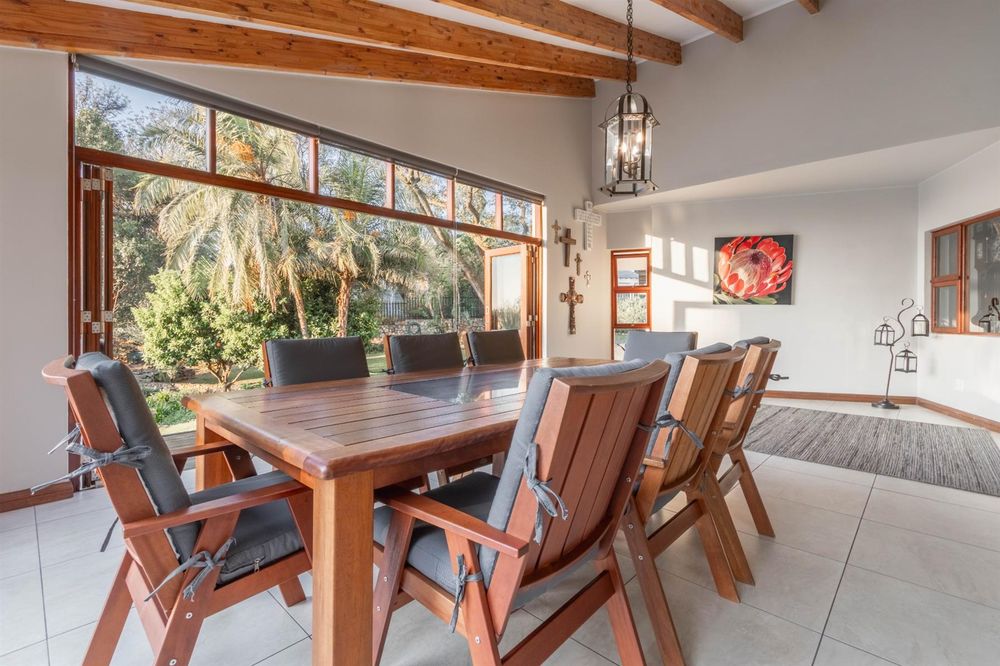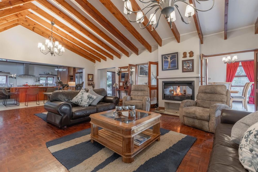 The entrance with a pivot door leads to the open-plan lounge, kitchen, sun-filled living area, and a two-sided fireplace shared with the separate dining room. The sunroom is seamlessly connected to the patio with a built-in braai. A small bar/storeroom/pantry is accessible from a short passage between the kitchen and lounge.