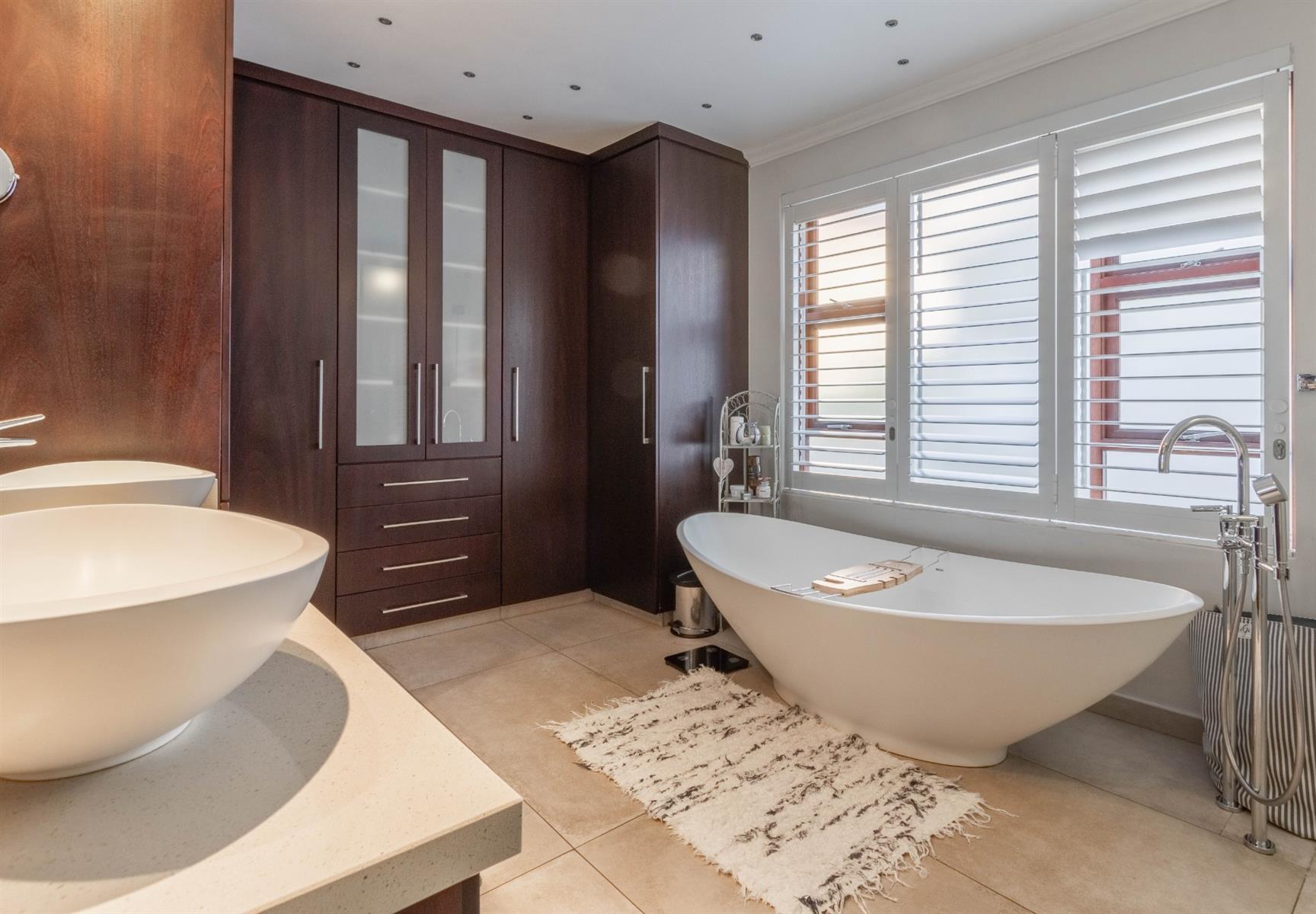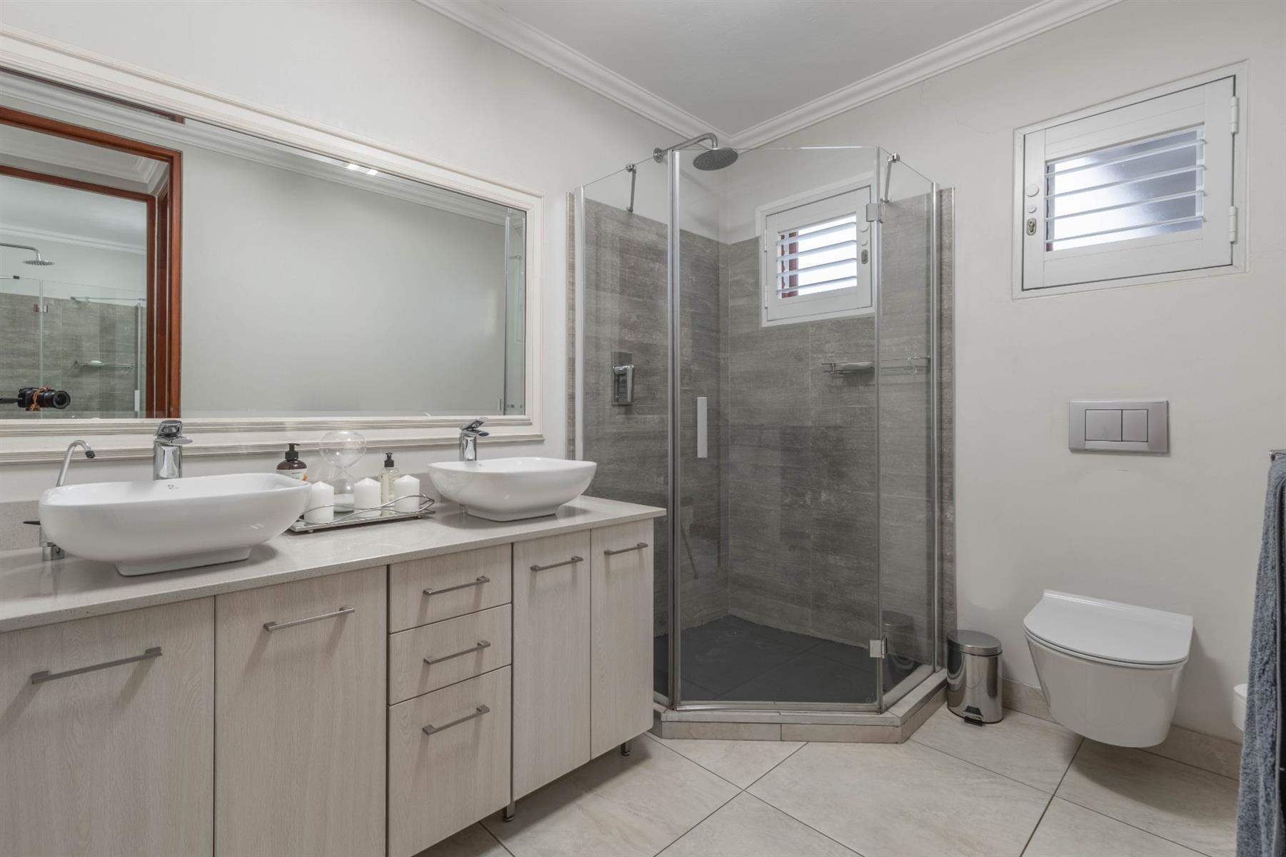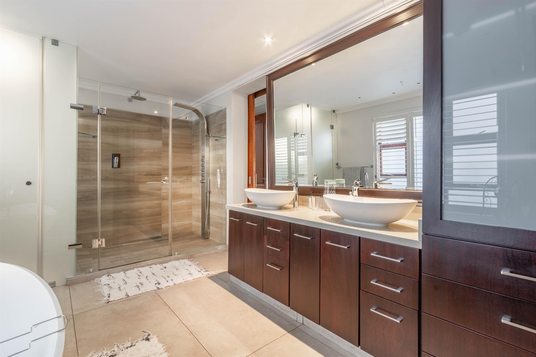 The main en-suite bathroom offers a luxurious bath, screened toilet, double shower with three different settings, double basins, and vanities. Set to the side are cupboards. The second bathroom has a shower, bath, toilet, and basin, whilst the third bathroom provides a shower, toilet, and double basins.