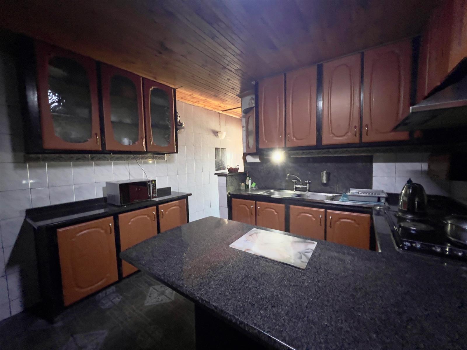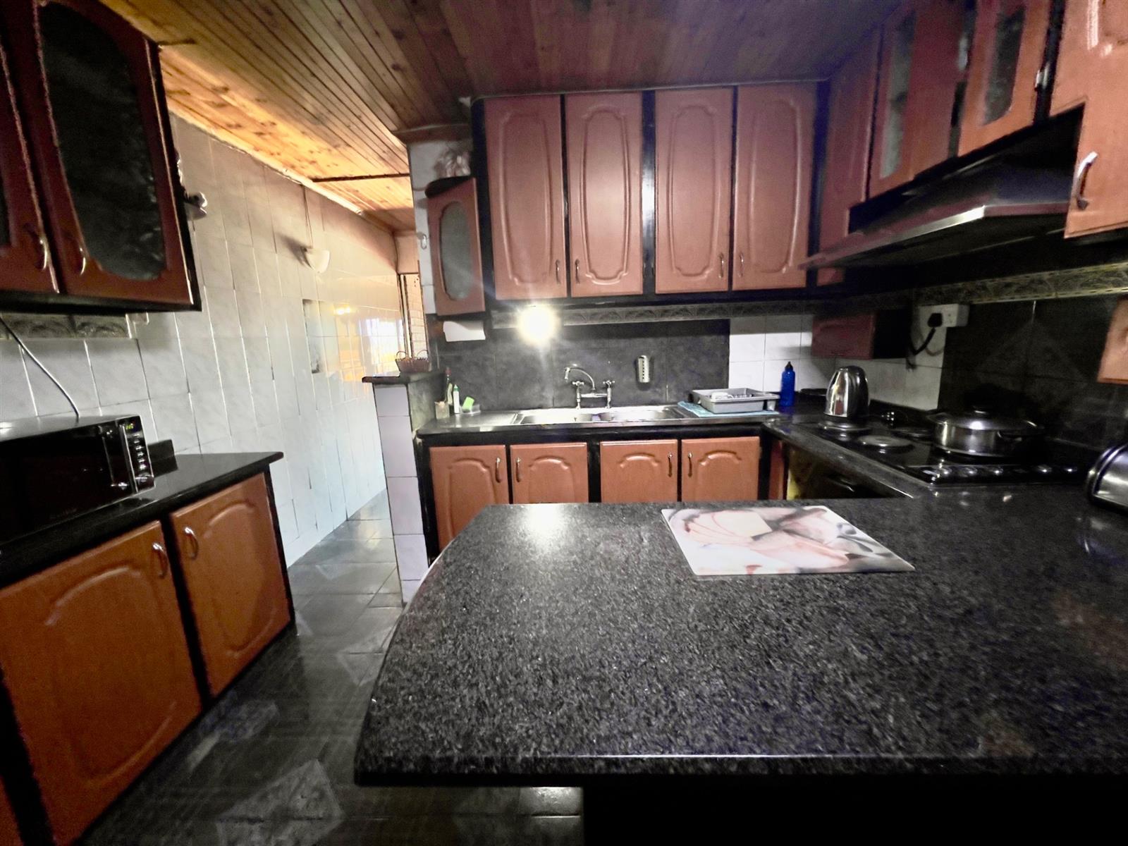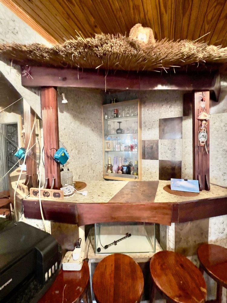 The open-plan lounge and dining area creates a warm and inviting flow, with a small bar in the corner — perfect for entertaining. The kitchen is well-designed with ample built-in cupboards, granite countertops, a hob, and an extractor fan. Beautiful pine ceilings and floor-to-wall tiles add a touch of charm and easy maintenance throughout the first level.
