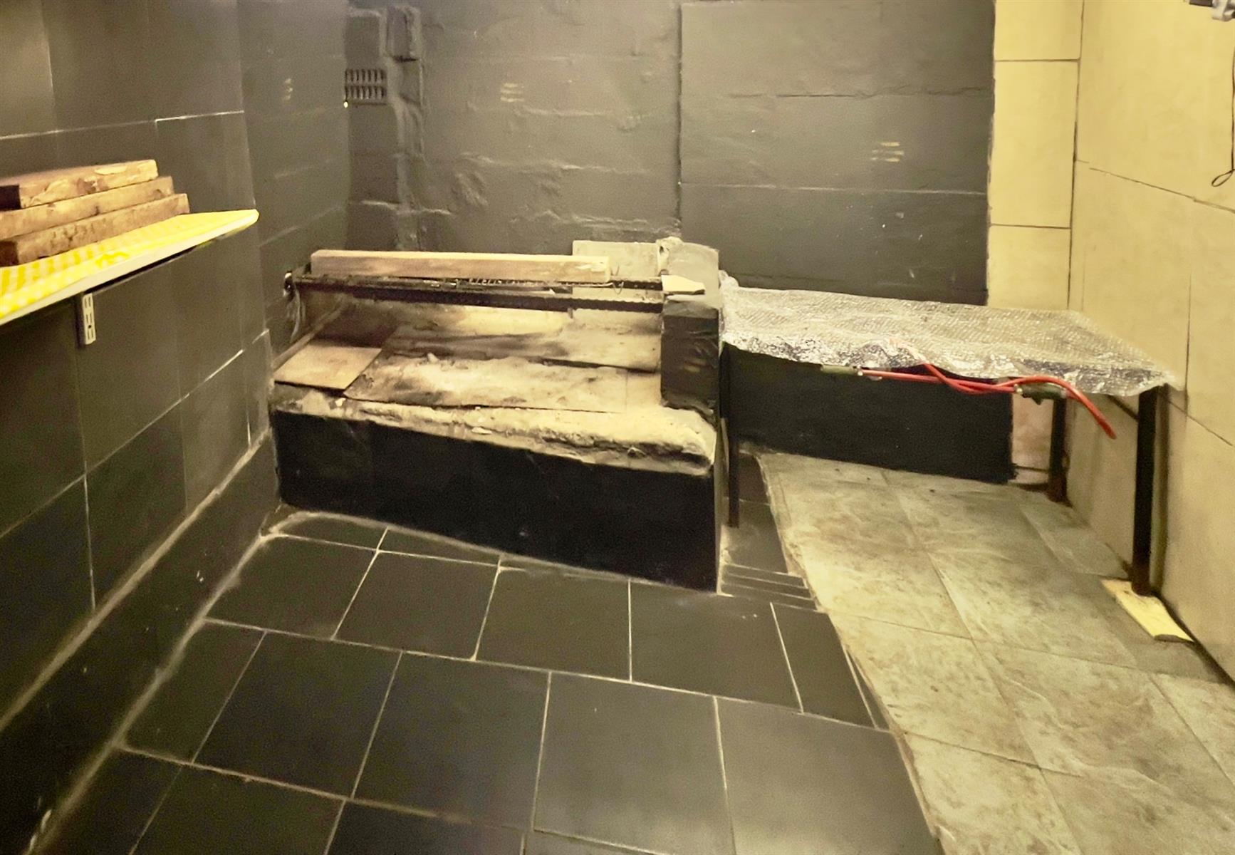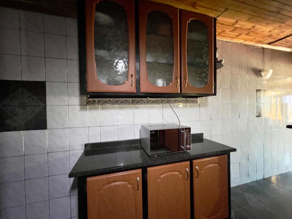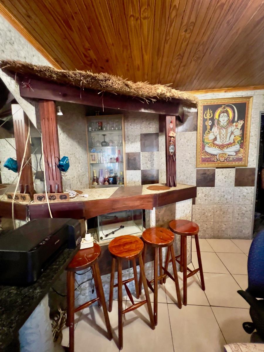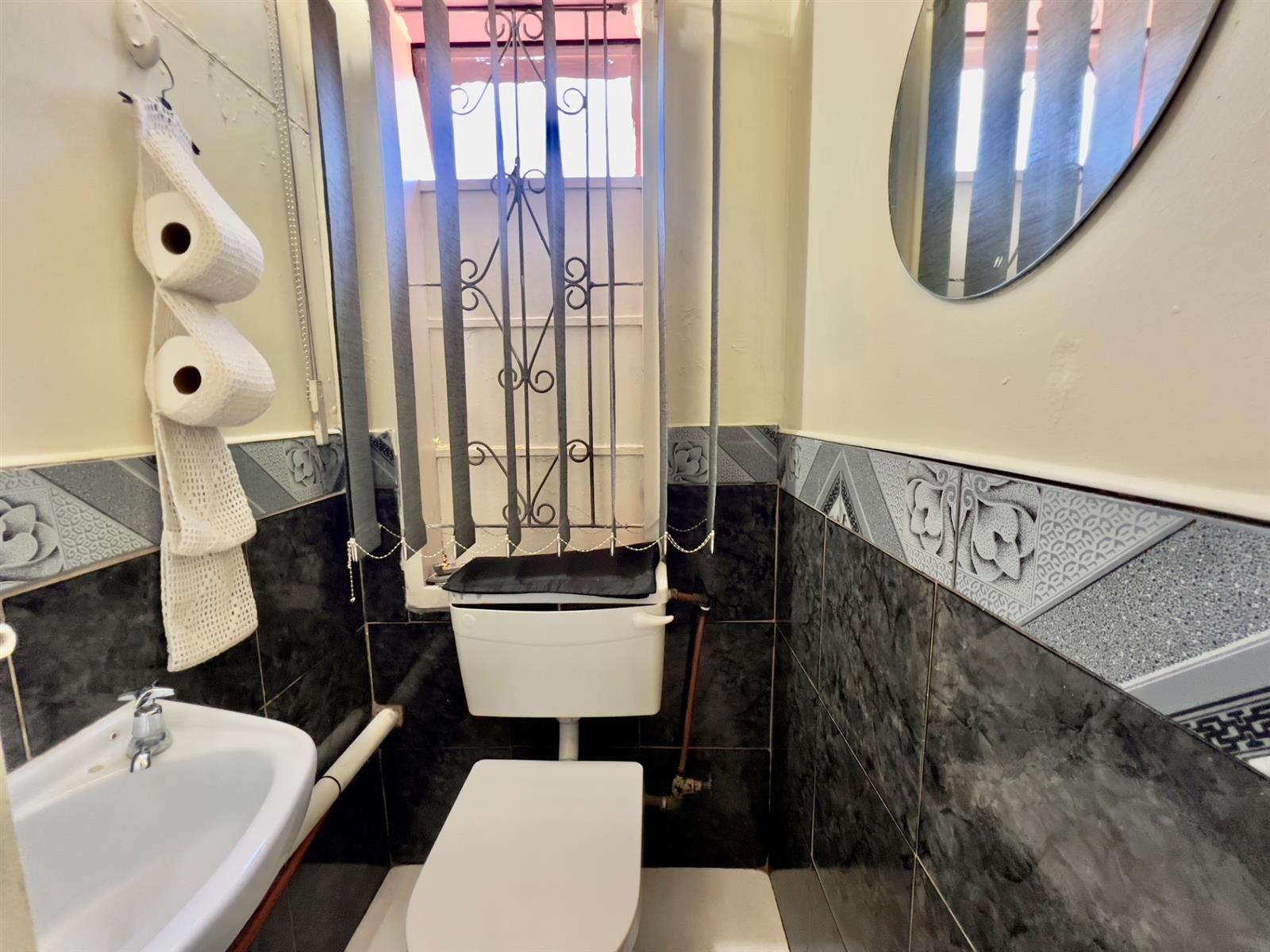 The open-plan lounge and dining area creates a warm and inviting flow, with a small bar in the corner — perfect for entertaining. The kitchen is well-designed with ample built-in cupboards, granite countertops, a hob, and an extractor fan. Beautiful pine ceilings and floor-to-wall tiles add a touch of charm and easy maintenance throughout the first level.