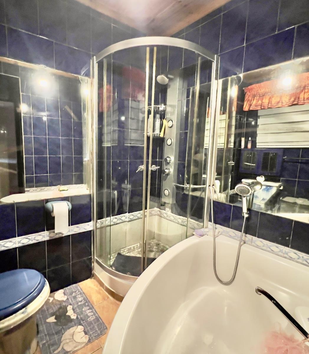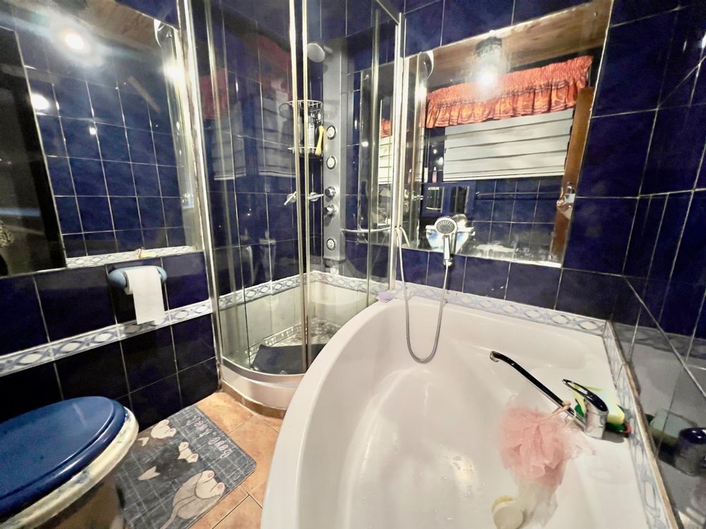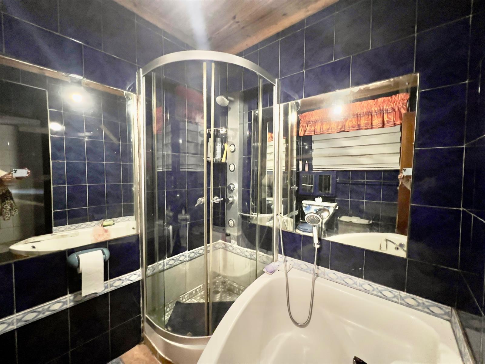 The upper level features three well-sized bedrooms, each with ceiling fans and built-in cupboards, along with a convenient guest toilet. Downstairs, you’ll find a fourth bedroom, also with built-in cupboards, as well as a modern full bathroom complete with a shower offering various settings and a large corner bathtub for ultimate relaxation.