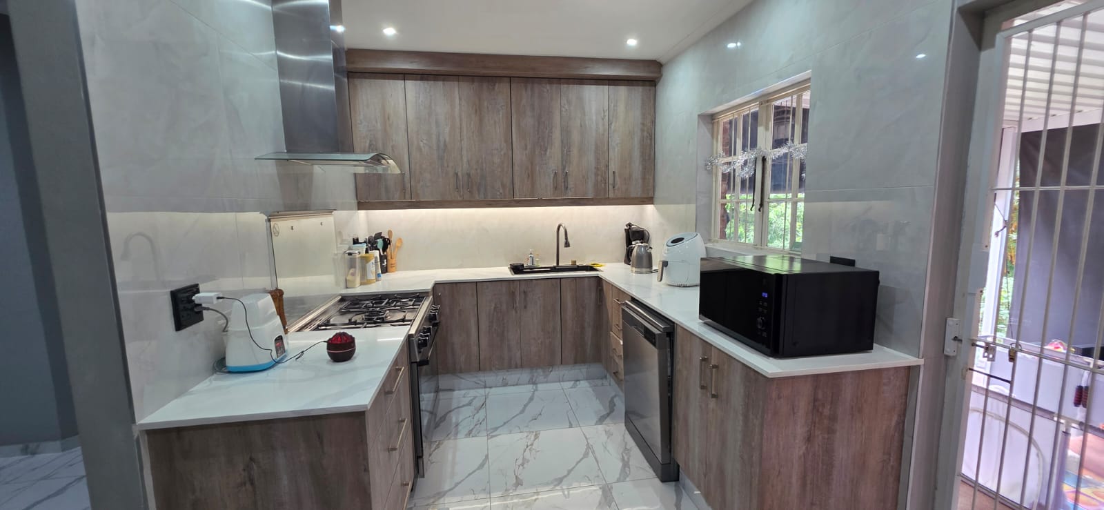 Step into the home where modern convenience meets elegant design. Imagine unwinding in a spacious living area with timeless laminate floor's flowing effortlessly throughout the home. Adorned by 2 bedroom's that come complete with built-in-cupboard's and cooling fan's, enhanced with voice activating lighting, while the 3rd bedroom could be used as an office/study, baby room or a dressing room. Whether for family meal's or casual brunch, this modern, newly done, fully fitted kitchen become's your culinary haven, complete with quartz counter top's, a gas oven and stove with extractor fan, and plumbing for a dishwasher. The modern feature's include, a black sink with a waterfall feature and snazzy tap with different setting's. The space extend's to a cosy breakfast nook, making every morning a delightful start.
