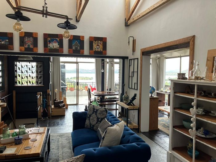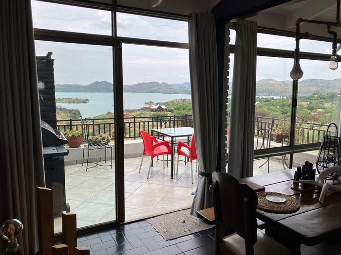 Karoo damfront retreat overlooking Vanderkloof Dam and Rolfontein Nature Reserve, with panoramic deck and built‑in braai, open‑plan lounges with fireplace — five bedrooms, covered parking.