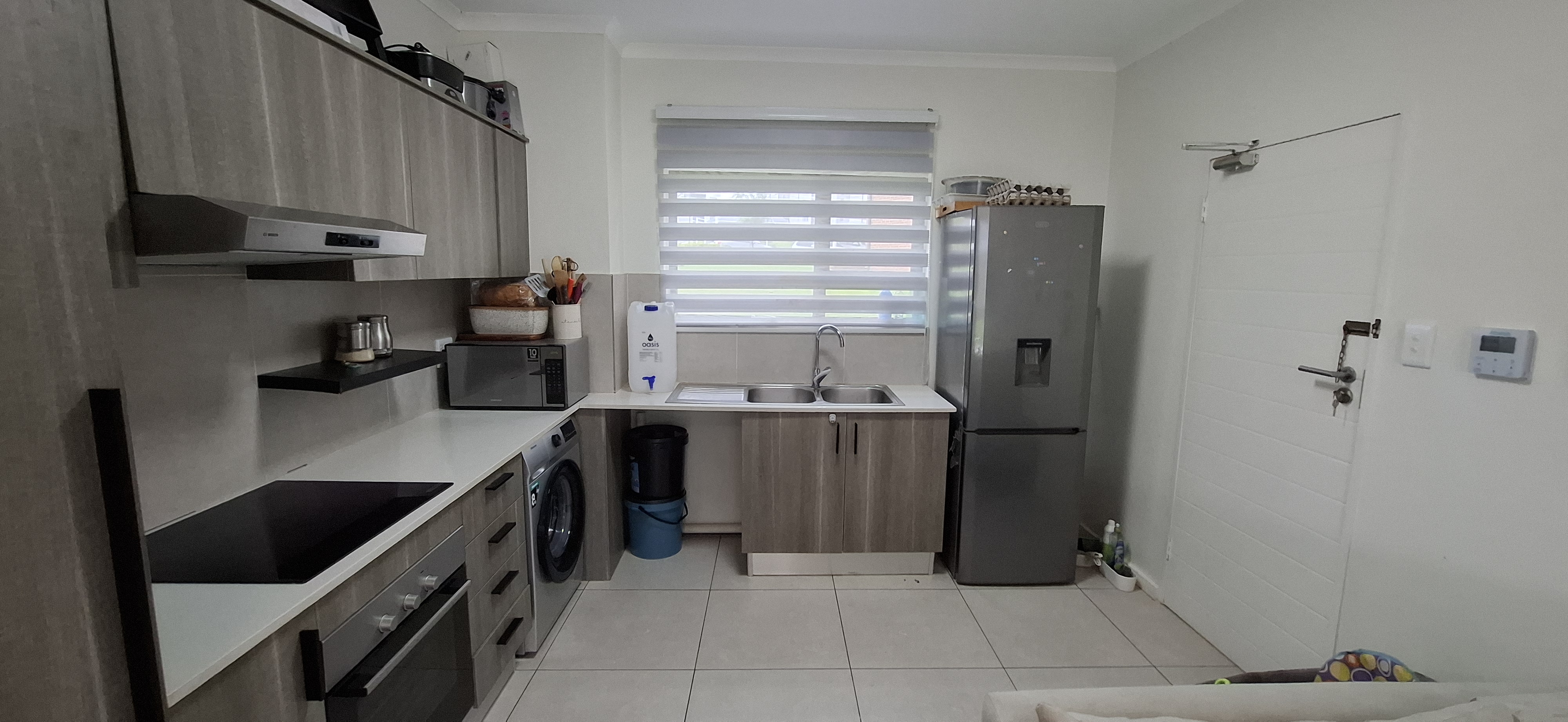 The unit features a tiled, open-plan kitchen and lounge that flows seamlessly onto a covered patio and a lovely private garden, ideal for relaxing or entertaining. The modern kitchen is finished with contemporary fittings and offers space for both a washing machine and a dishwasher.