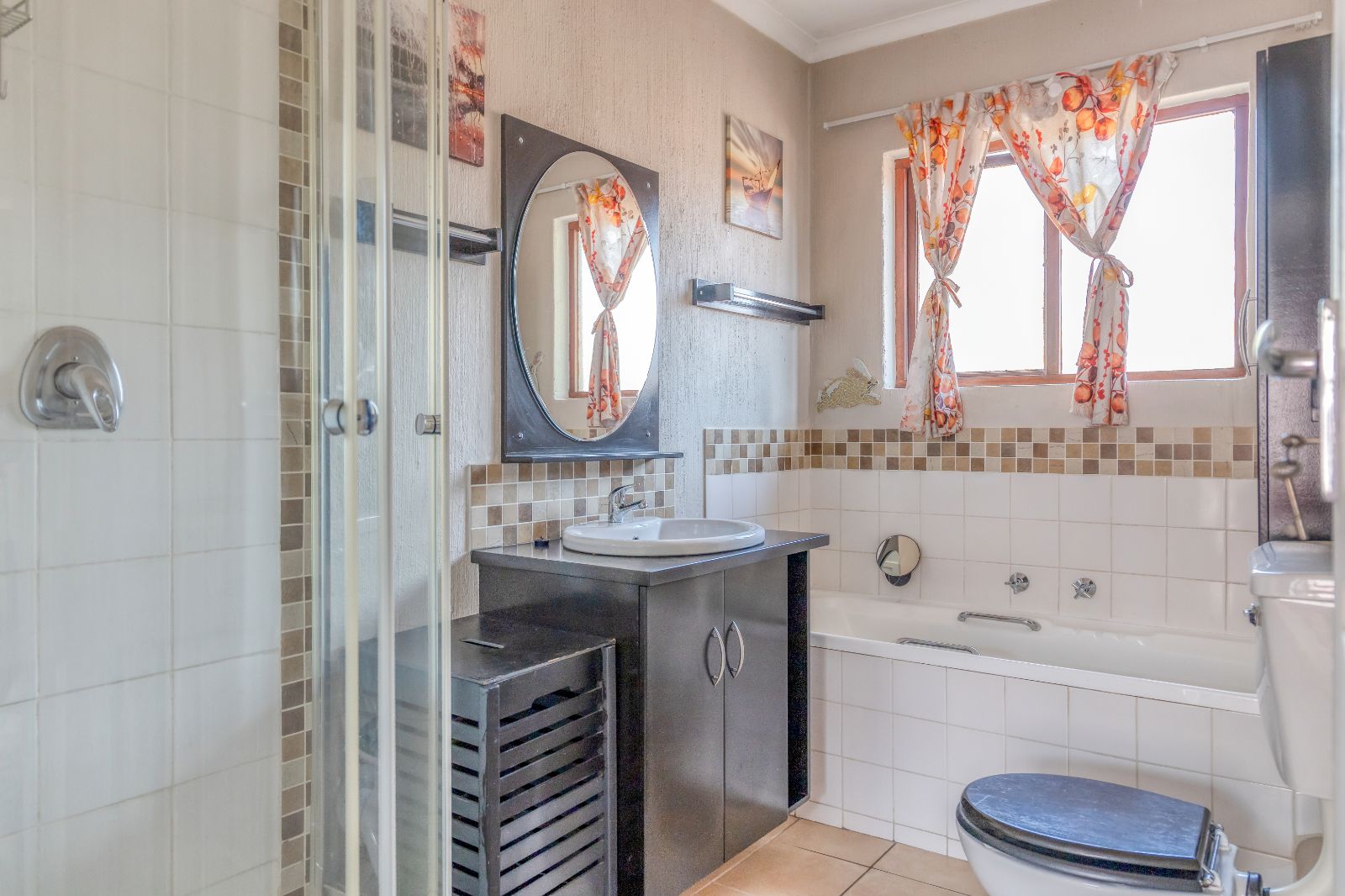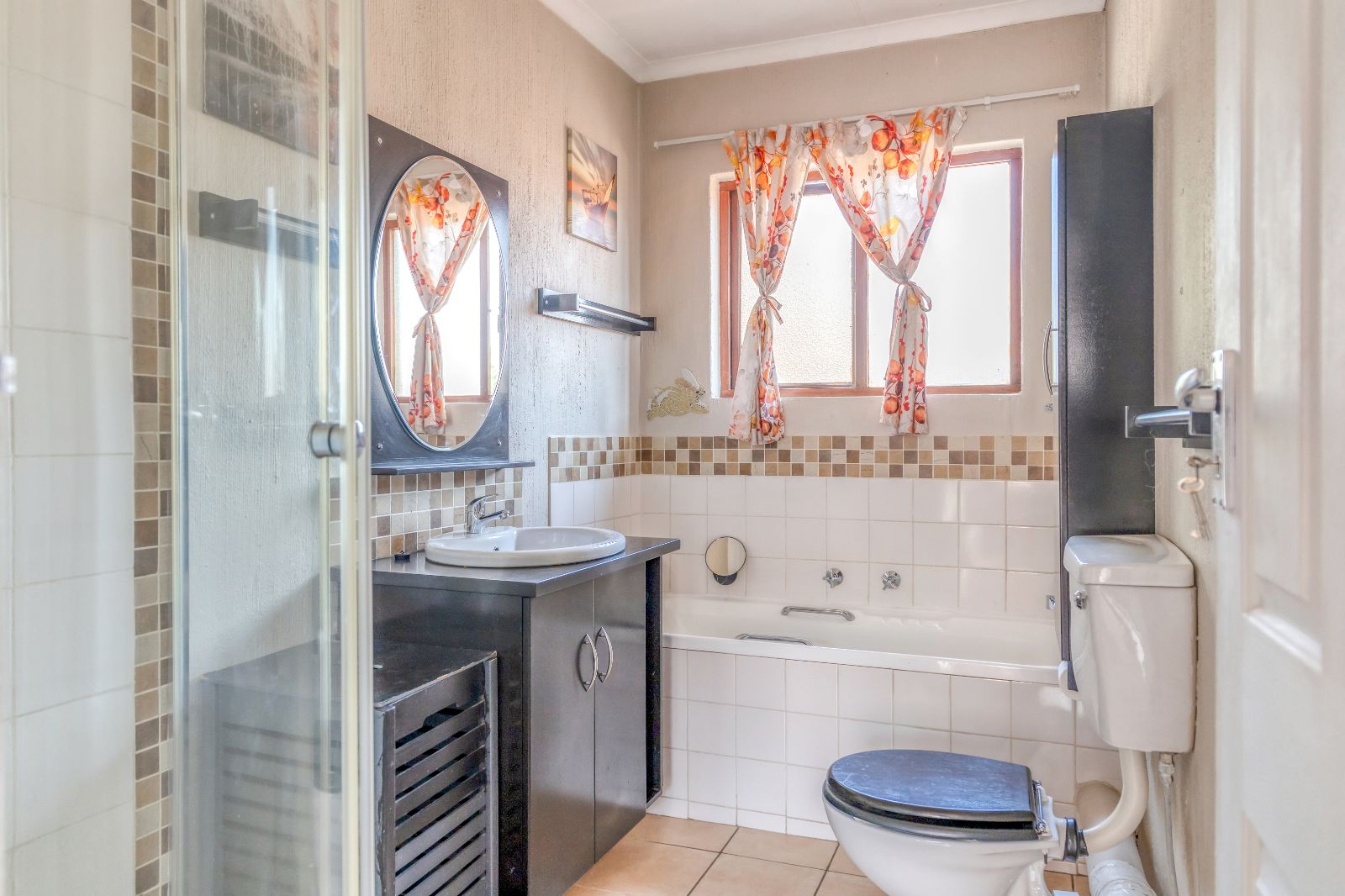 The full bathroom is beautifully tiled and includes a shower, bathtub, hand basin and water closet. – ensuring comfort and functionality in one elegant space.