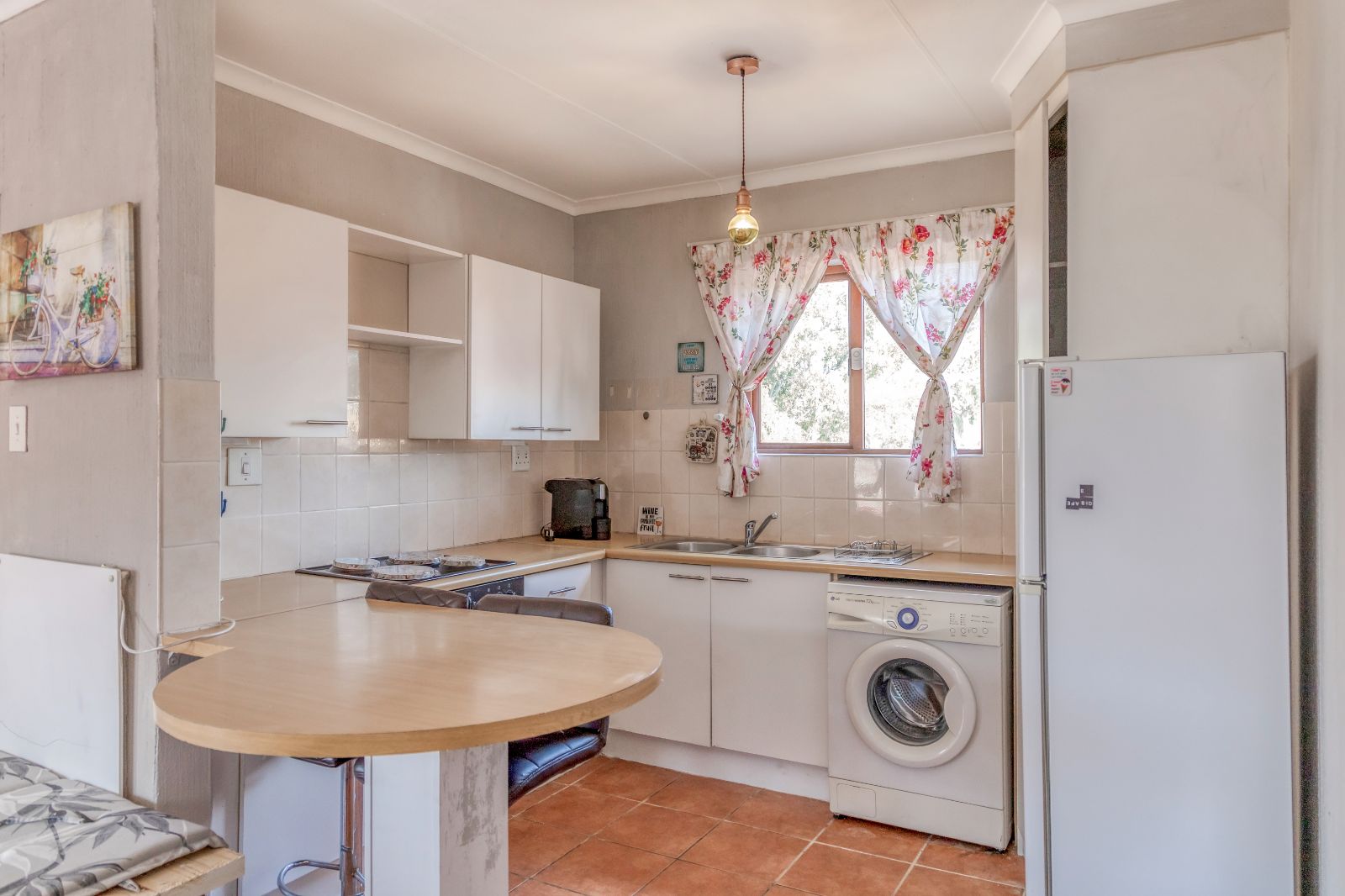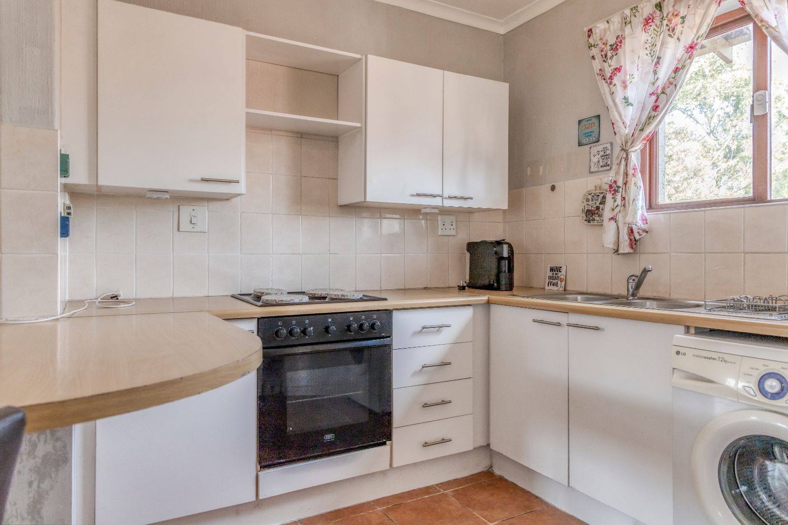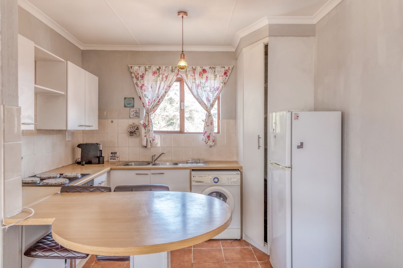 The well-appointed kitchen features ample built-in cupboards, an under-counter oven and hob, and space for one under-counter appliance and a refrigerator. A spacious corner pantry cupboard adds to the kitchen’s practicality, providing abundant storage.