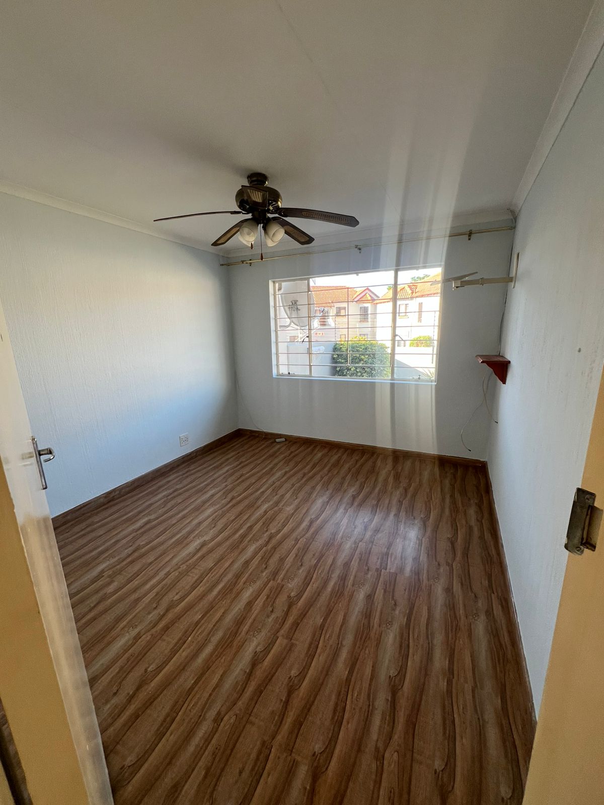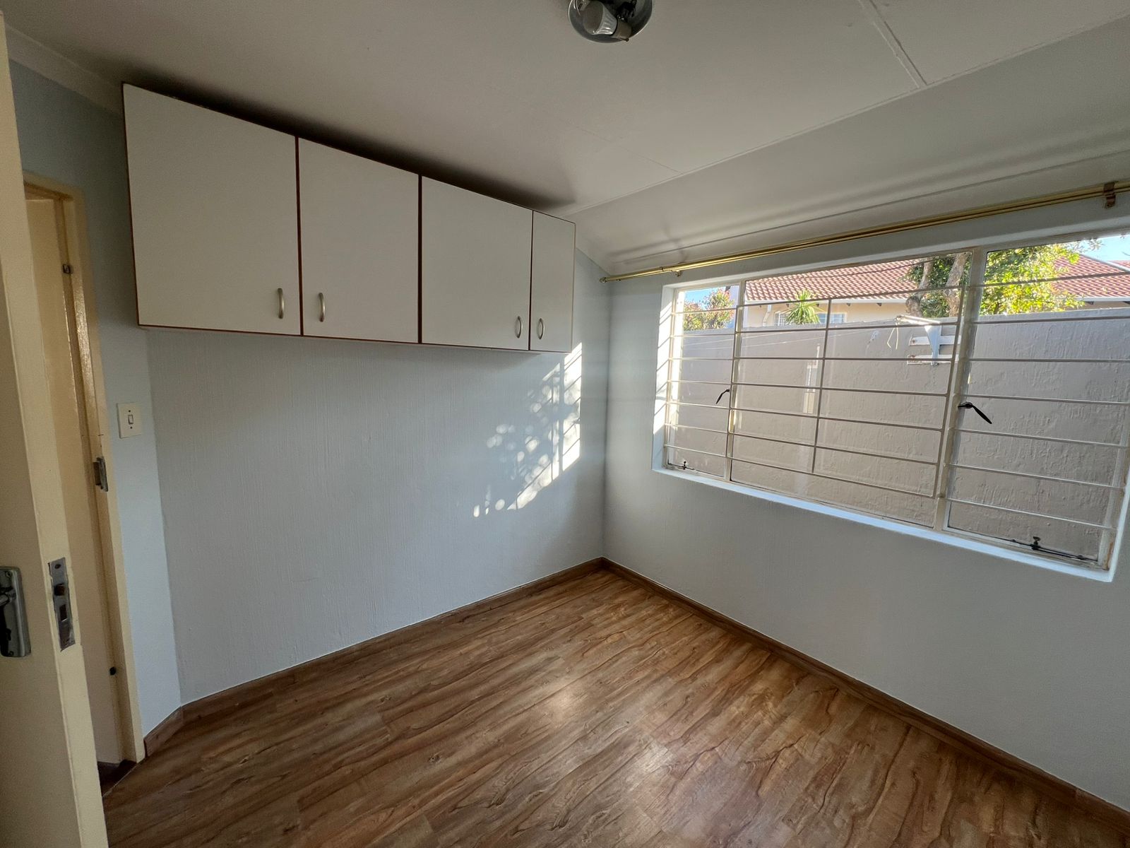 Both bedrooms have built-in cupboards, and the lounge has laminated floors.