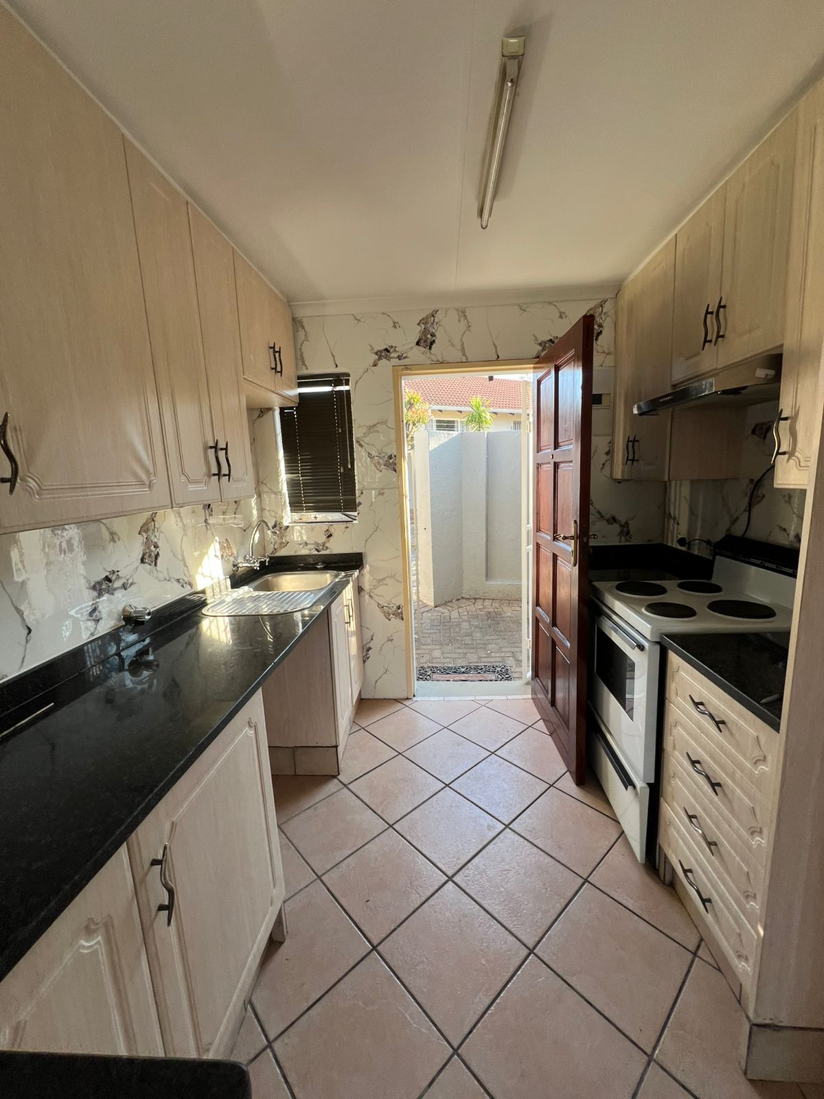 This two-bedroom townhouse has an open-plan kitchen with granite tops, built-in cupboards, a stove with under-counter space for one appliance, and room for a standard fridge.