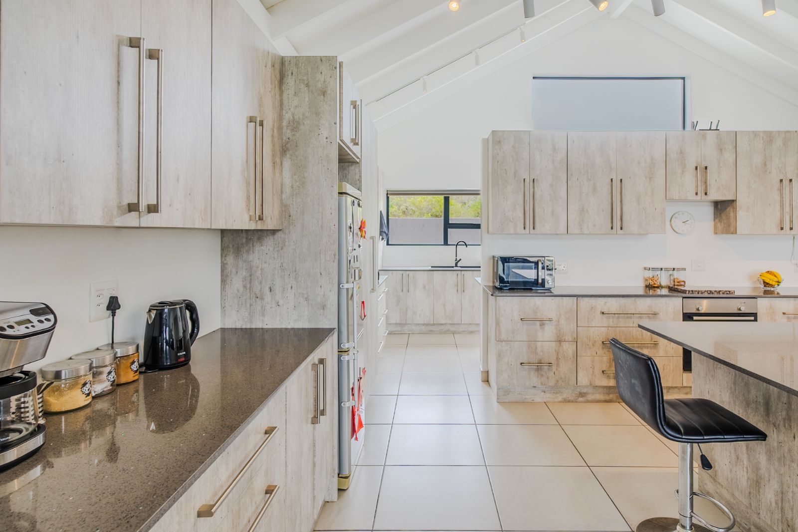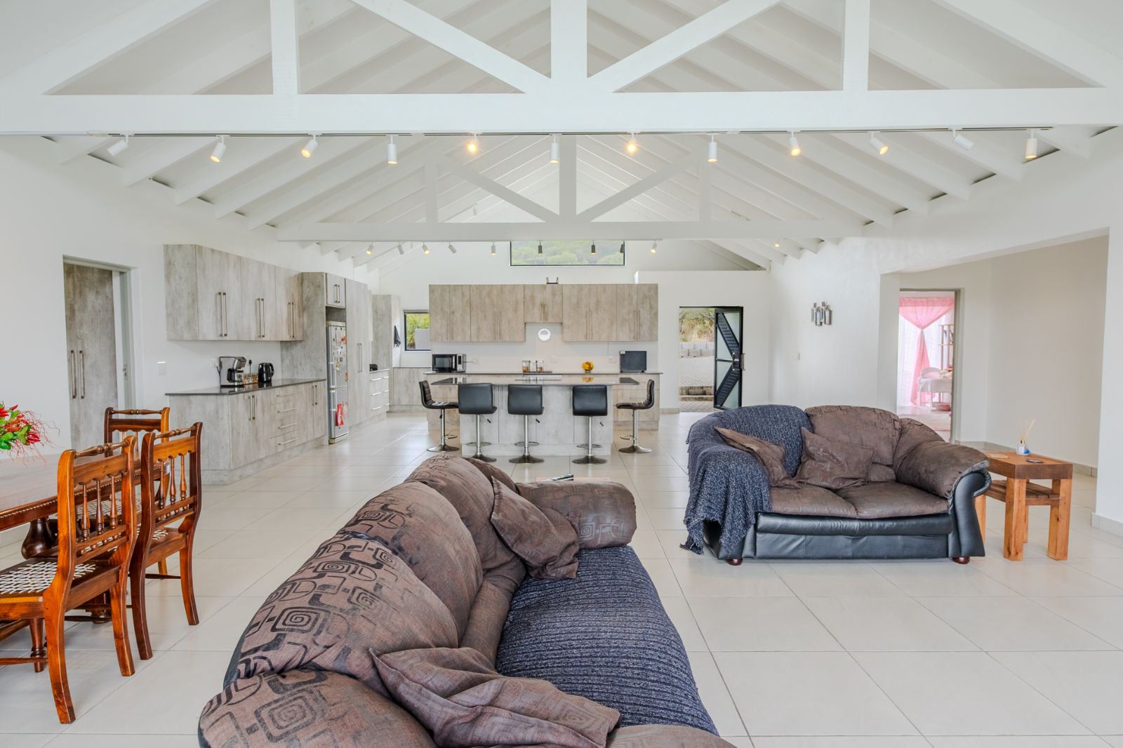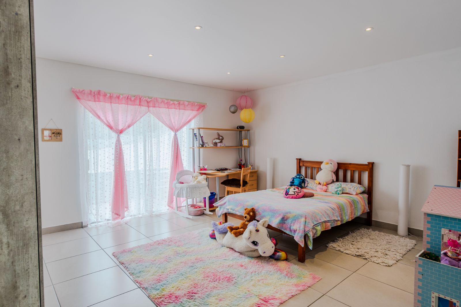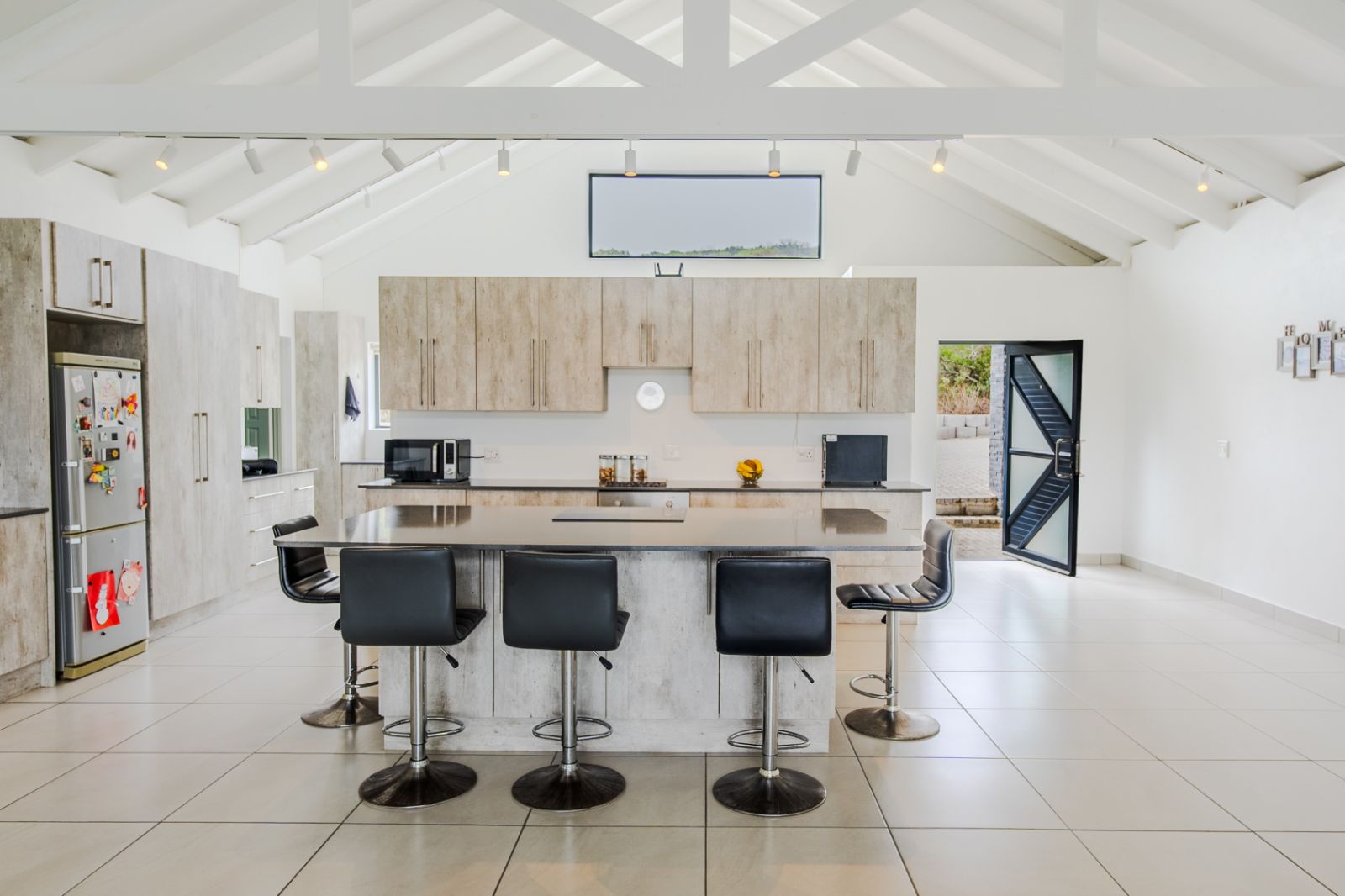 This spacious home boasts large open-plan areas and generously sized bedrooms. The living, dining, and kitchen areas feature double-volume ceilings, with natural light streaming through skylights and sliding doors. The modern kitchen is highlighted by elegant Caesarstone countertops, a central island, and a separate scullery for added convenience.