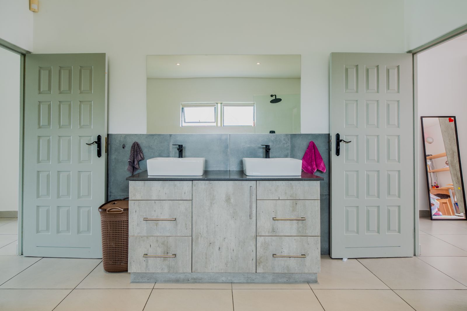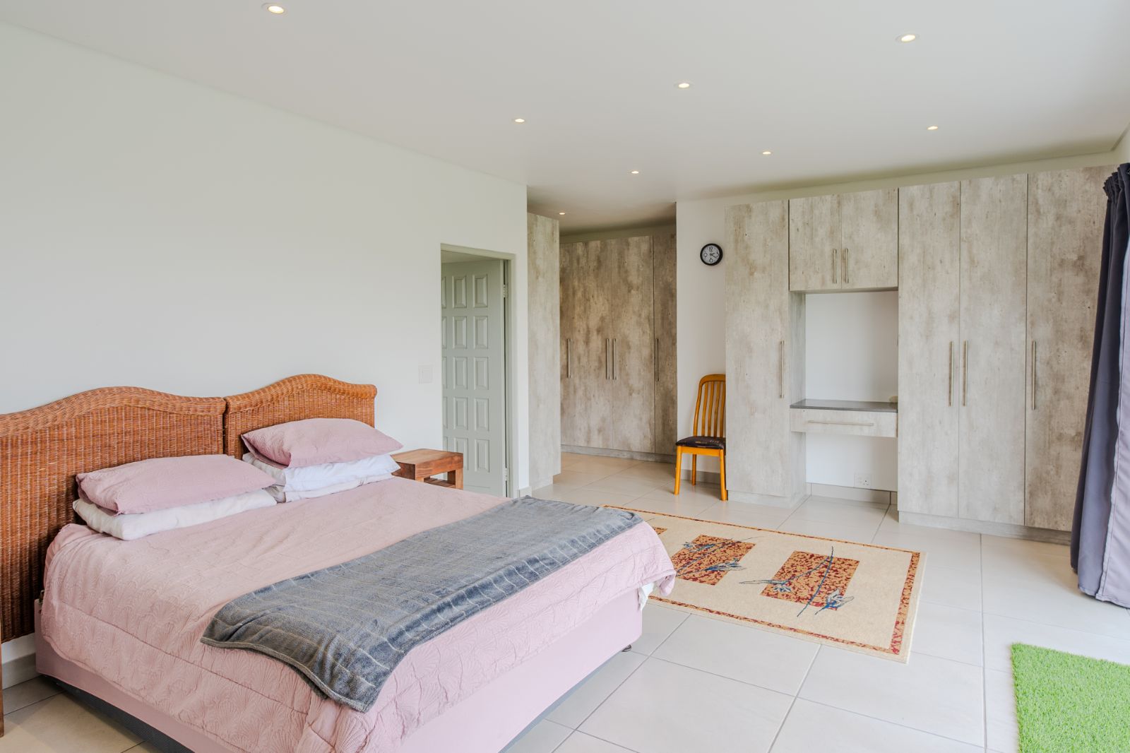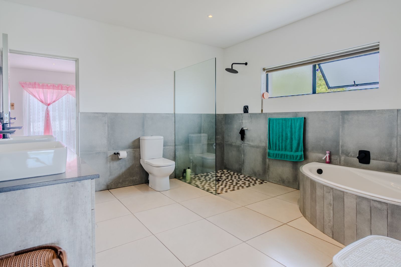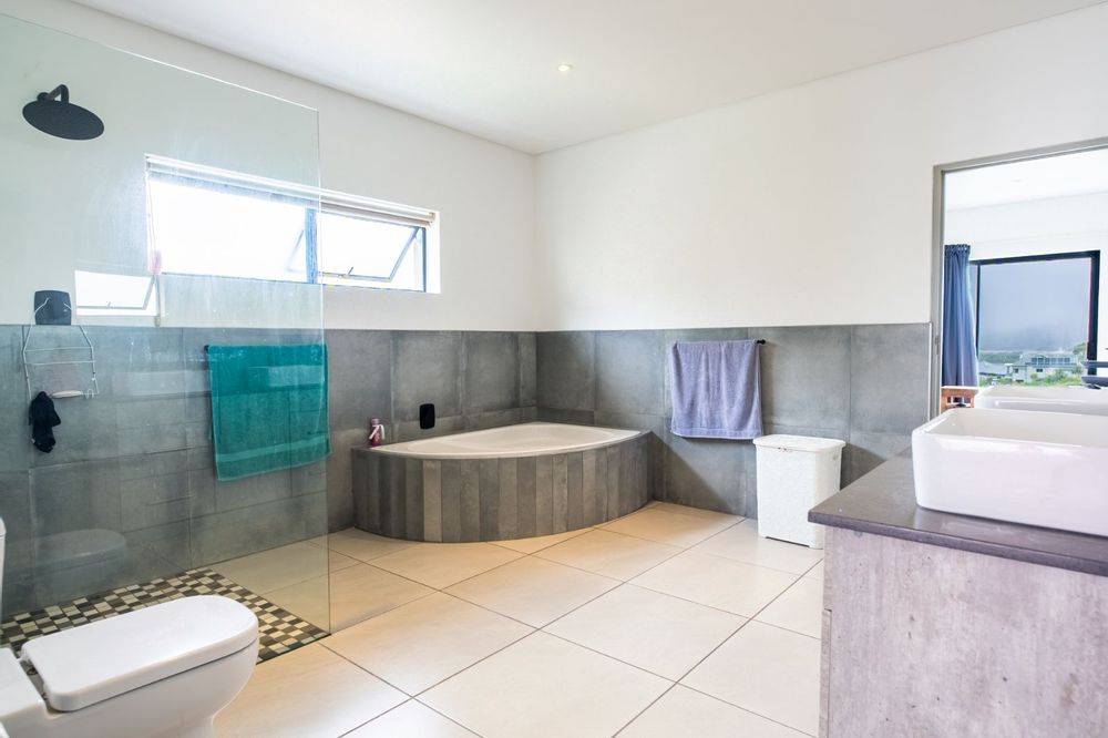 This spacious home boasts large open-plan areas and generously sized bedrooms. The living, dining, and kitchen areas feature double-volume ceilings, with natural light streaming through skylights and sliding doors. The modern kitchen is highlighted by elegant Caesarstone countertops, a central island, and a separate scullery for added convenience.