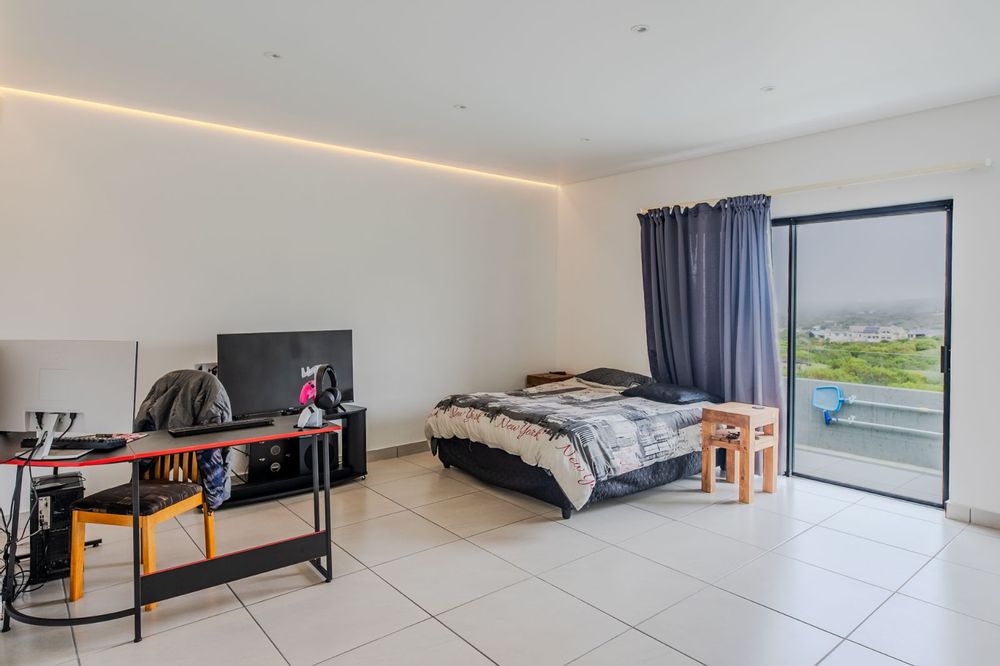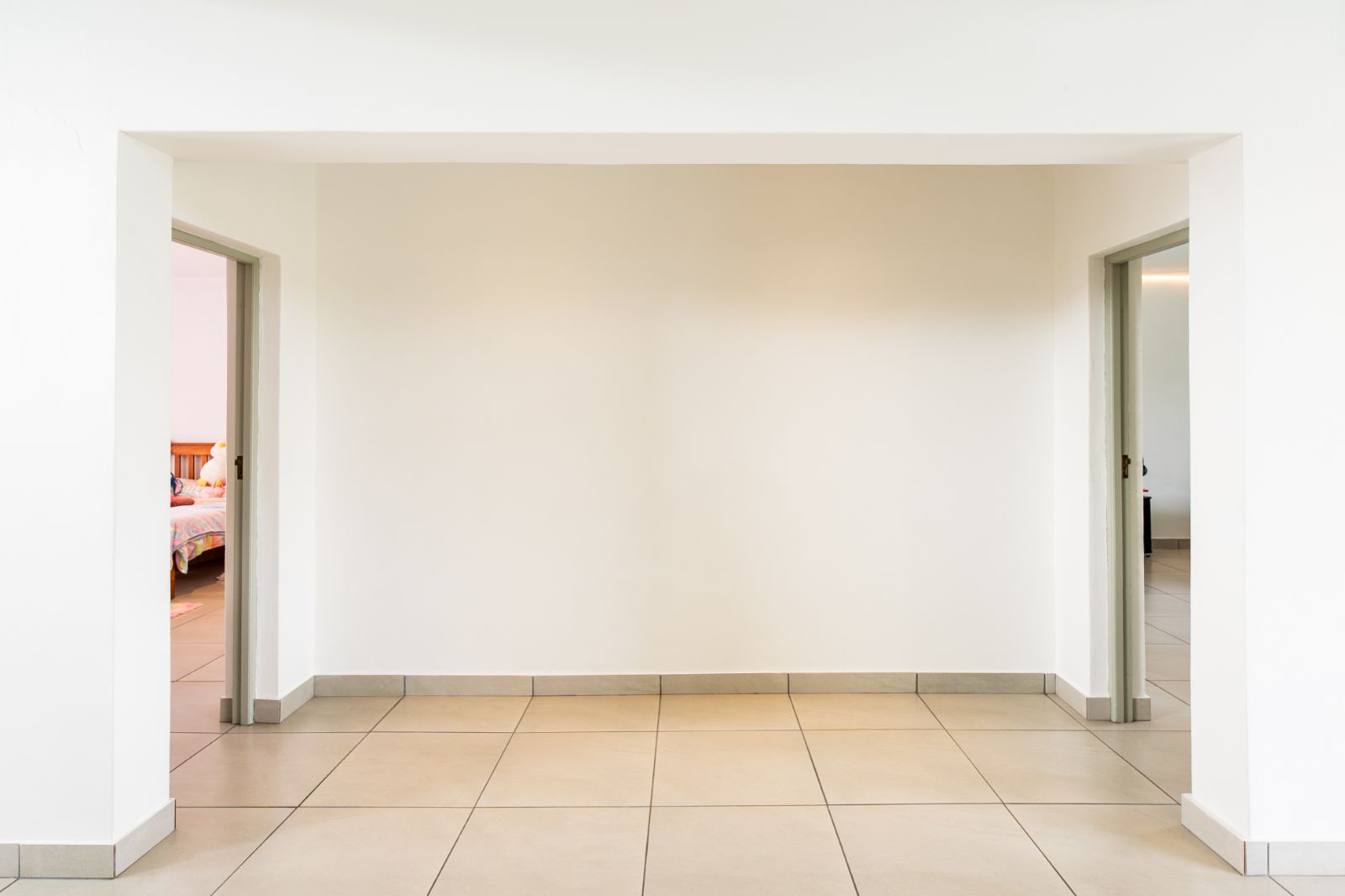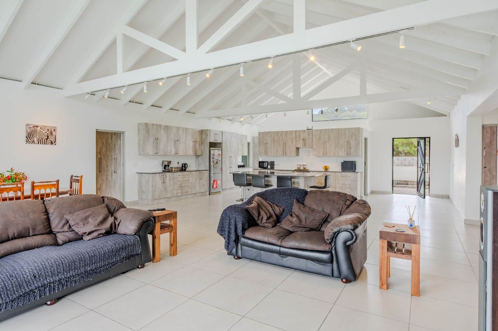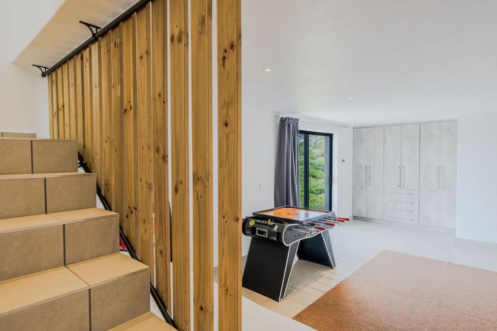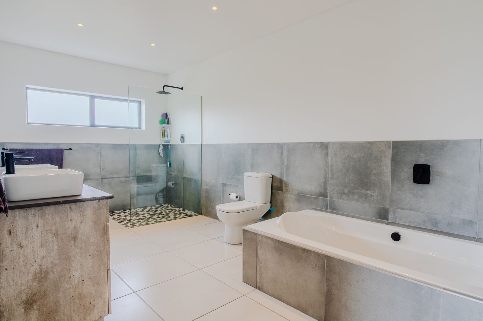 This spacious home boasts large open-plan areas and generously sized bedrooms. The living, dining, and kitchen areas feature double-volume ceilings, with natural light streaming through skylights and sliding doors. The modern kitchen is highlighted by elegant Caesarstone countertops, a central island, and a separate scullery for added convenience.