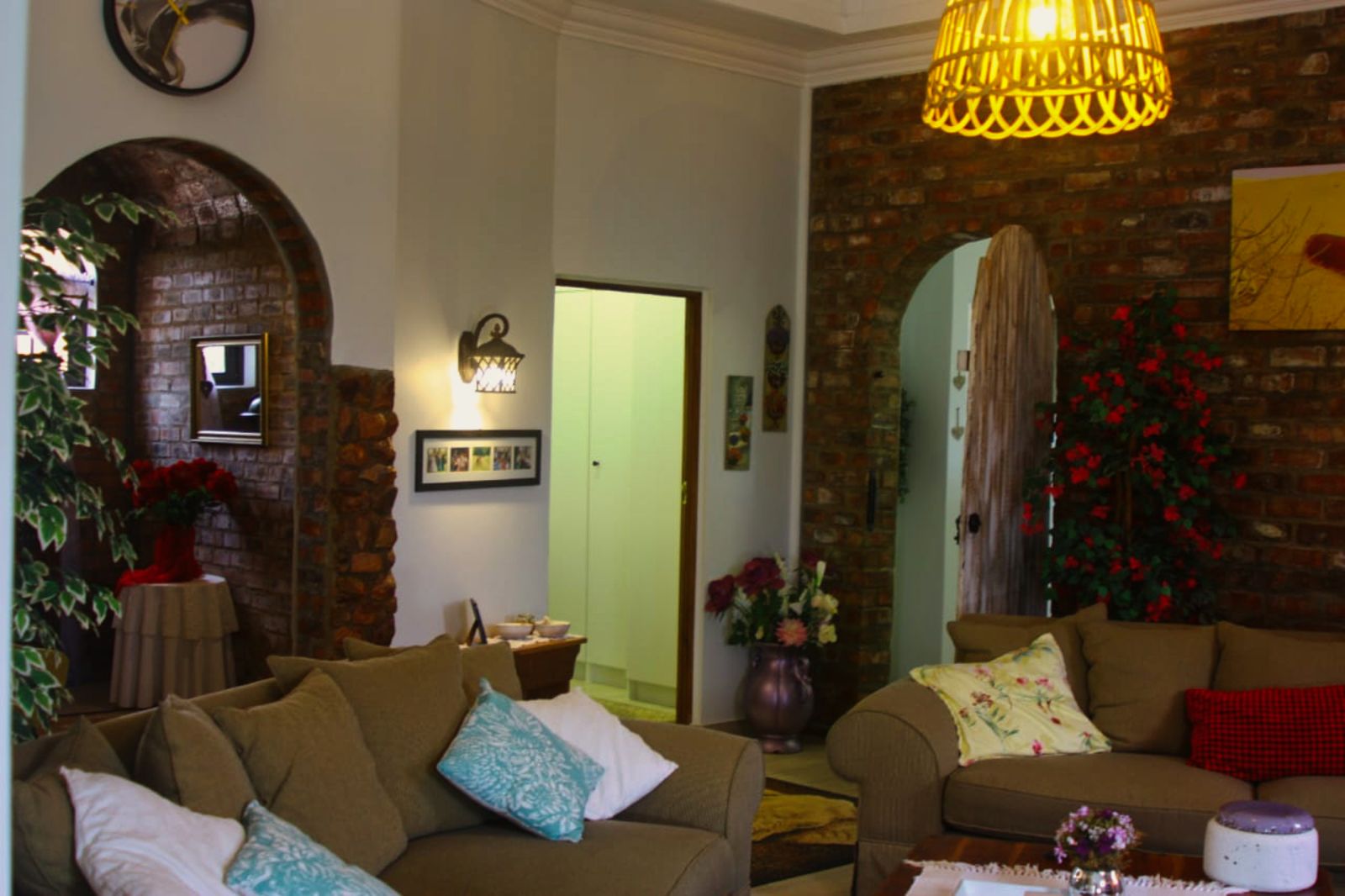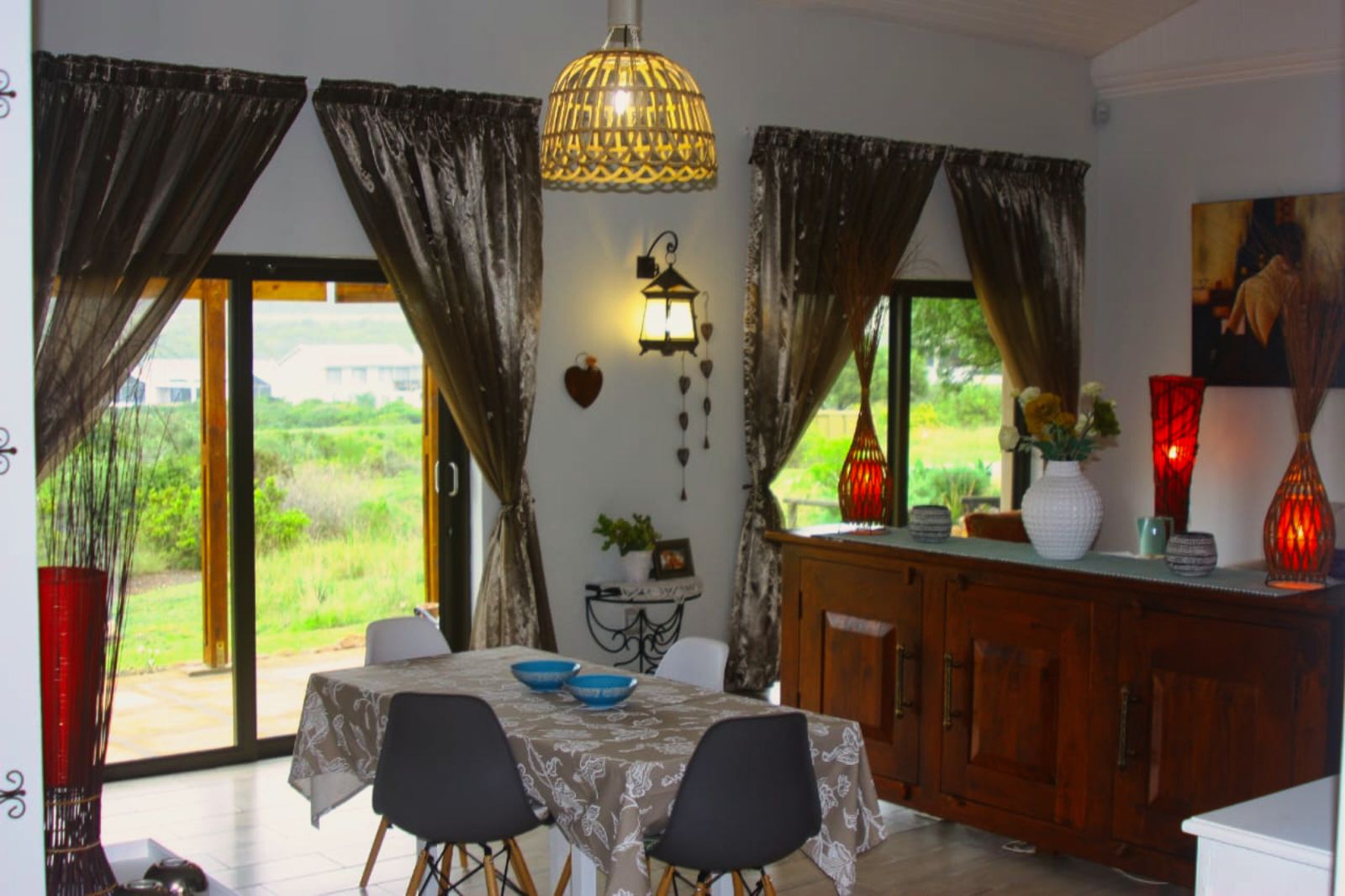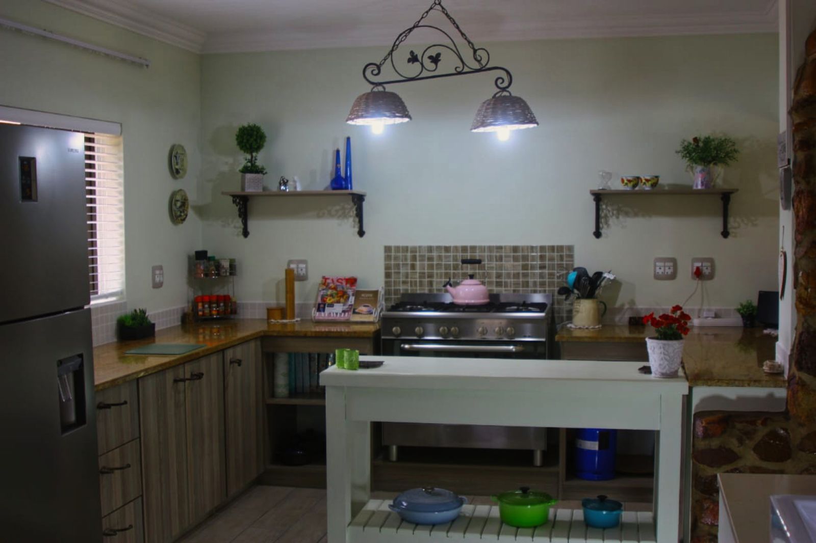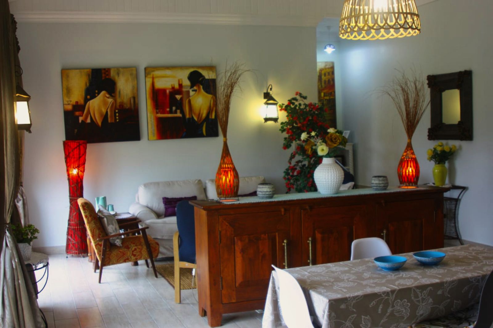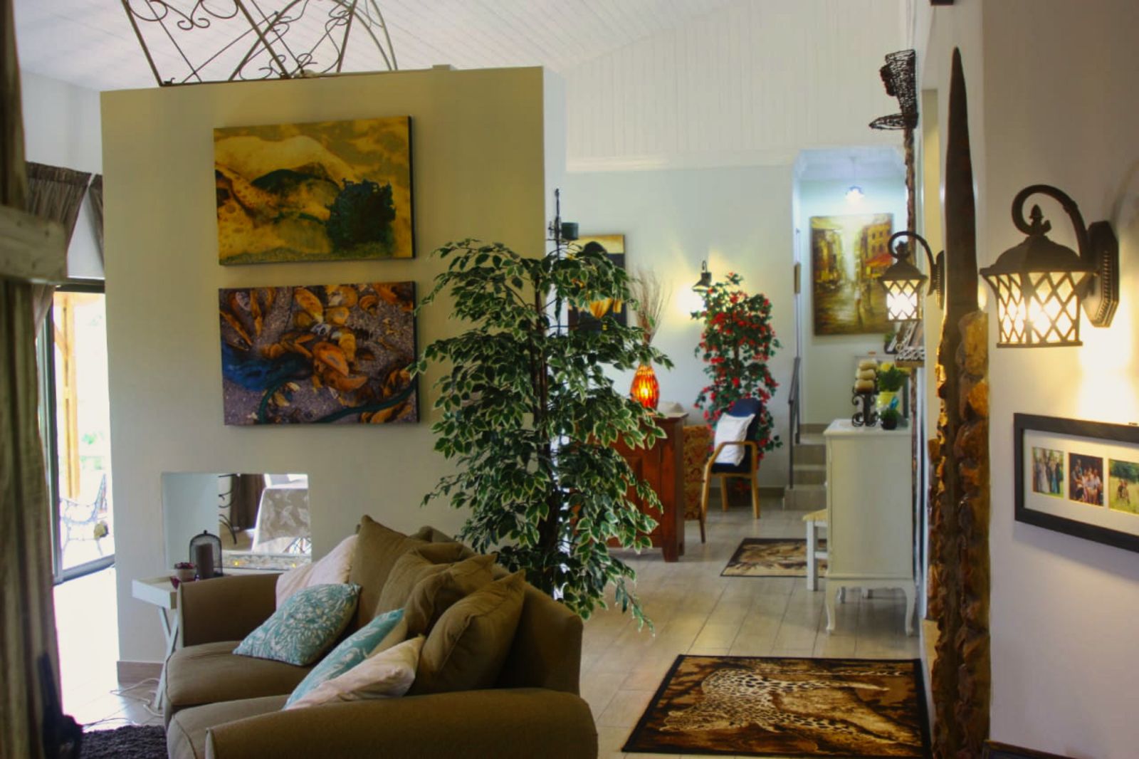 Step inside to a light-filled open-plan living area, where the family lounge and dining room flow seamlessly together, centred around a charming fireplace—perfect for cosy evenings. Large sliding doors open onto the outdoor patio, creating effortless indoor-outdoor living with uninterrupted views of the indigenous greenery. Enjoy regular sightings of springbok, bushbuck, and abundant birdlife moving freely through the estate.