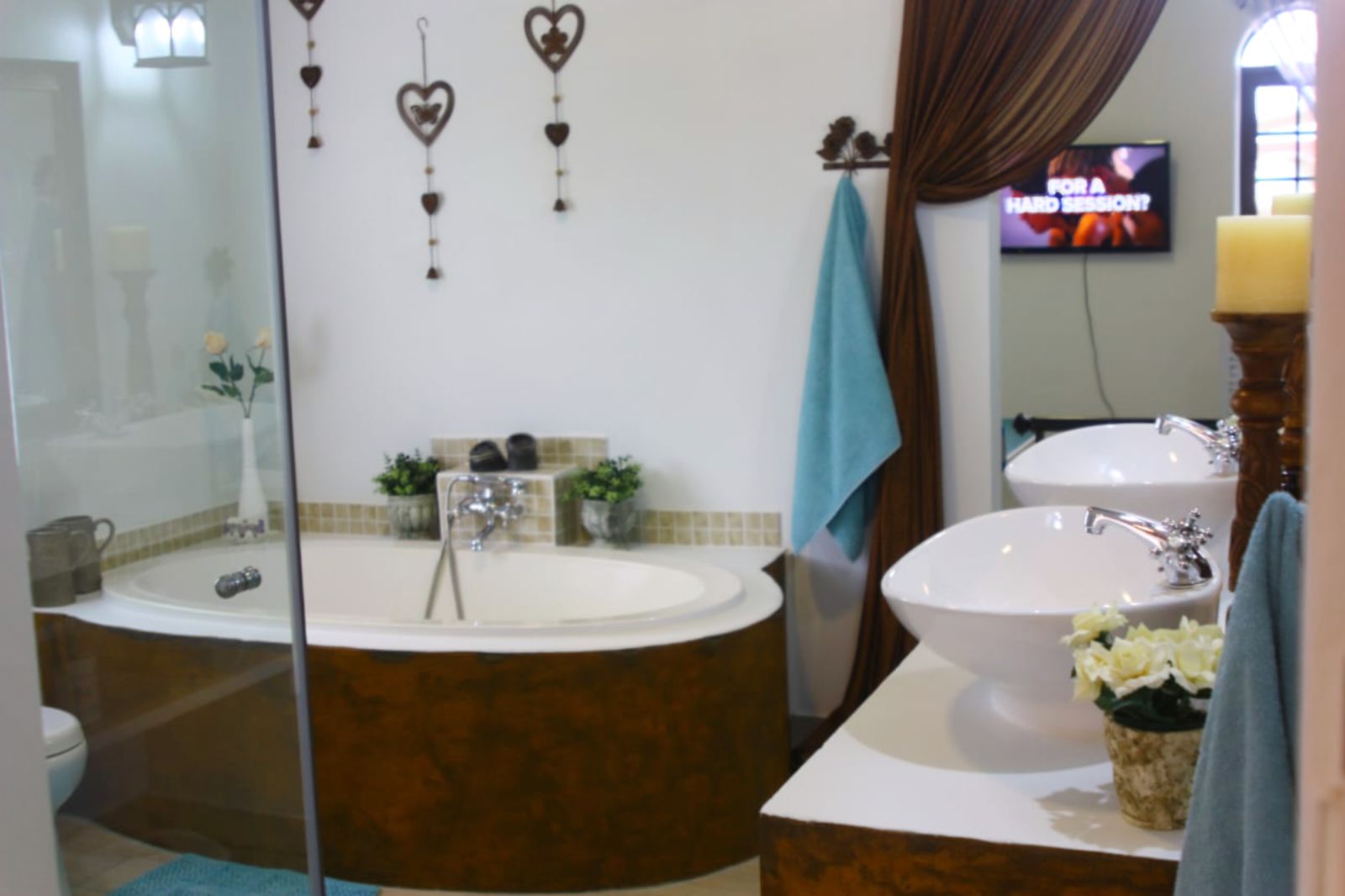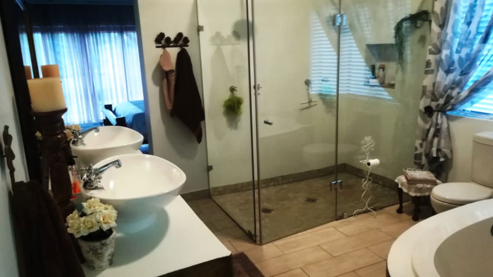 To the right of the entrance, you’ll find a well-appointed kitchen with ample storage, complemented by a separate scullery. A door leads to the enclosed braai area, ideal for year-round entertaining, with direct access to the double automated garage.