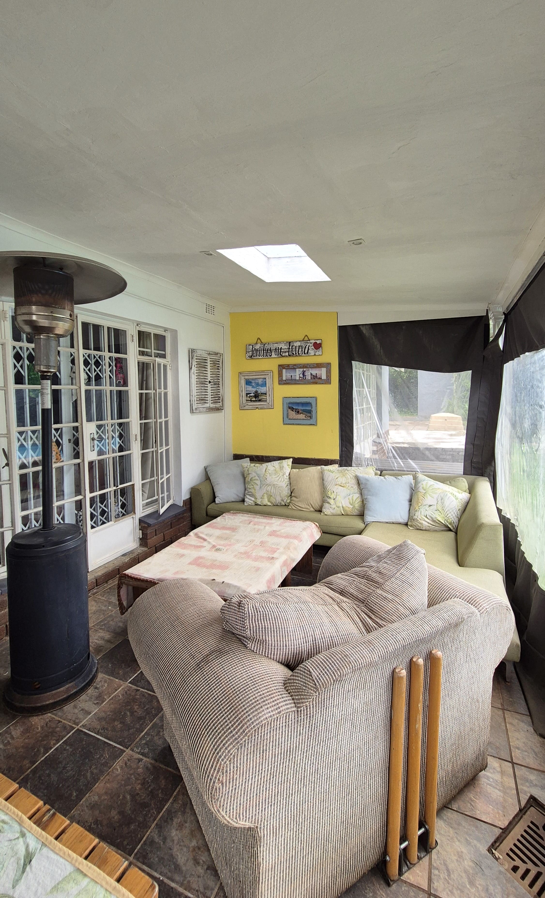 At the heart of the home is a spacious family lounge with an anthracite heater. French doors open onto an outdoor patio overlooking a manicured garden and sparkling swimming pool. To the side, a covered entertainment veranda with roll-down canvas blinds allows for year-round entertaining. The lush garden and flowing lawn create a peaceful outdoor setting for family time or relaxed weekends at home.