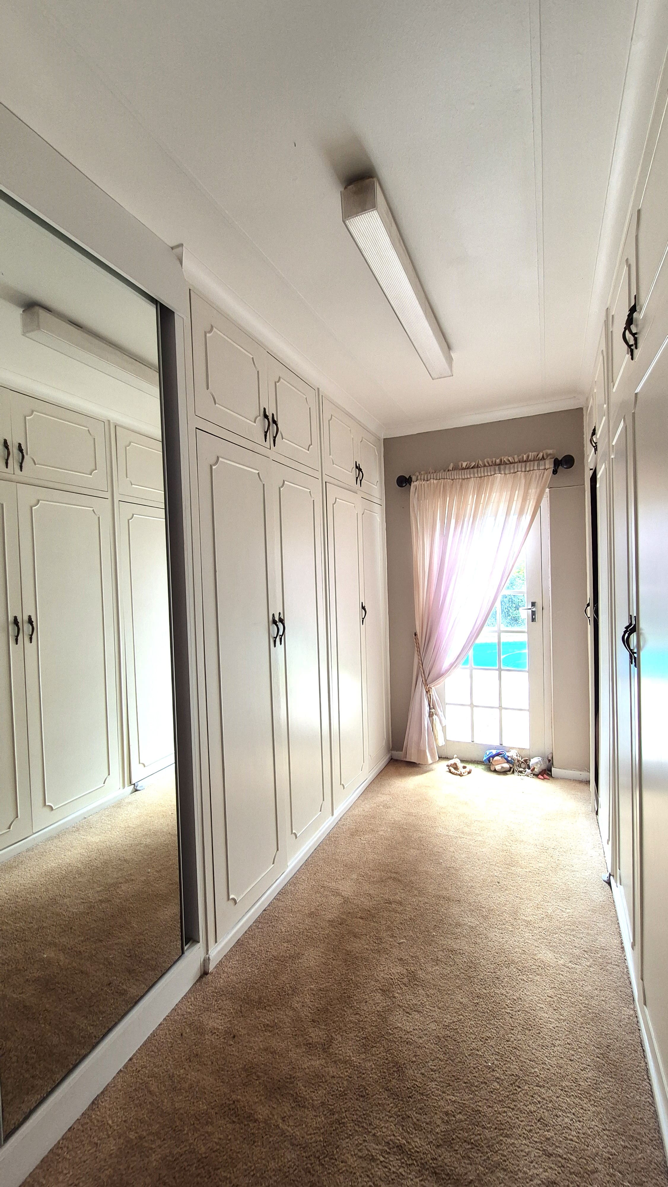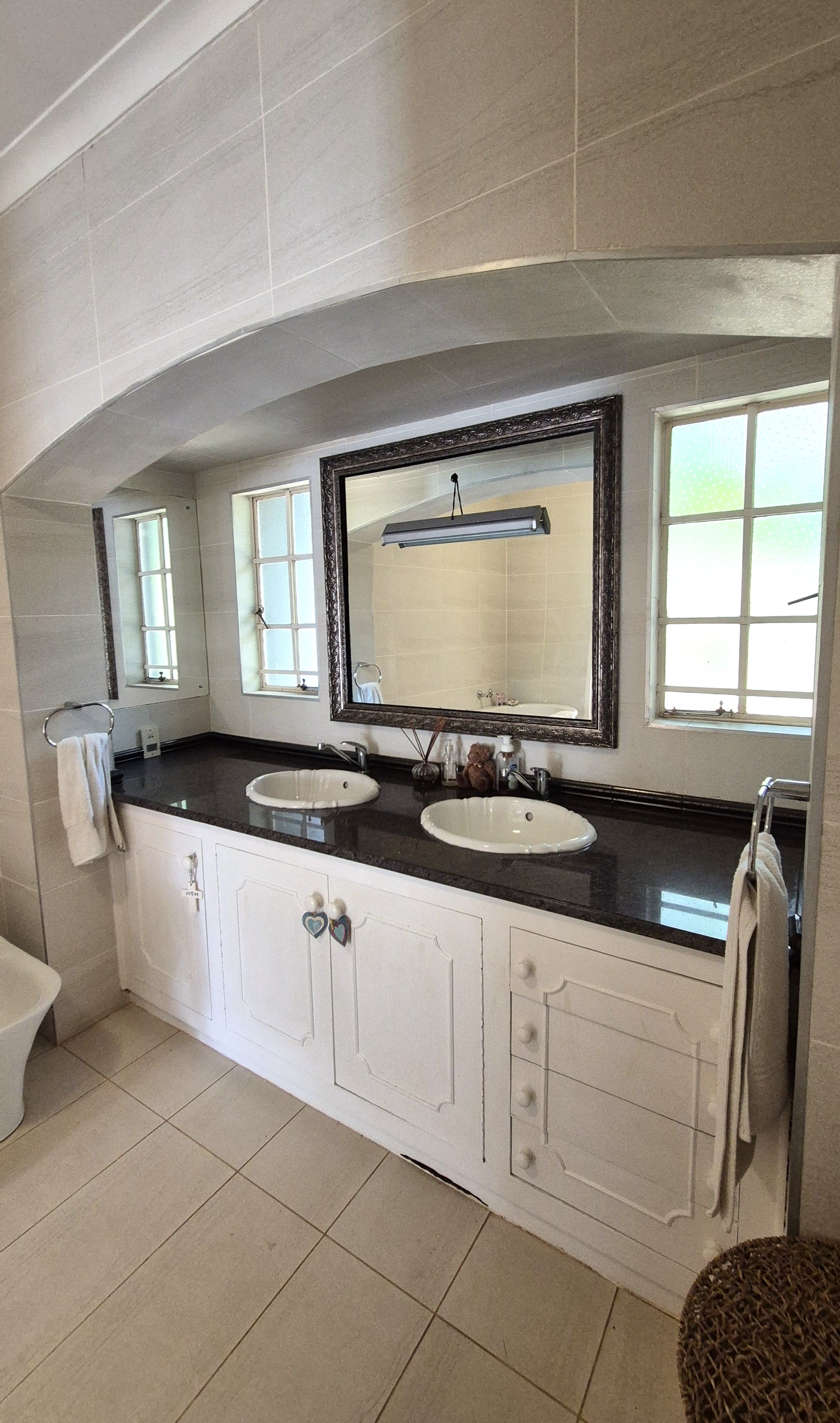 Accommodation is generous. There are four well-sized bedrooms, three of which open directly onto the veranda. Two bedrooms have en-suite bathrooms, while the main bedroom is a true retreat with a walk-in dressing room and elegant en-suite bathroom. A separate linen room in the passage adds useful storage space.