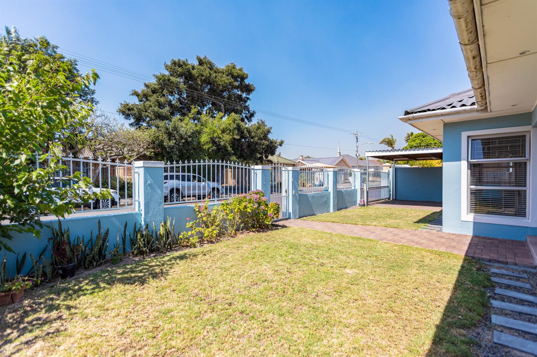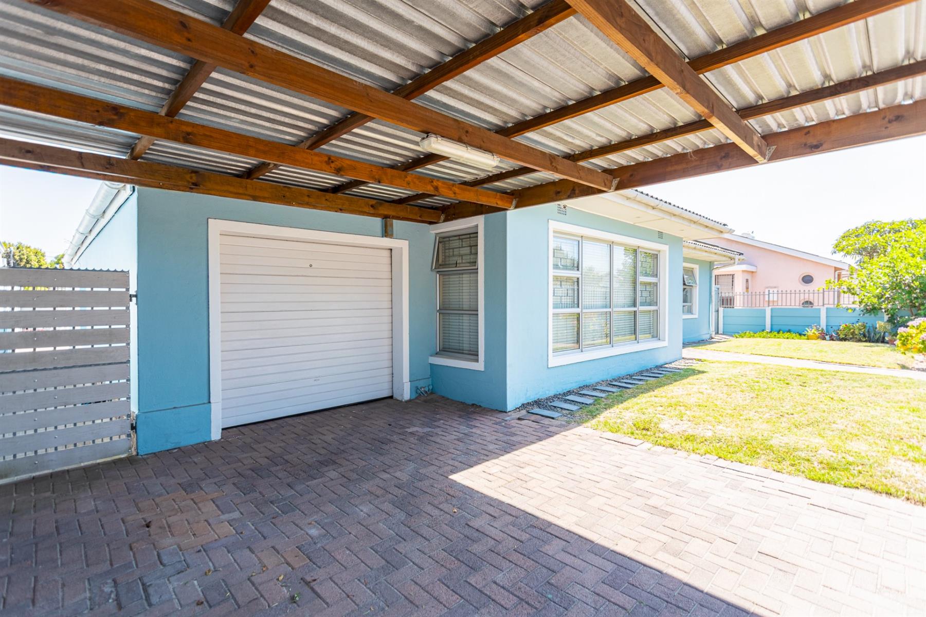The backyard features sparkling swimming pool with artificial grass surrounds for low maintenance. A shaded patio area provides the perfect spot for braai`s and relaxation.