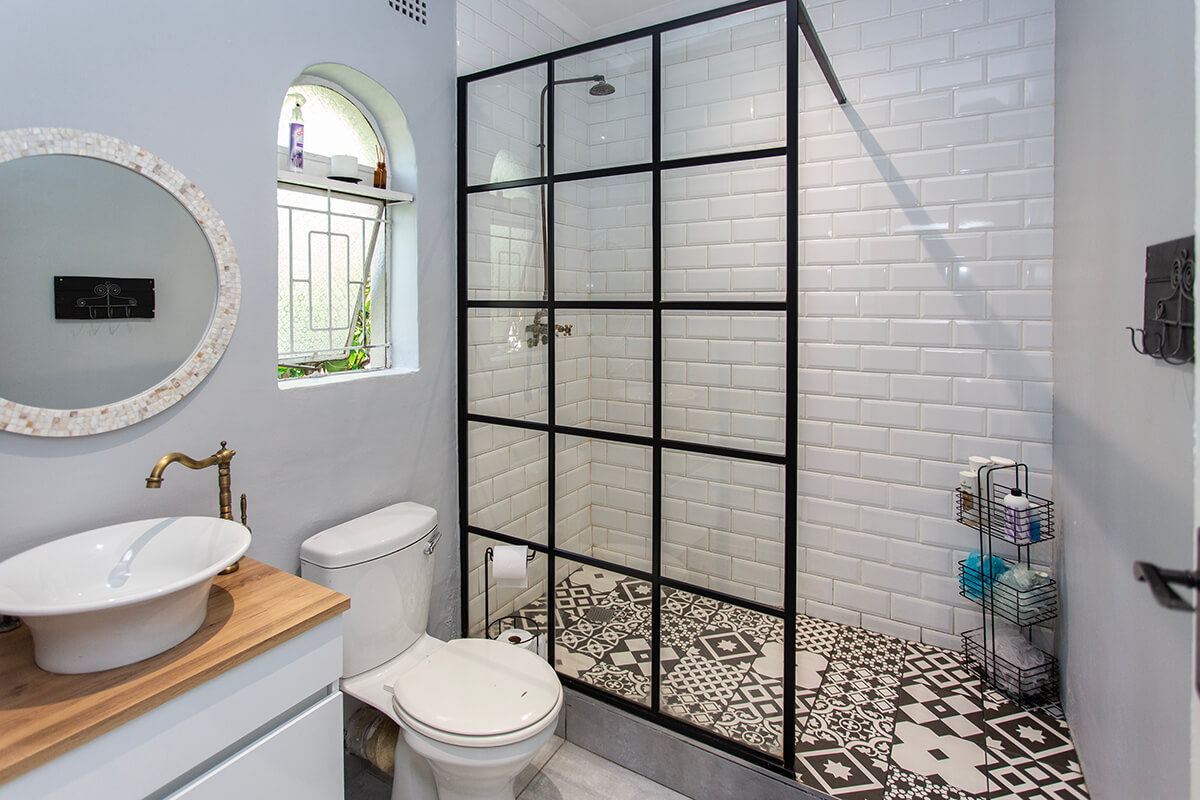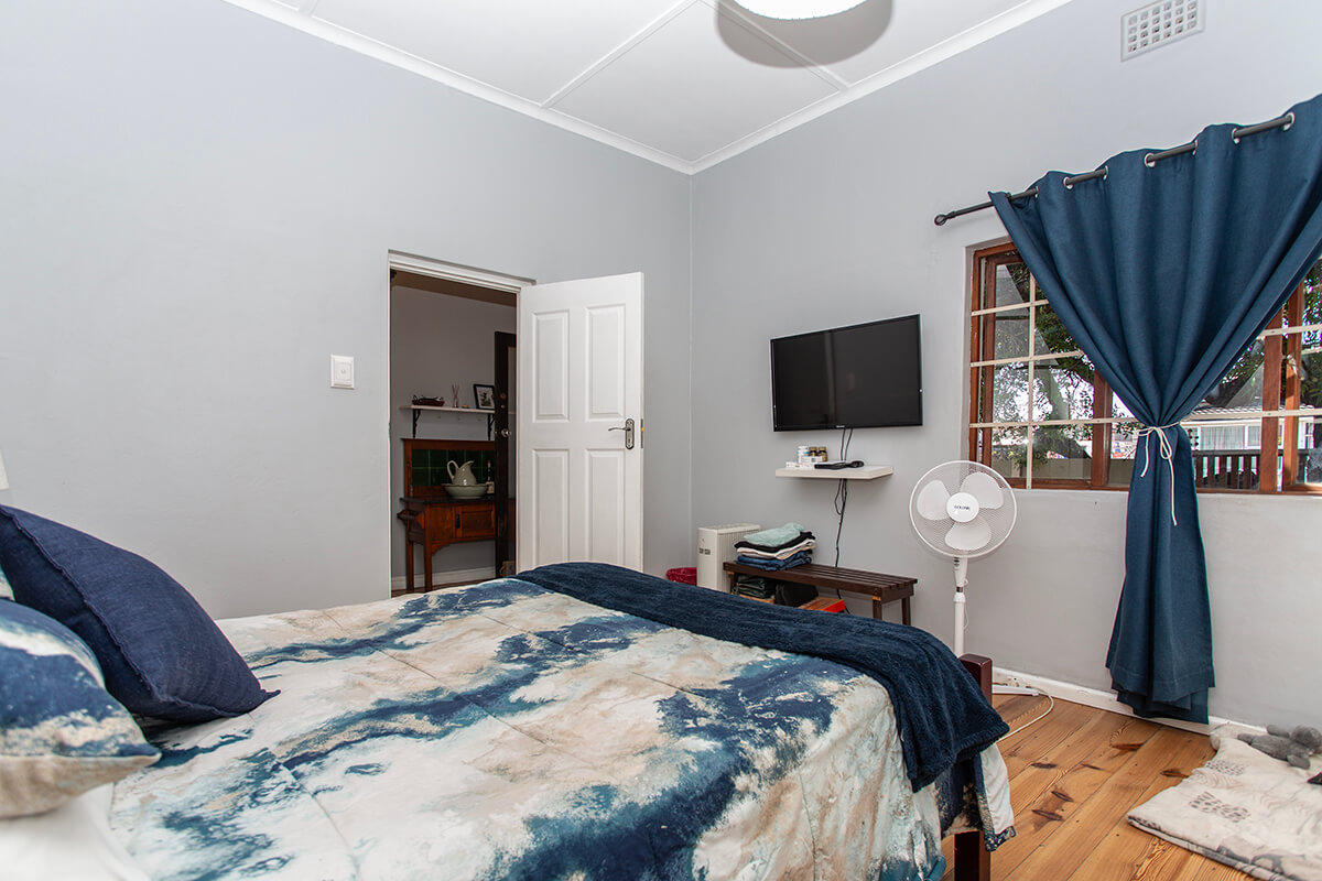 When it’s time to rest, you’ll find three snug bedrooms, each with warm wooden floors, curtain rails, and security in place. Two rooms include built-in cupboards. The master bedroom feels like your own private retreat, complete with a modern en suite. The guest bathroom shares that same touch of style: clean lines, modern fittings, a shower, wash basin and toilet. One of the bedrooms even boasts a TV point — perfect for drifting off to your favorite show. A ceiling fan in the master ensures cool comfort whenever you need it.