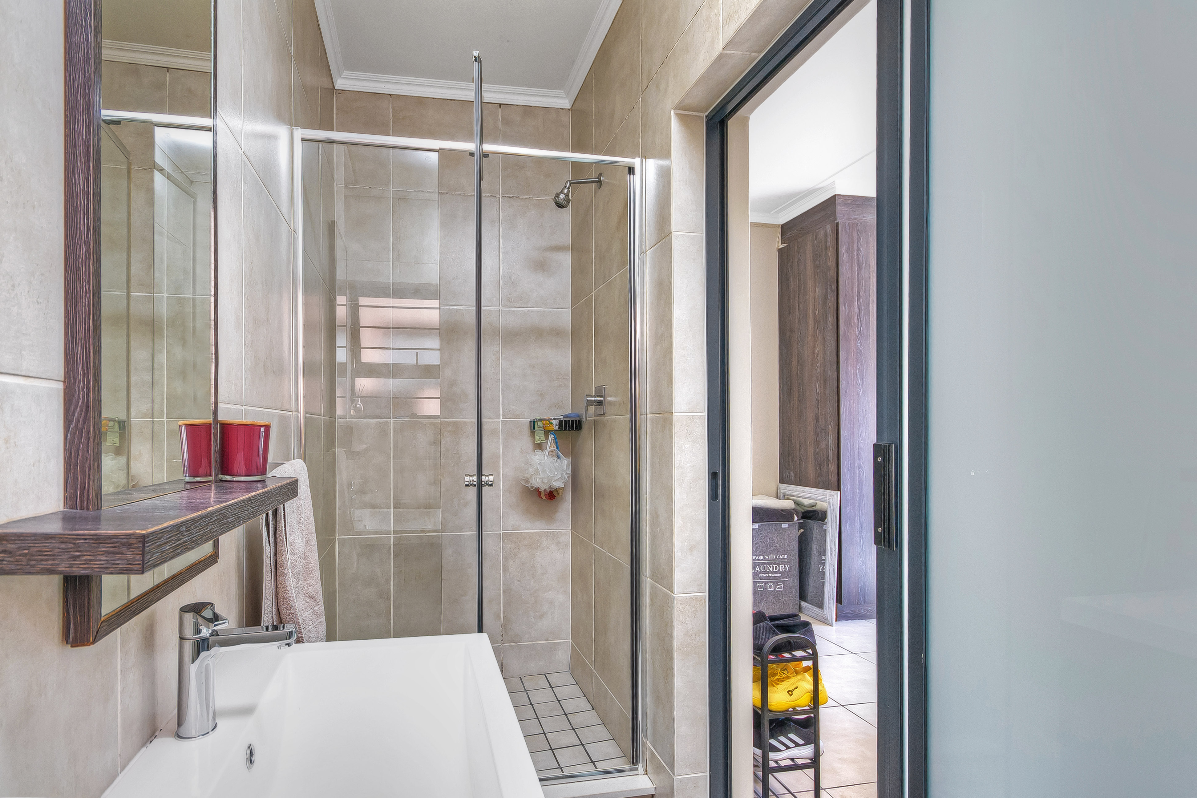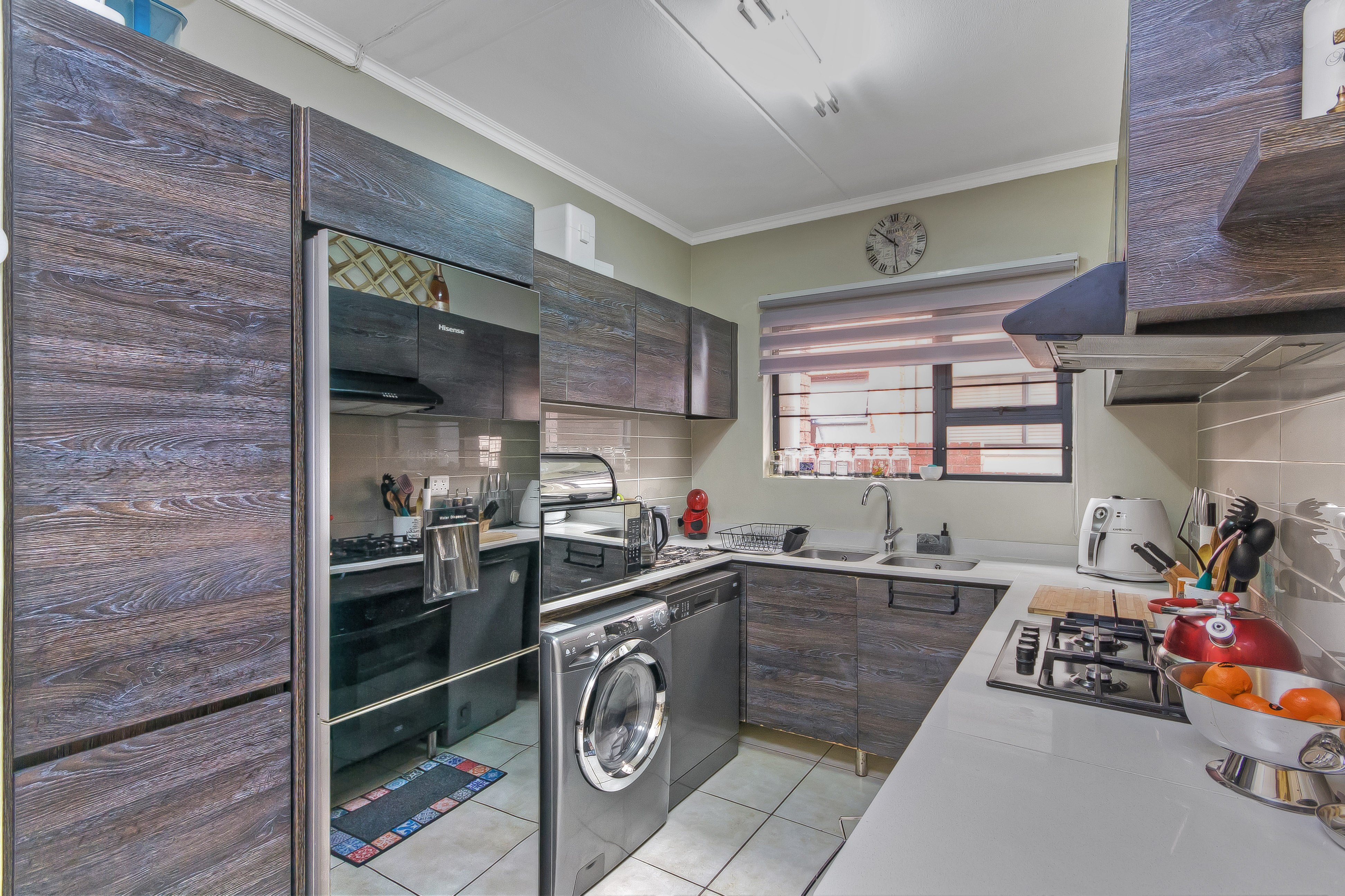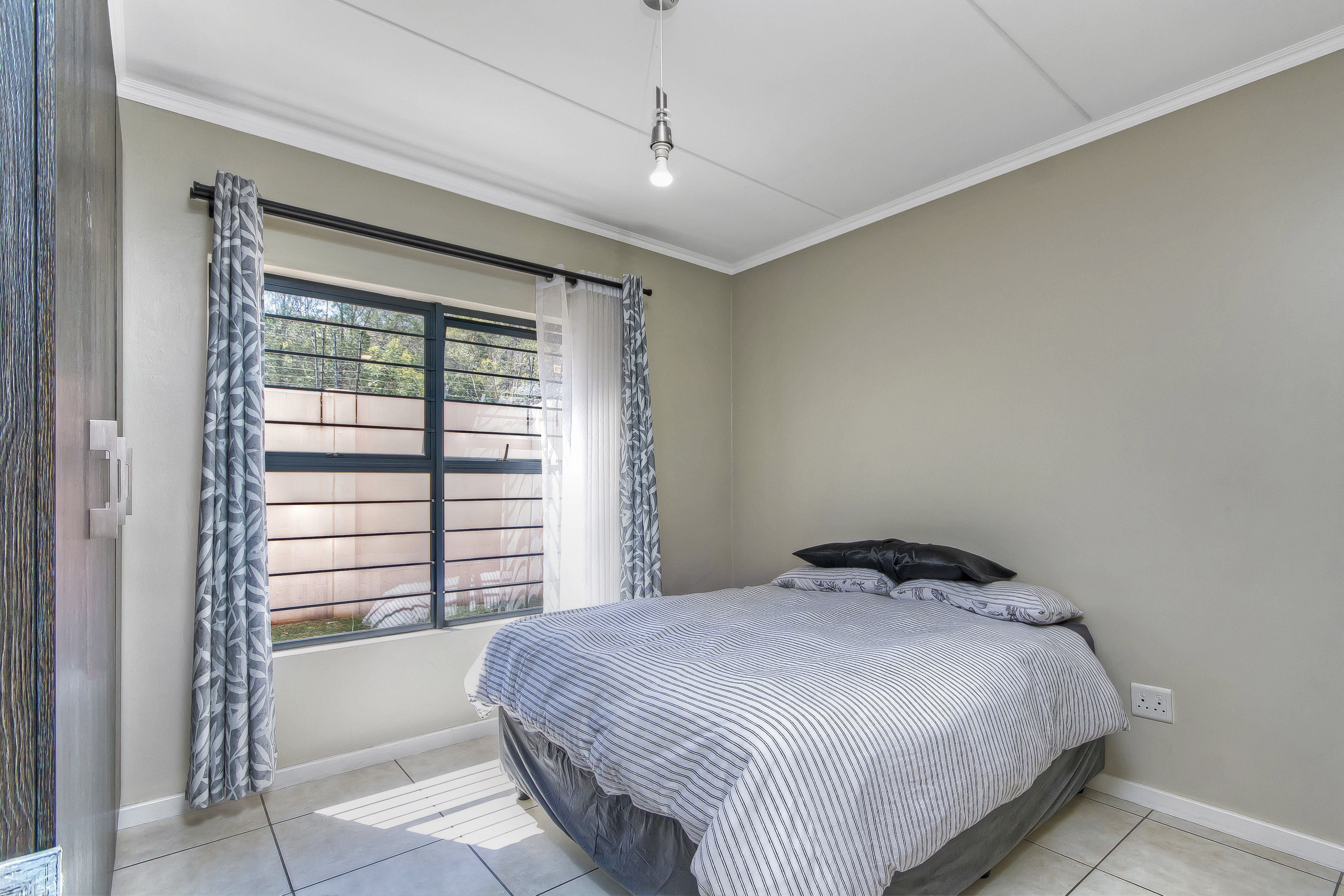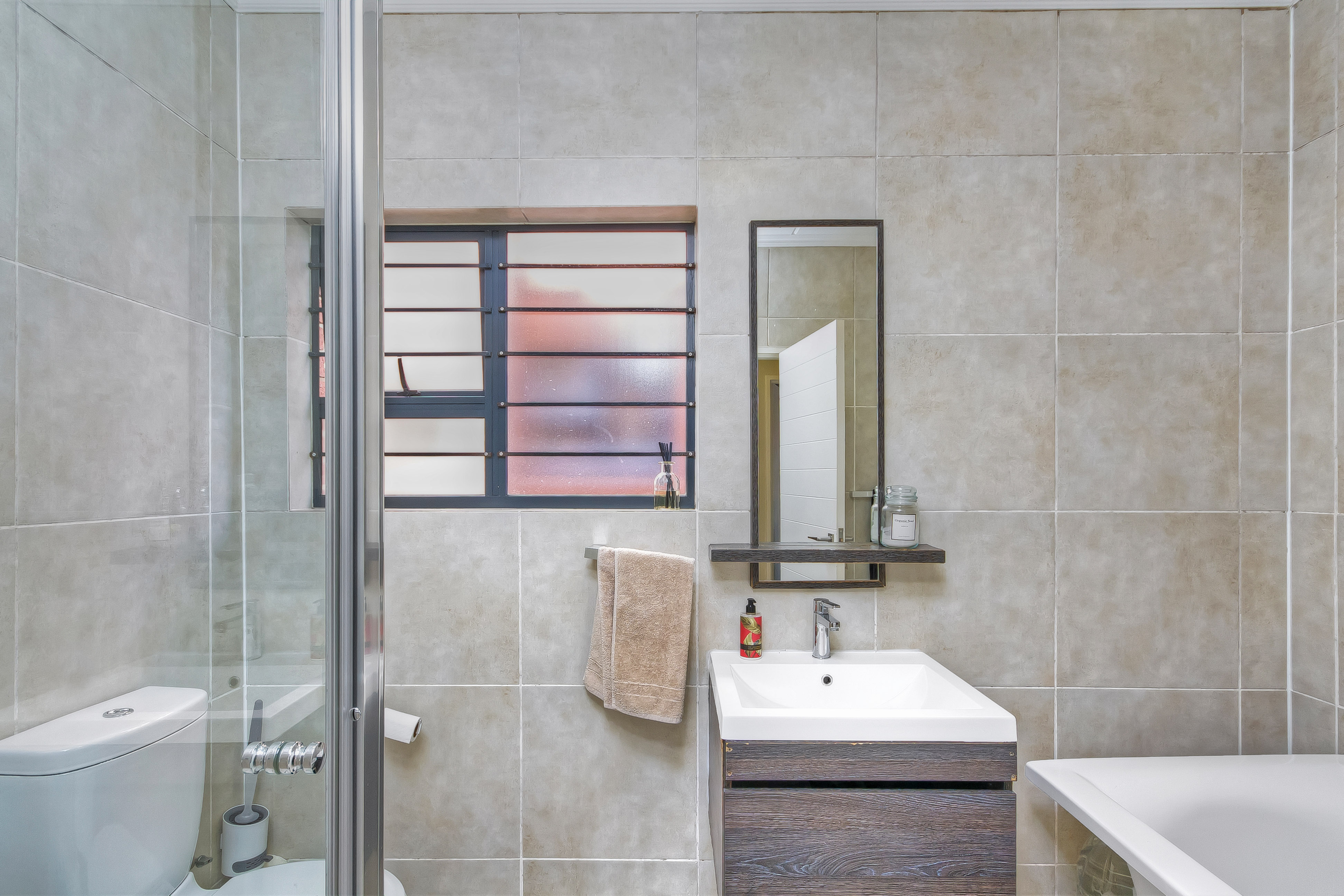 This is spacious and secure urban living; 3-bedroom sunny ground floor apartment. The property boasts an open plan living with clean lines, simplicity and bright space. The lounge overlooks a covered patio onto the fenced off large garden. The apartment has well-appointed kitchen with good size cupboards space and 3-under counter appliances, double sink and a gas hob. 3 well-sized bedrooms with high ceilings. The comfortable main bedroom with bathroom en-suite with shower. 2nd full-bathroom with free-standing bath tub.