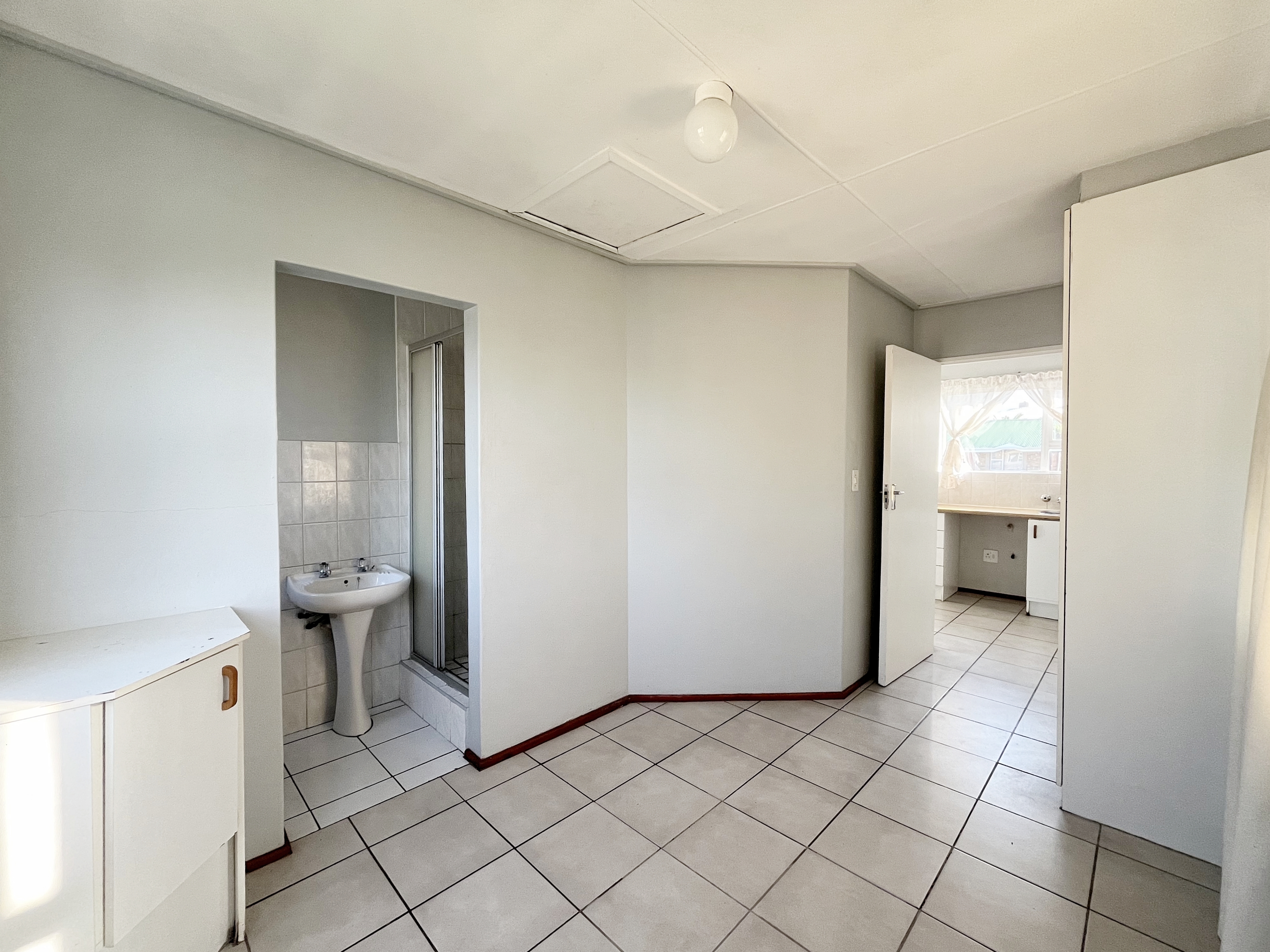 Offering an open plan lounge and kitchen area, one bedroom with built-in cupboards and an en-suite bathroom with a shower, toilet and basin.