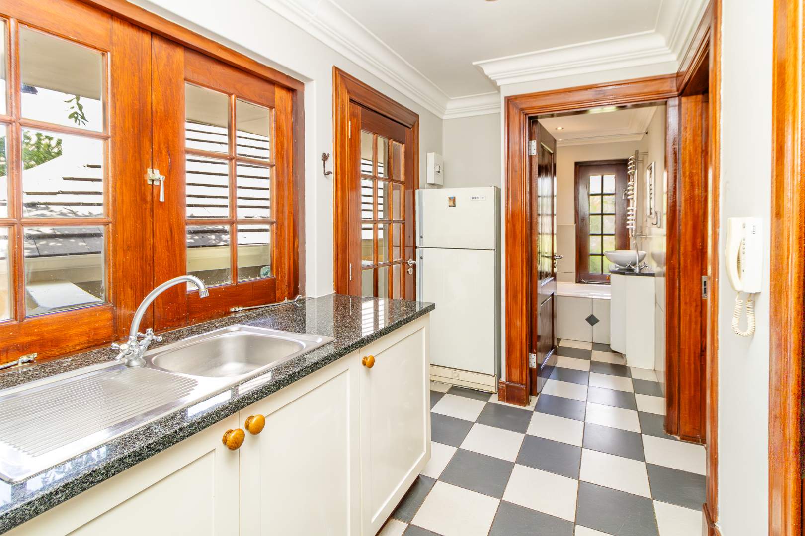 The light-filled, cosy kitchen overlooks the featured garden and comes fitted with a fridge. A washing machine is also included for added convenience.