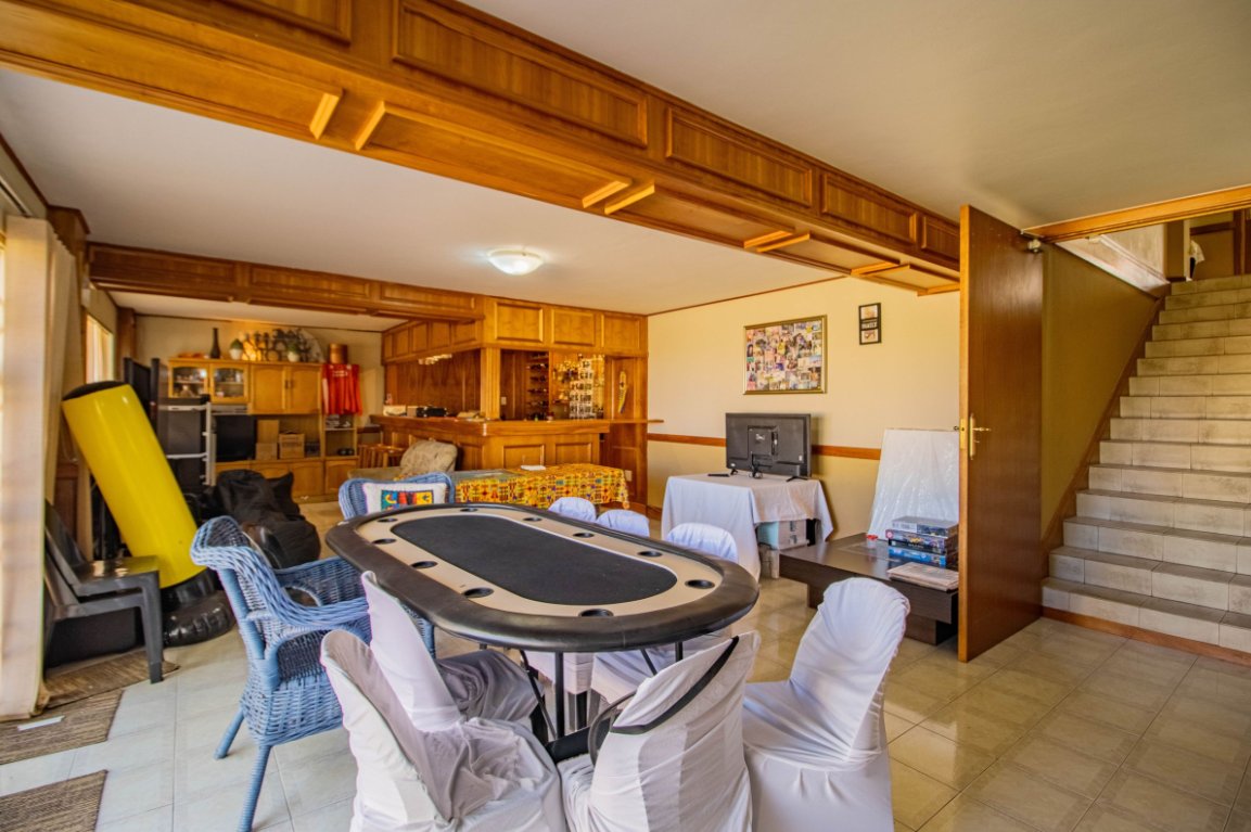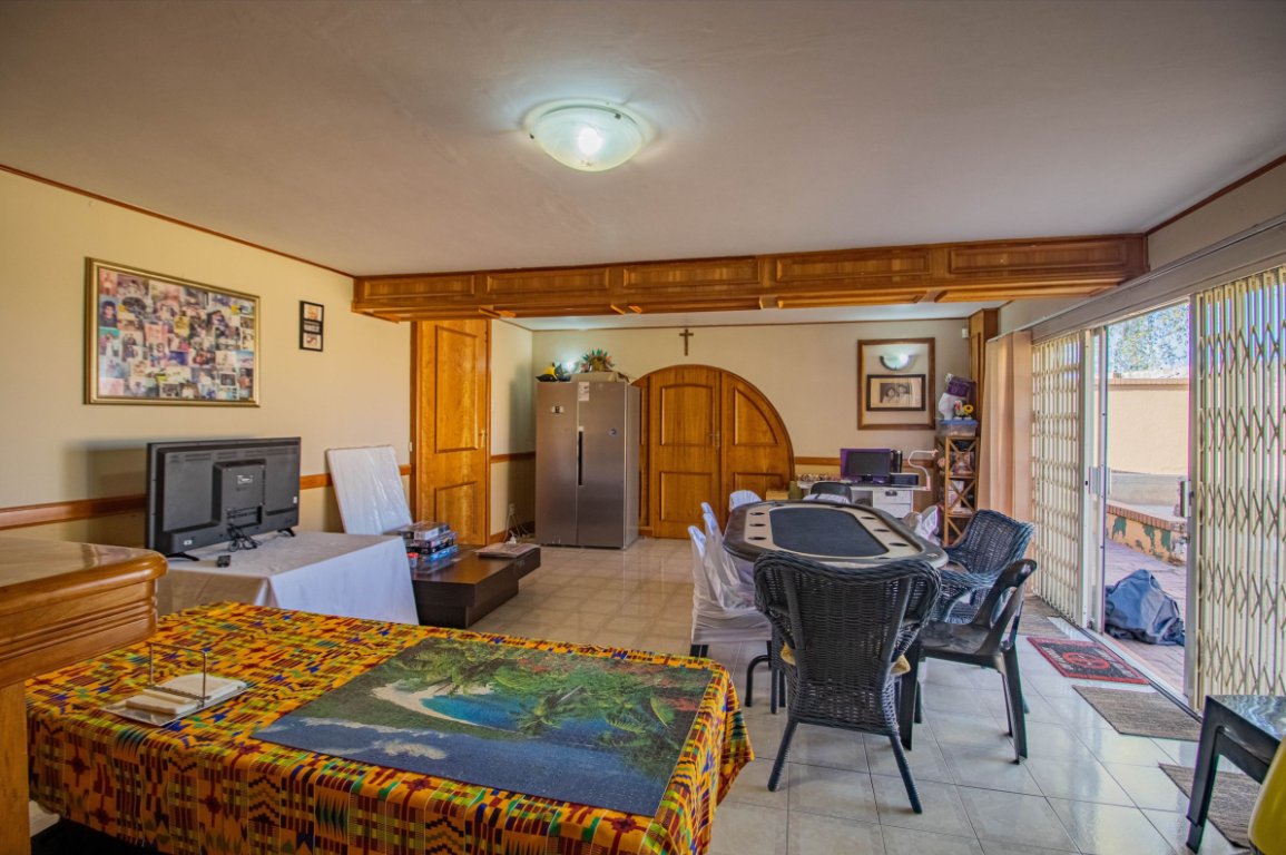There are 2 bathrooms (main en-suite), a guest toilet, and plenty of space throughout. Outdoor features include a built-in braai area, fire pit, and additional parking for guests. The home also boasts a double garage, staff quarters, and a pub for entertaining.