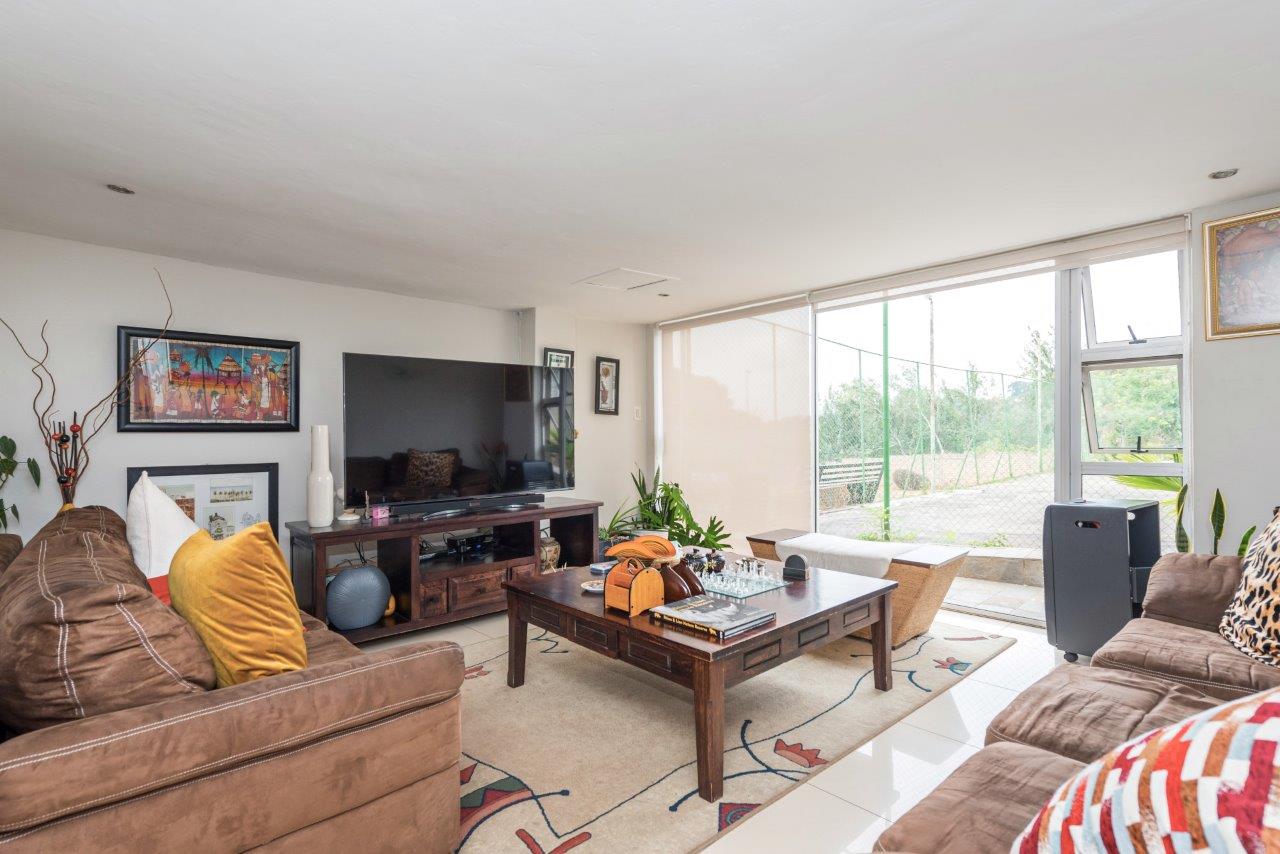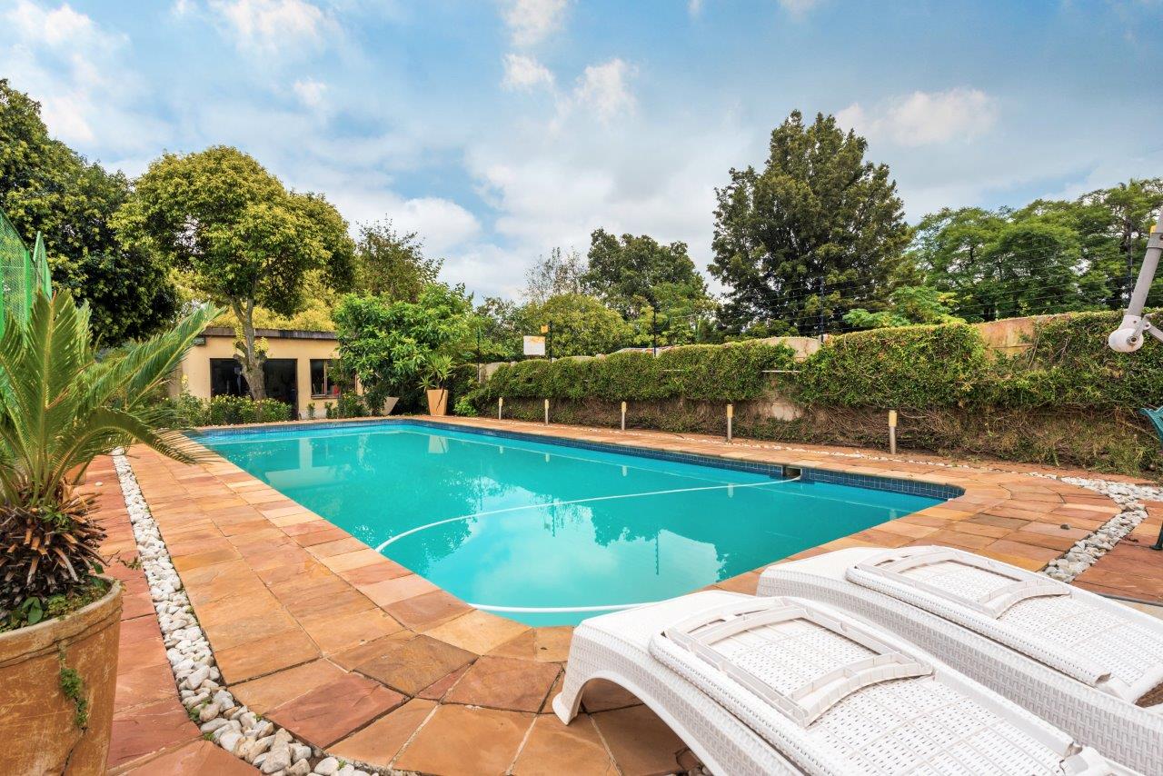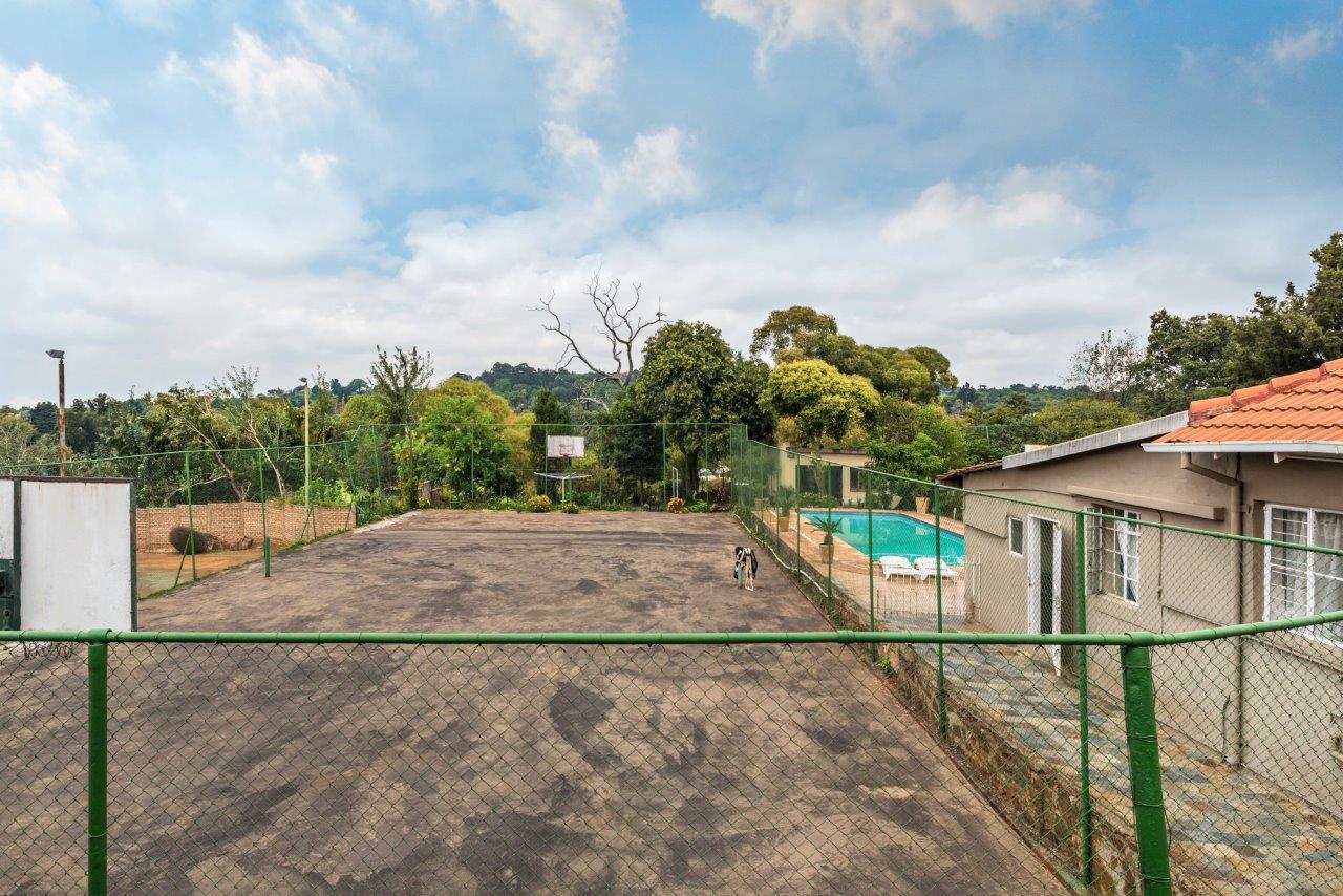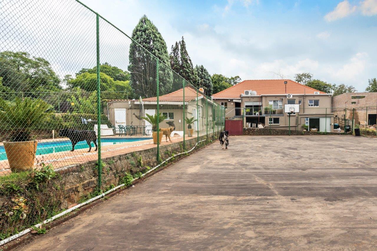 Leisure facilities include a sparkling swimming pool, private tennis court, and a basketball court, all within a secure boomed area. Practical extras include staff accommodation with bathroom and laundry, a single garage, double carport, and generous parking space. Security is comprehensive with an alarm system, outside beams, electric fencing, CCTV cameras, aluminum window frames, and a standby generator.