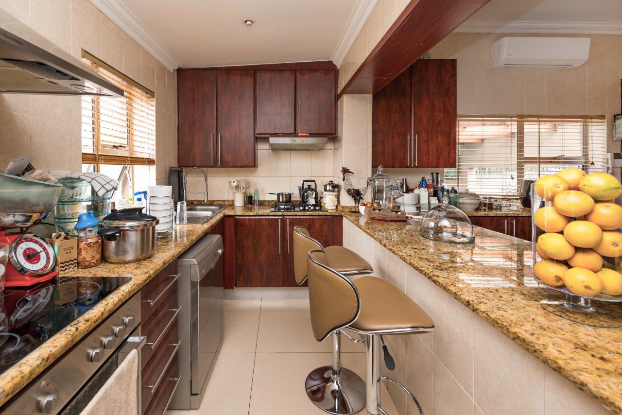 Boasting a stylish modern interior, this home welcomes you with a tiled entrance hall leading to the dining room, formal lounge, and private study. The family room, complete with a built-in bar, opens onto a balcony with serene views overlooking the golf course and the tennis court. A fully fitted gourmet eat-in kitchen features sleek granite countertops, a gas hob with municipal supply, an additional glass hob, and under-counter appliances.