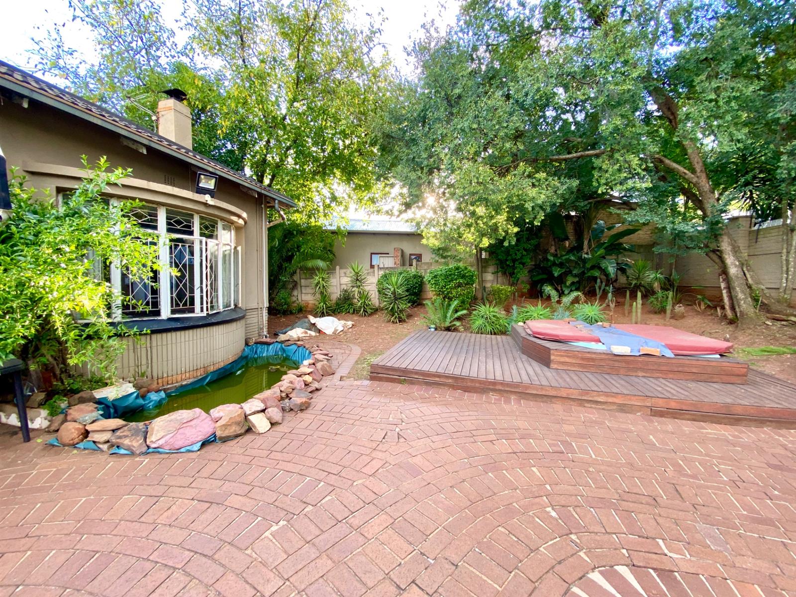 The front of the house has a garden area with a pool and a fish pond with fish in it. The back area is the parking area big enough to park 6 cars comfortably.
