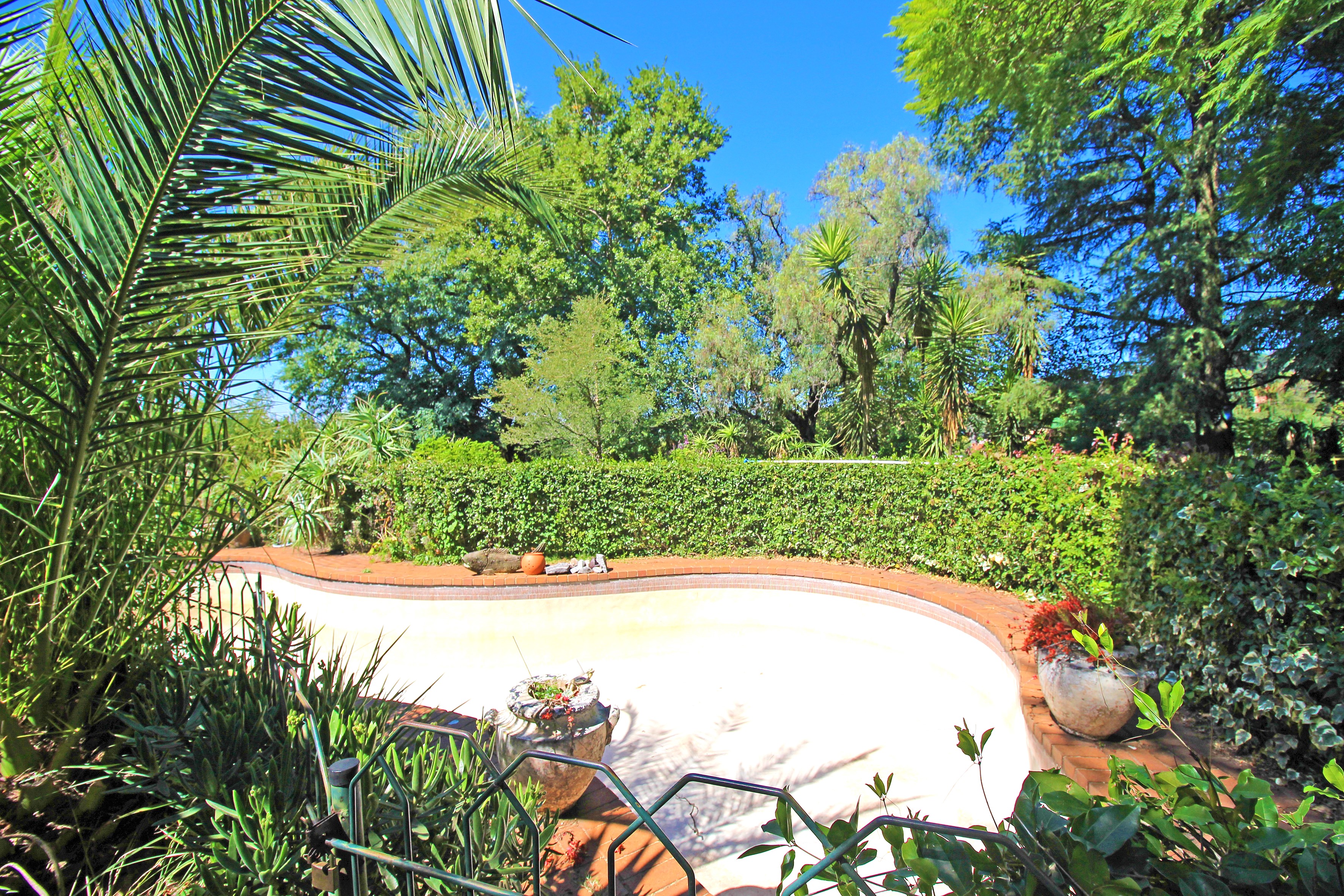 As you enter the front door, you are welcomed by lots of different plant and a patio will a wooden table. The lounge has a fireplace and stretches to the dining area which overlooks a beautiful garden with perennials and a swimming pool. A kitchen uses a gas stove and leads to a walk-in pantry. A door from the kitchen leads to a courtyard with washing lines. A room leads from the lounge and can be used as an office/study.