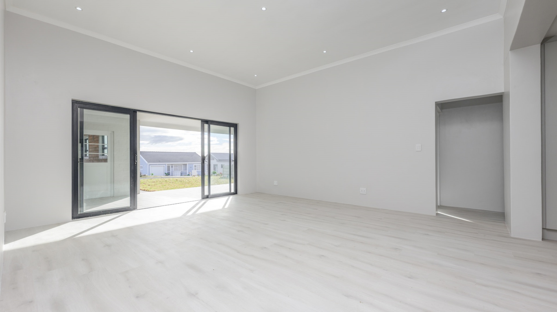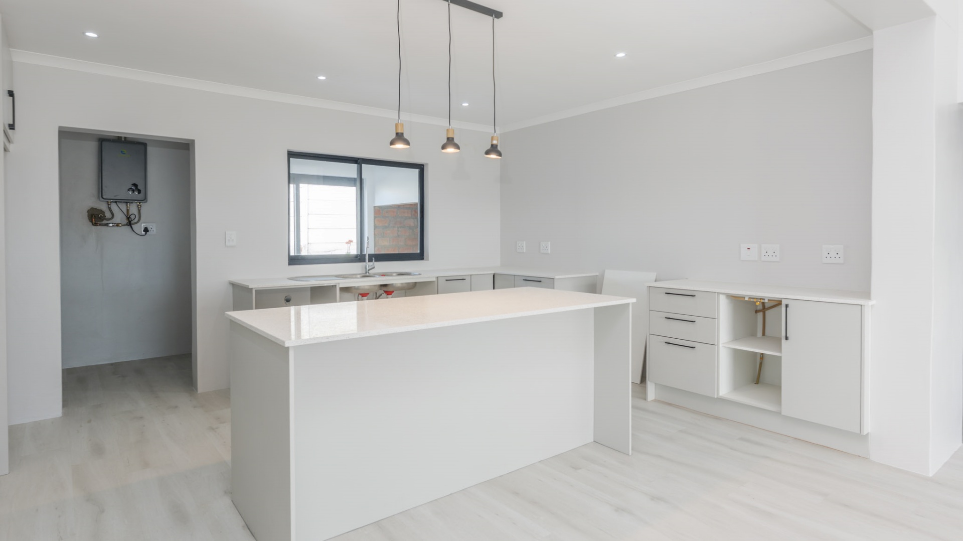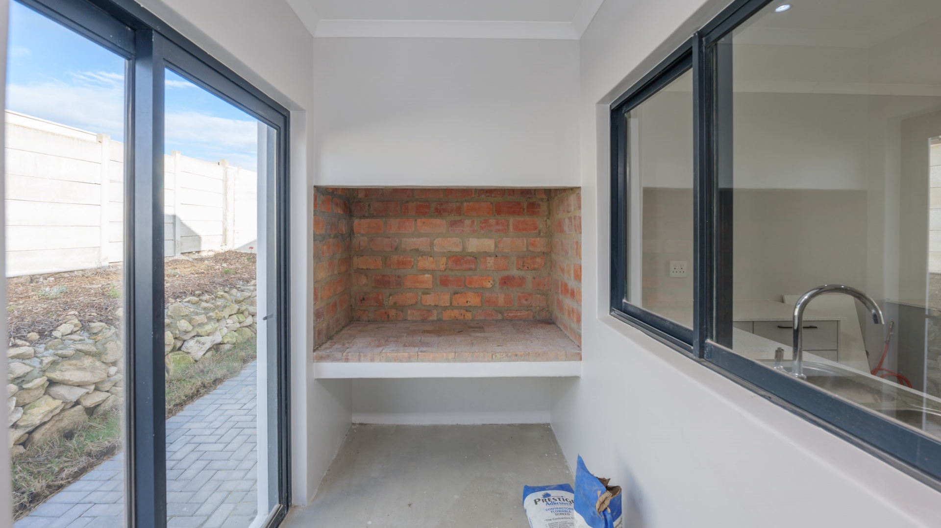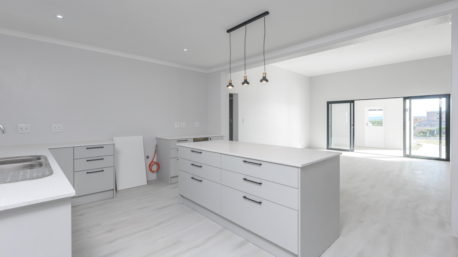 The finishes include Vinyl flooring, Hansgrohe taps and mixers, a super spacious covered braai area, 4 bedrooms, 3 bathrooms, and a double garage. The kitchen is fitted with Caesarstone Tops and Folkstone Grey Melamine Cupboards.